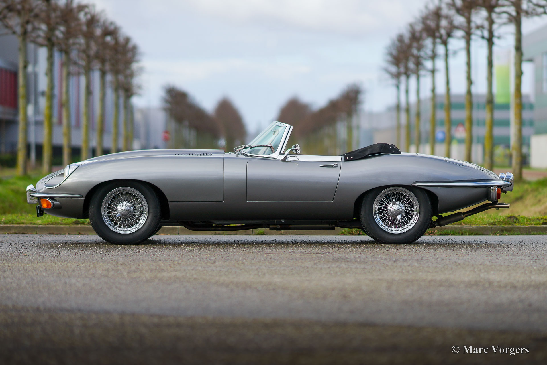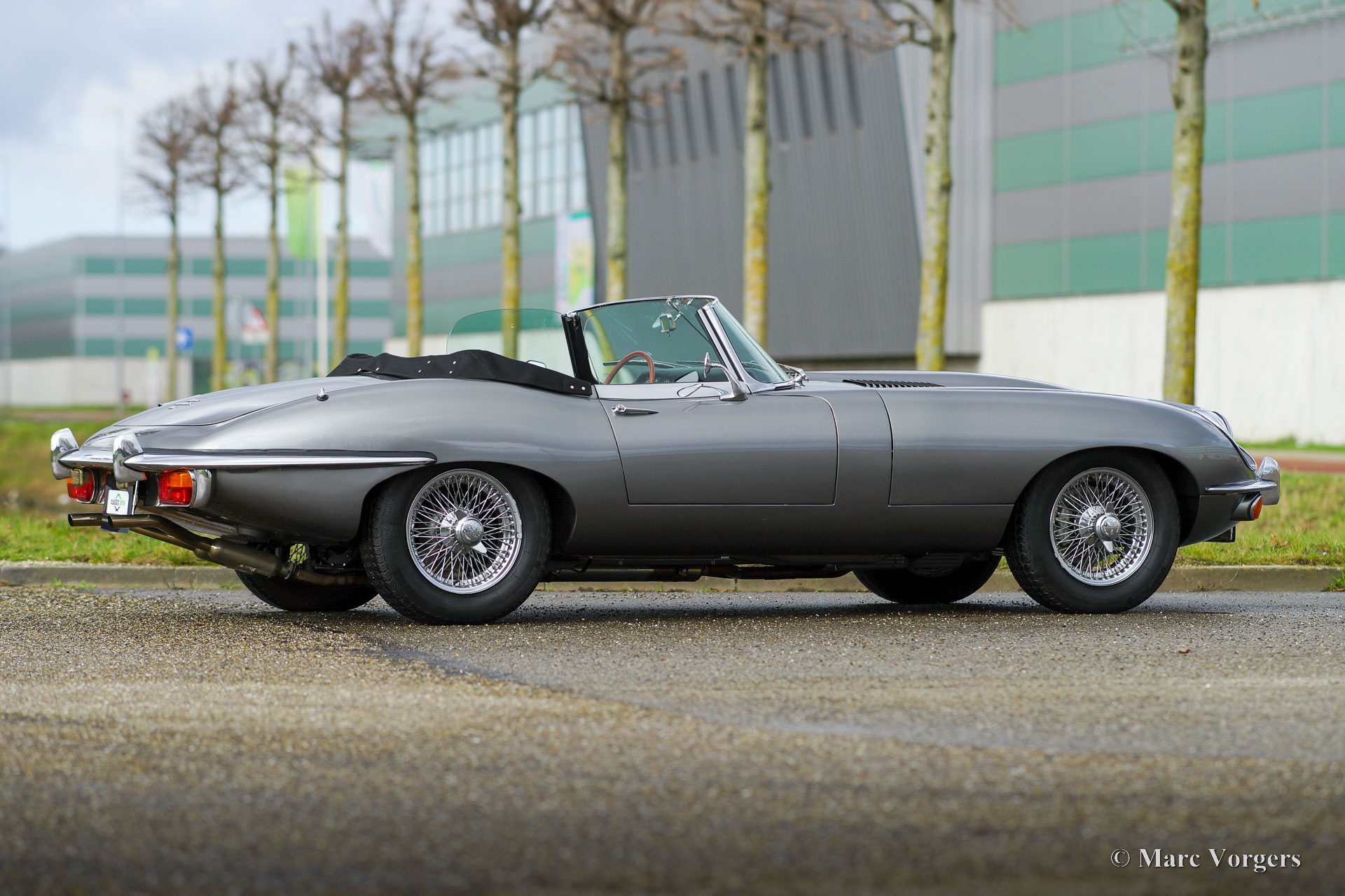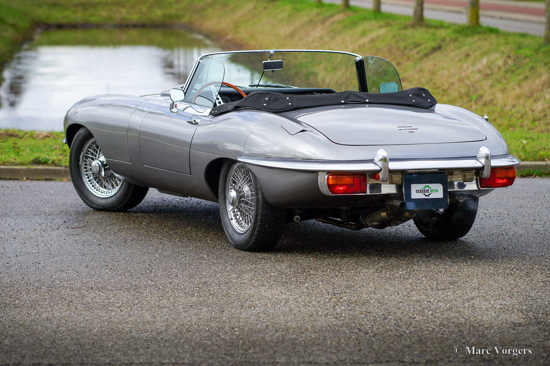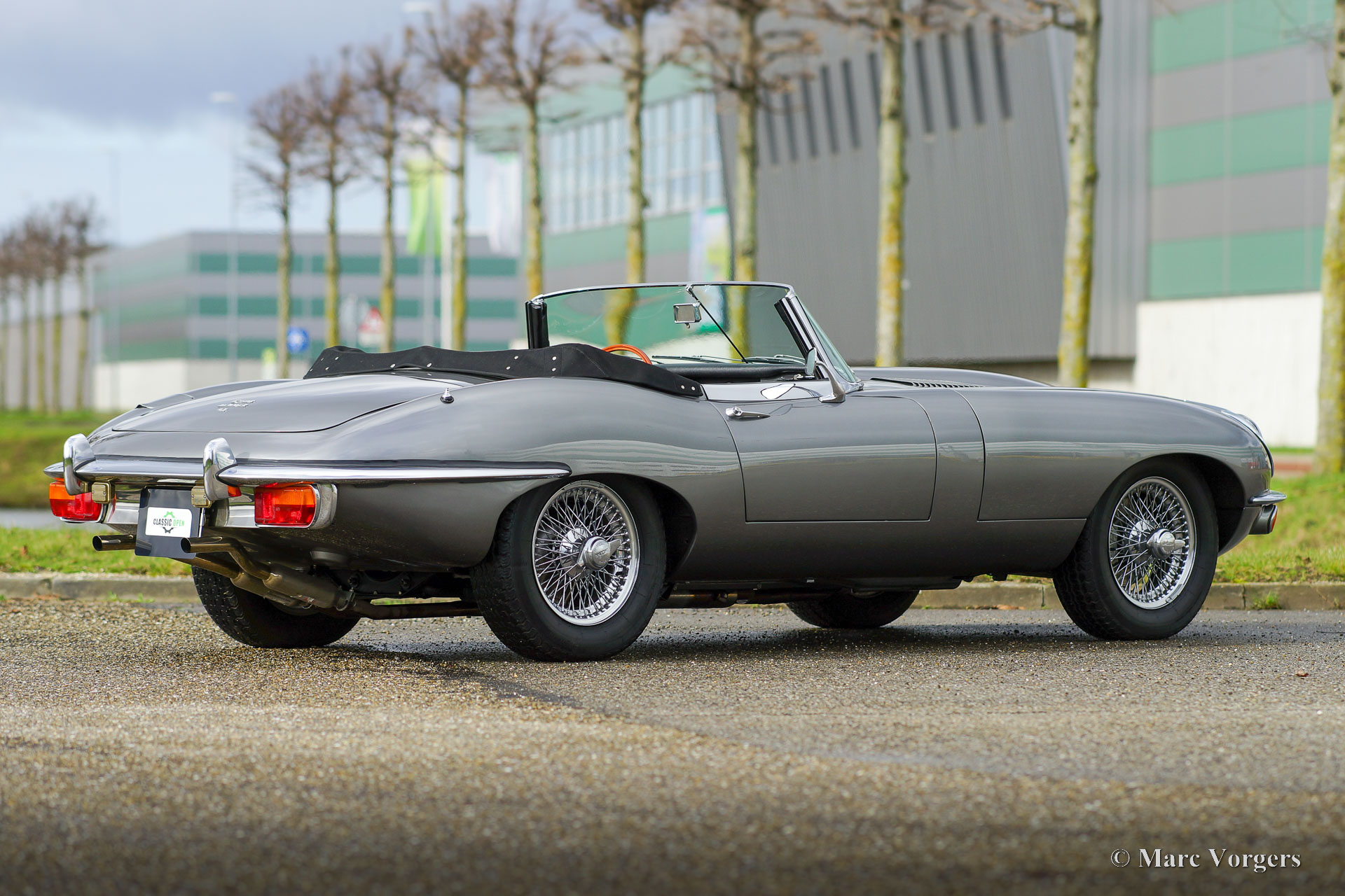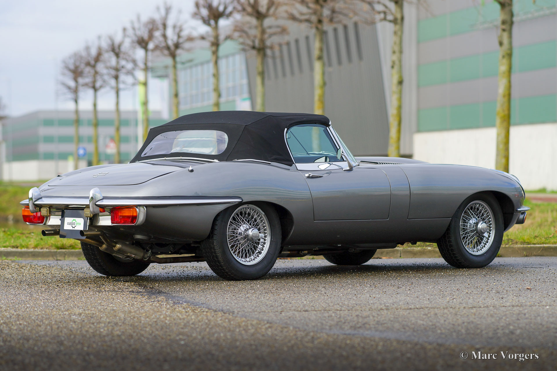 Jaguar E-type 4,2 litres OTS (Open Two-Seater), année 1970. Couleur gris métallisé (Gunmetal grey) combinée à un intérieur en cuir noir et un tapis noir. Capote et housse de capote en mohair noir. Cette magnifique Jaguar E-type a été vendue neuve à New York, aux États-Unis. Aux États-Unis, le E-type est également connu sous le nom de XK-E et le biplace ouvert (OTS) est connu sous le nom de « roadster ». Cette magnifique Jaguar E-Type fut restaurée détaillée dans le passé, le travail fut effectué selon les spécifications d'origine de l'usine. Un important dossier historique/restauration est présent avec un reportage photo de restauration complet et des factures confirmant la qualité de la restauration. La voiture fut importée aux Pays-Bas en 2014 et elle fut achetée par le propriétaire actuel en 2019. Cette Jaguar de E-type roule et se manie parfaitement, et la voiture est dans un état très bon à excellent ! Cette Jaguar E-type est une voiture à numéros concordants, un certificat « Heritage » est présent confirmant que des composants importants comme le moteur et la boîte de vitesses sont d'origine pour cette voiture. En 2021, la voiture a reçu un rapport de pont arrière plus élevé (spécification européenne) qui a réduit les révolutions du moteur à tous des vitesses de conduite d'environ 10%. Le puissant moteur six cylindres de 4,2 litres entraîne les roues arrière via une boîte de vitesses manuelle à 4 rapports. Cette merveilleuse Jaguar E-Type est une voiture magnifiquement restaurée et une voiture de conducteur fantastique, une excellente trouvaille pour les passionnés de Jaguar !