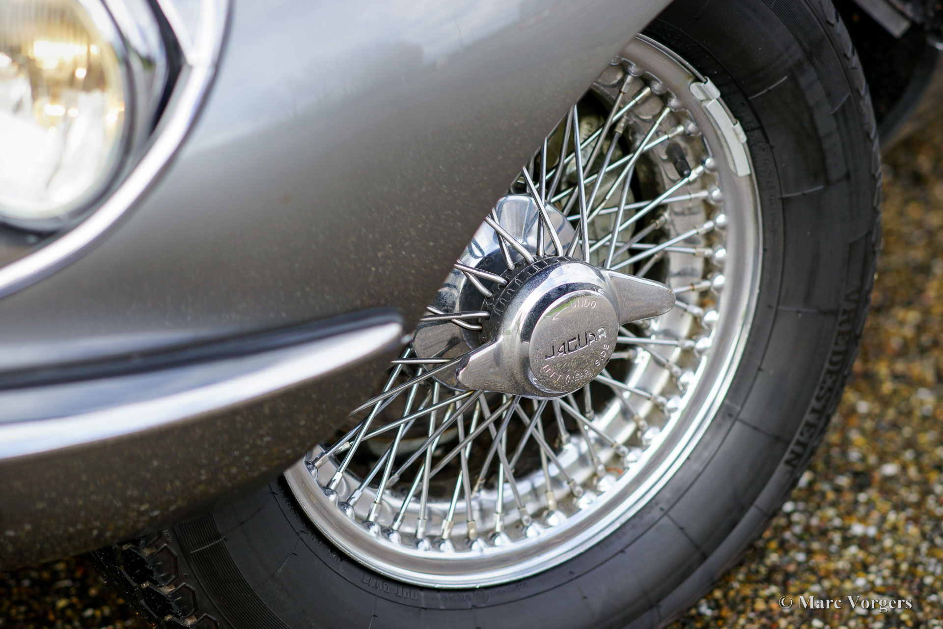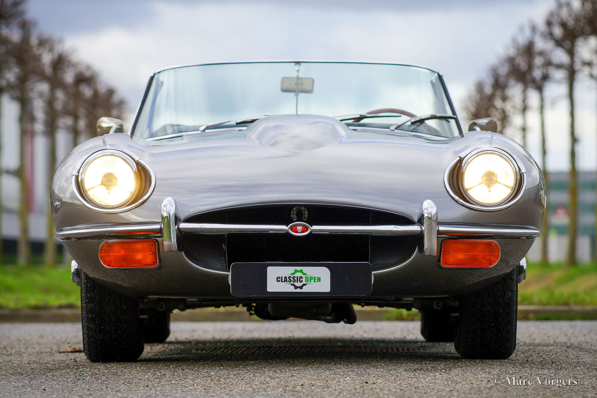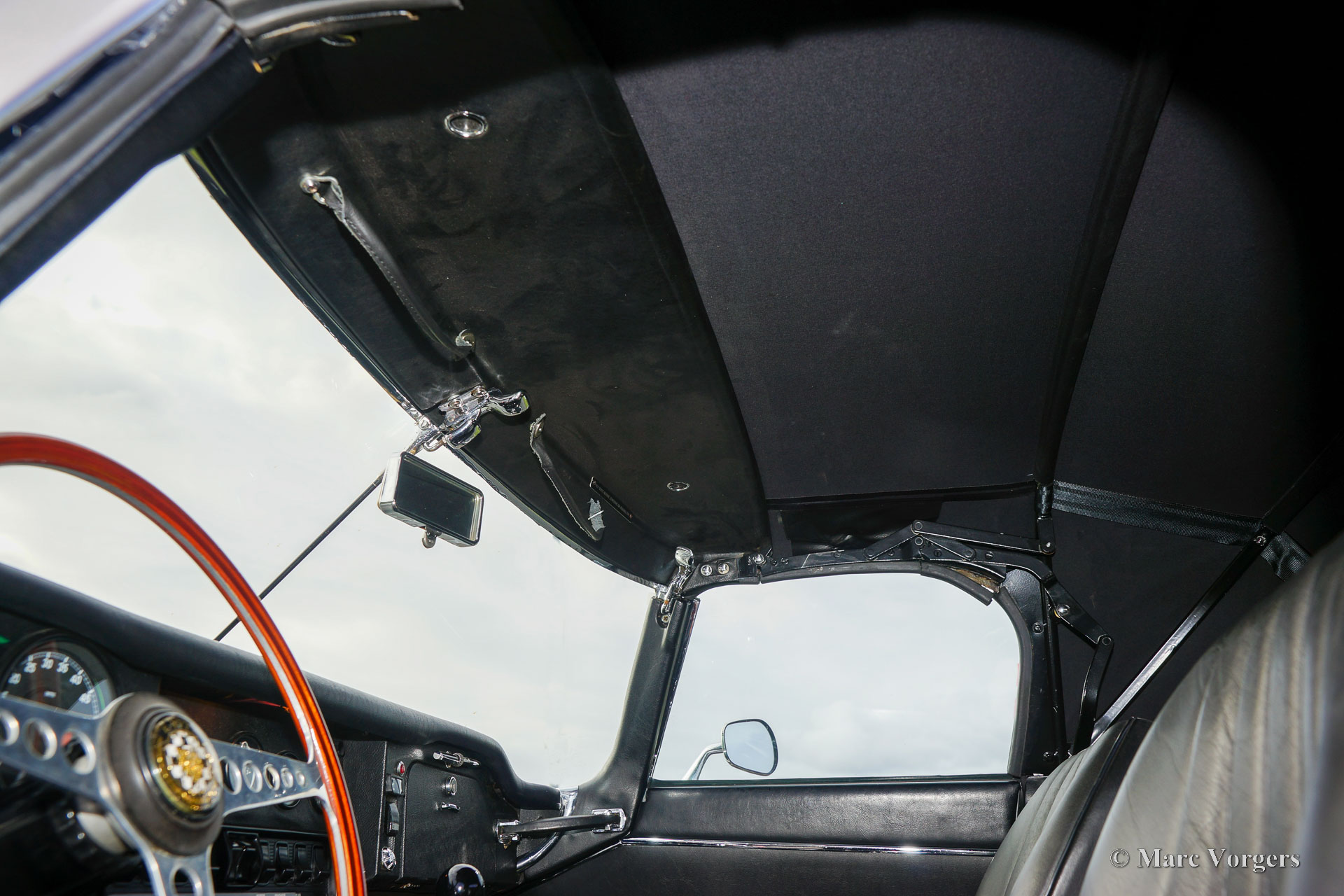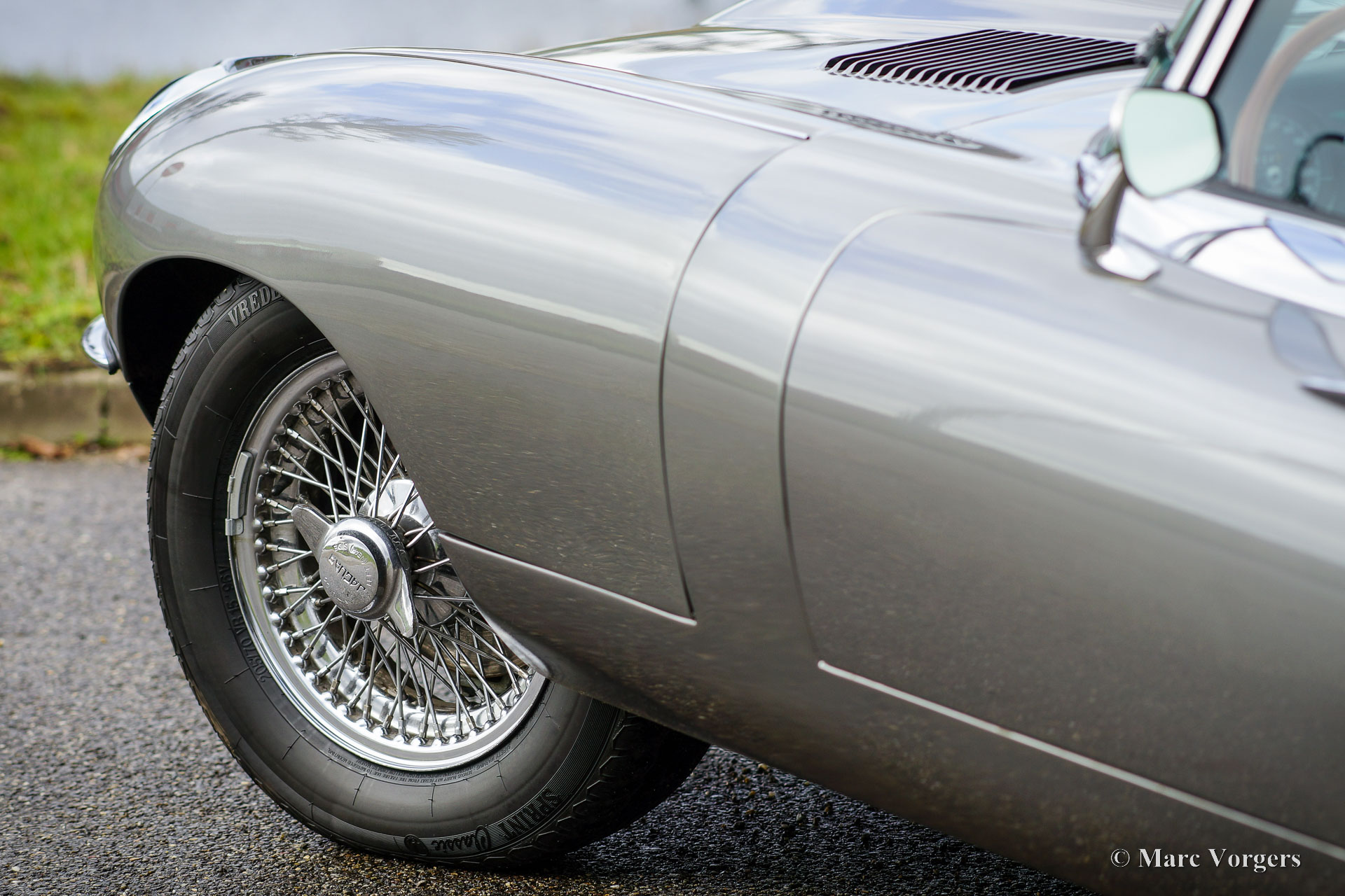 Jaguar E-type 4,2 litres OTS (Open Two-Seater), année 1970. Couleur gris métallisé (Gunmetal grey) combinée à un intérieur en cuir noir et un tapis noir. Capote et housse de capote en mohair noir. Cette magnifique Jaguar E-type a été vendue neuve à New York, aux États-Unis. Aux États-Unis, le E-type est également connu sous le nom de XK-E et le biplace ouvert (OTS) est connu sous le nom de « roadster ». Cette magnifique Jaguar E-Type fut restaurée détaillée dans le passé, le travail fut effectué selon les spécifications d'origine de l'usine. Un important dossier historique/restauration est présent avec un reportage photo de restauration complet et des factures confirmant la qualité de la restauration. La voiture fut importée aux Pays-Bas en 2014 et elle fut achetée par le propriétaire actuel en 2019. Cette Jaguar de E-type roule et se manie parfaitement, et la voiture est dans un état très bon à excellent ! Cette Jaguar E-type est une voiture à numéros concordants, un certificat « Heritage » est présent confirmant que des composants importants comme le moteur et la boîte de vitesses sont d'origine pour cette voiture. En 2021, la voiture a reçu un rapport de pont arrière plus élevé (spécification européenne) qui a réduit les révolutions du moteur à tous des vitesses de conduite d'environ 10%. Le puissant moteur six cylindres de 4,2 litres entraîne les roues arrière via une boîte de vitesses manuelle à 4 rapports. Cette merveilleuse Jaguar E-Type est une voiture magnifiquement restaurée et une voiture de conducteur fantastique, une excellente trouvaille pour les passionnés de Jaguar !