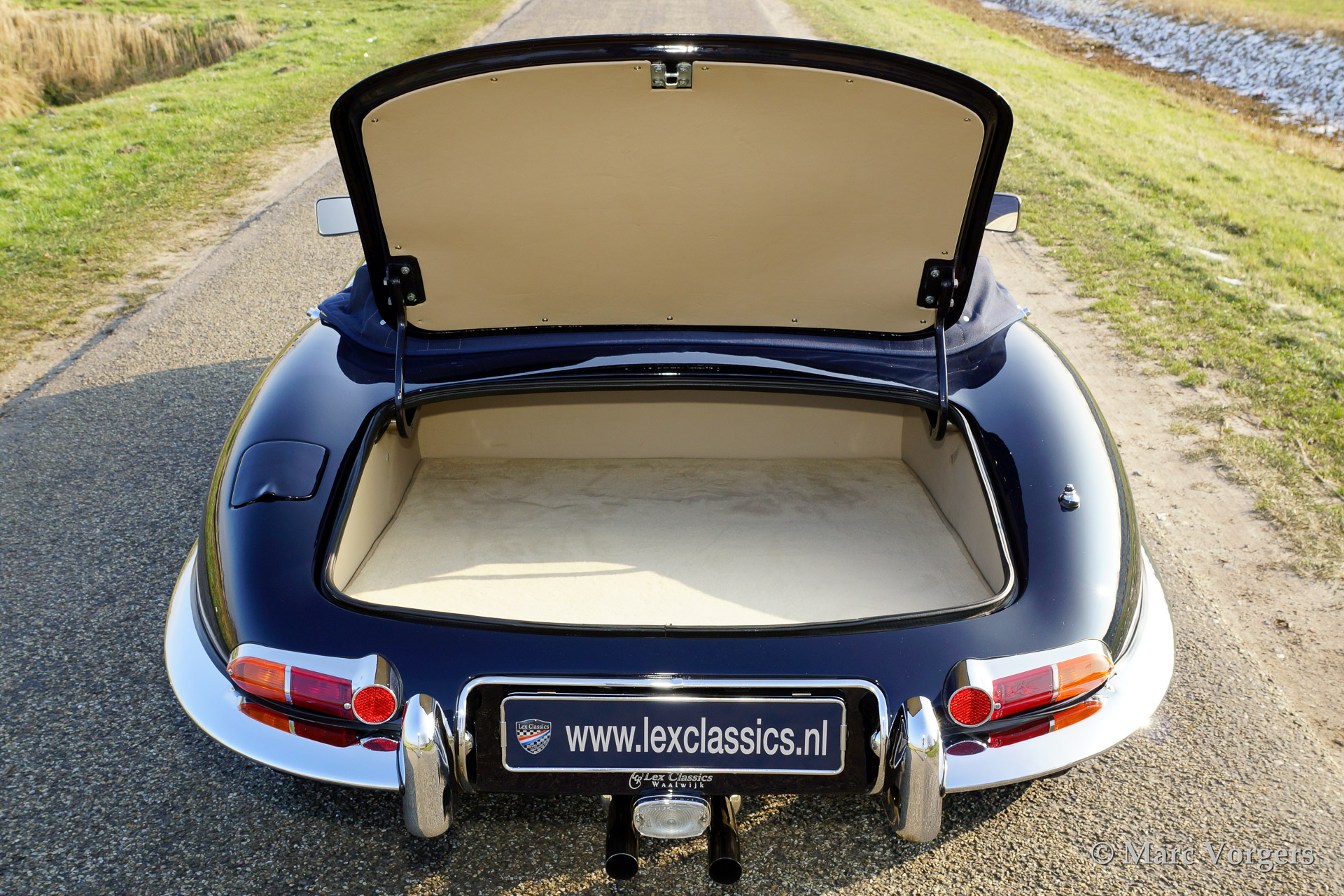 Jaguar E-type 4.2 Litre OTS (roadster) series 1, year 1965. Colour Royal blue with a tan (beige) leather interior. Blue mohair hood and hood cover. This magnificent E-Type was extensively restored in the years 2005/2006. The car features a 5-speed manual Getrag gearbox (modification), a modern type AC generator, electronic ignition, wide chrome wire wheels, power steering, wooden dashboard, Becker radio with satellite navigation and a steering wheel with wood rim.