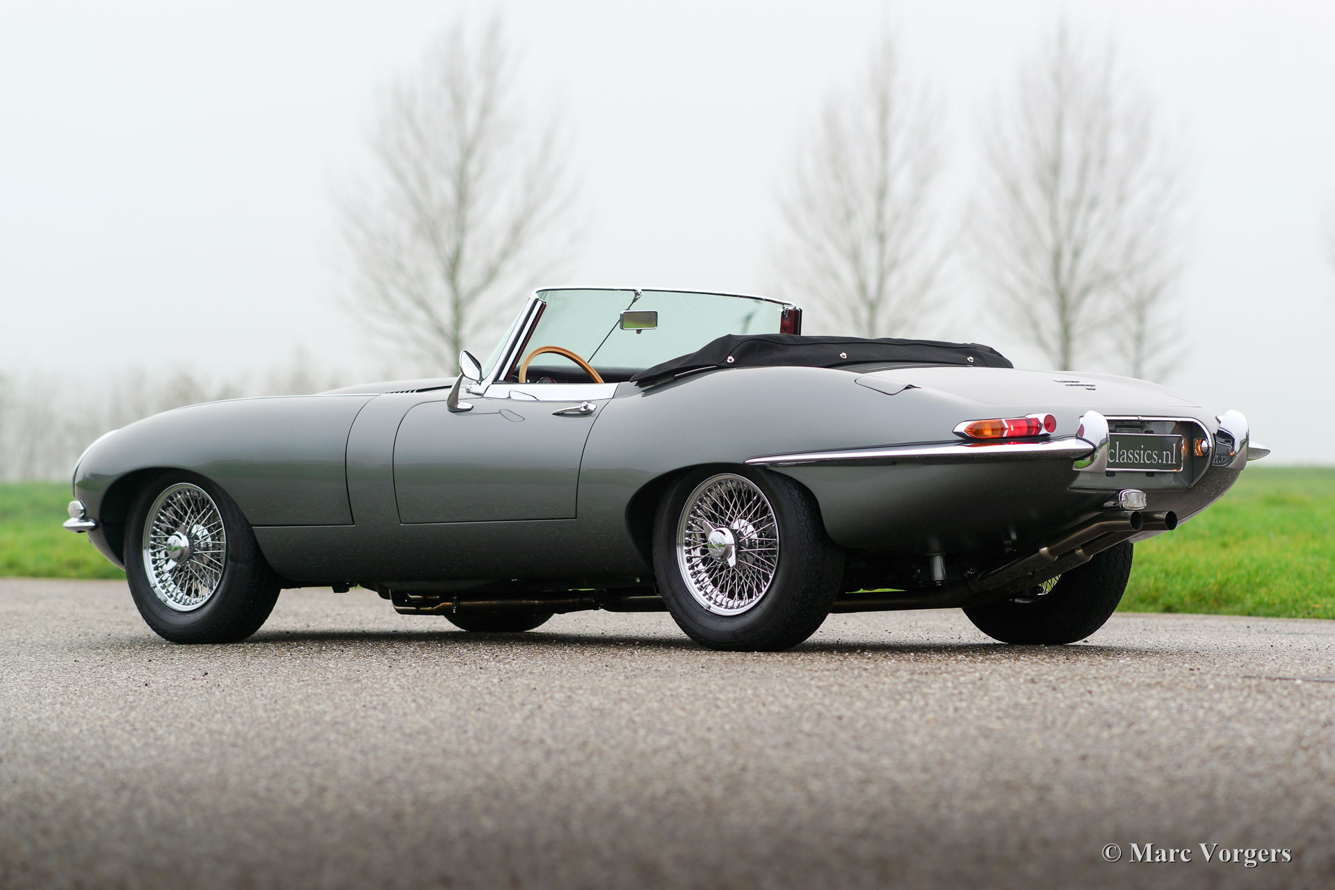Jaguar E-Type 4,2 litres OTS, série 1, année 1968. Couleur gris foncé métallisé (Gun Metal Grey) combiné avec un intérieur en cuir rouge foncé et un tapis assorti. Capote et capuche en mohair noir. Cet énorme Jaguar E-Type 4.2 litres OTS (Open Two Seater également nommé Roadster) fut vendu neuf aux États-Unis. En 2005, l'automobile fut importée aux Pays-Bas. Ensuite, la voiture fut restaurée détaillée et révisée à un niveau élevé. Ce Jaguar E-Type est en superbe état TOP ! La carrosserie fut restaurée par Martin Robey et le moteur fut révisé par la célèbre société néerlandaise van Giersbergen. Un reportage photo de la restauration est présent ainsi qu'un certificat "Heritage". La voiture a reçu quelques modifications souhaitables : trois carburateurs Weber doubles, un échappement en acier inoxydable «Big Bore», une boîte de vitesses à cinq rapports, des filtres à air sport K & N, un différentiel à glissement limité et un allumage électronique 123. Un Jaguar E-Type est une voiture puissante et très rapide, les modifications ont fait de cette Jaguar une machine de conduite spectaculaire ! En outre, la voiture est équipée de roues de fil chromées, d'écrous de roue chromés, d'un alternateur, de sièges chauffants et d'un magnifique volant MotoLita cerclé de bois. C'est une voiture de sport impressionnant, avec une belle note d'échappement, en parfait état !