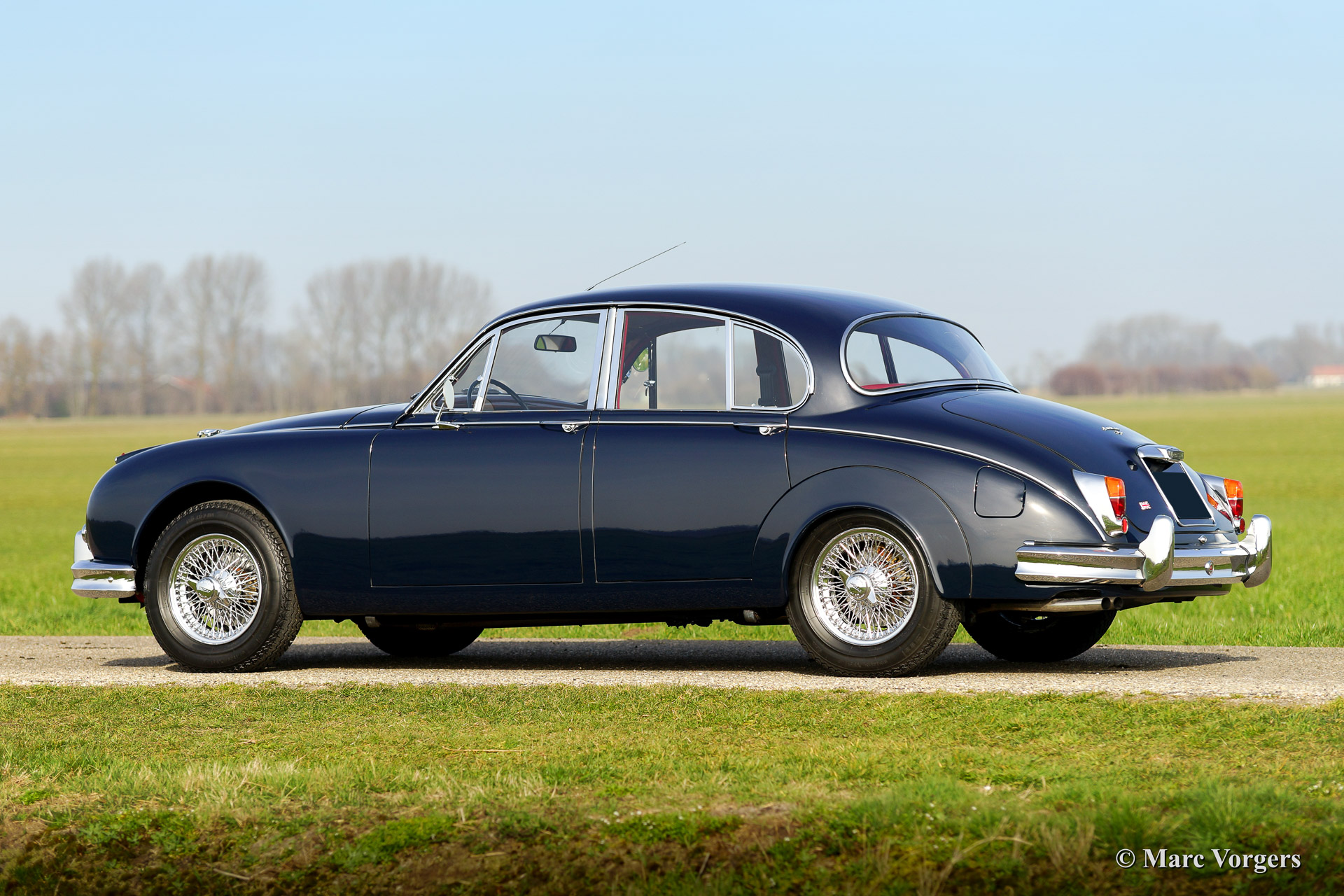 Jaguar Mk II 3.4 Litre, year 1967. Colour dark blue with a red leather interior and red carpet. This very beautiful Jaguar Mk II was fully and professionally restored by a renown Dutch restoration firm in recent years. This fine Mk II is in concours (show) condition! This magnificent Jaguar features a 4-speed manual gearbox with overdrive, chrome wire wheels, power steering, power brakes and tool box. This automobile was sold new in the Netherlands. A beauty and a delightful driver car.