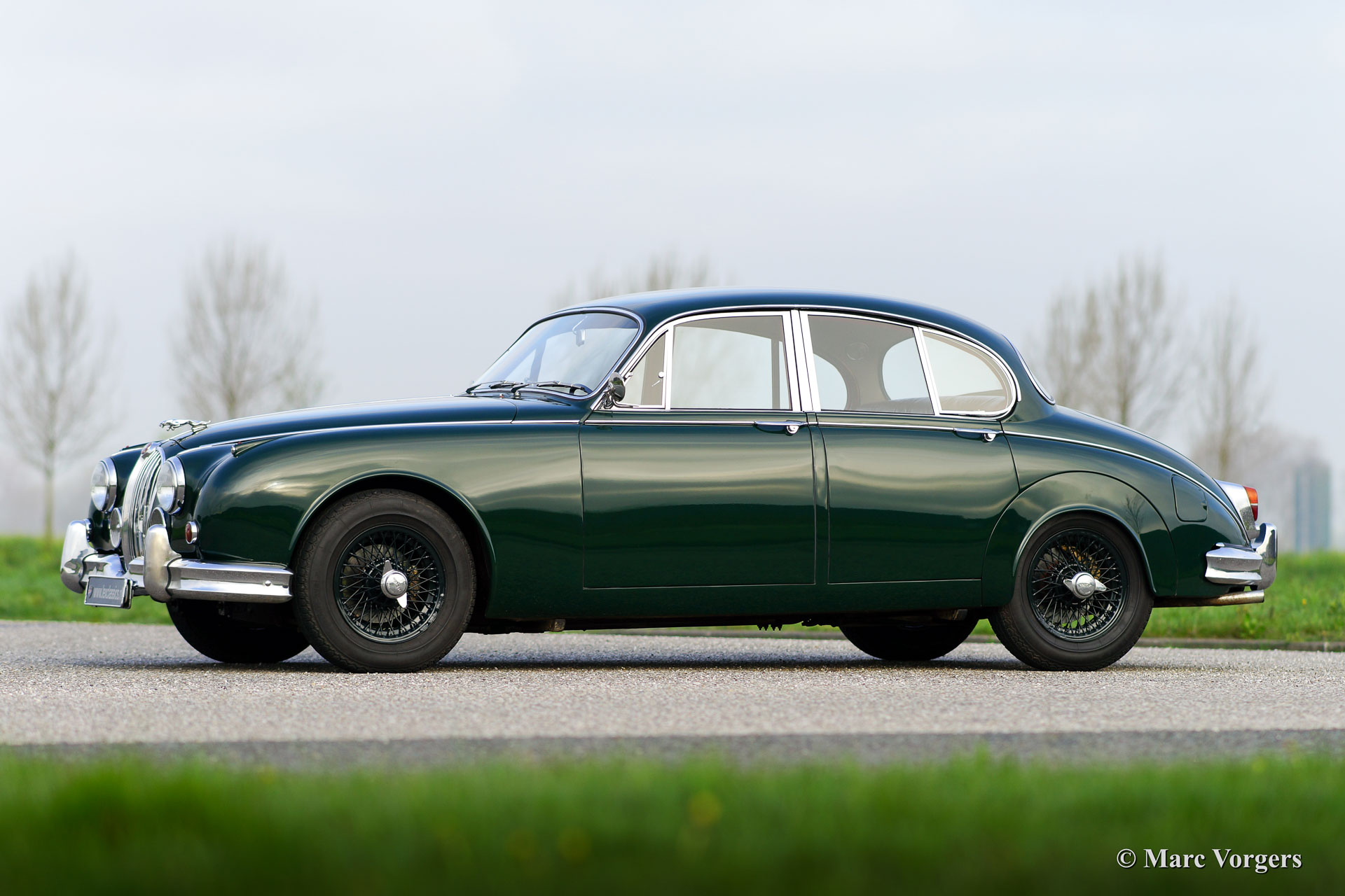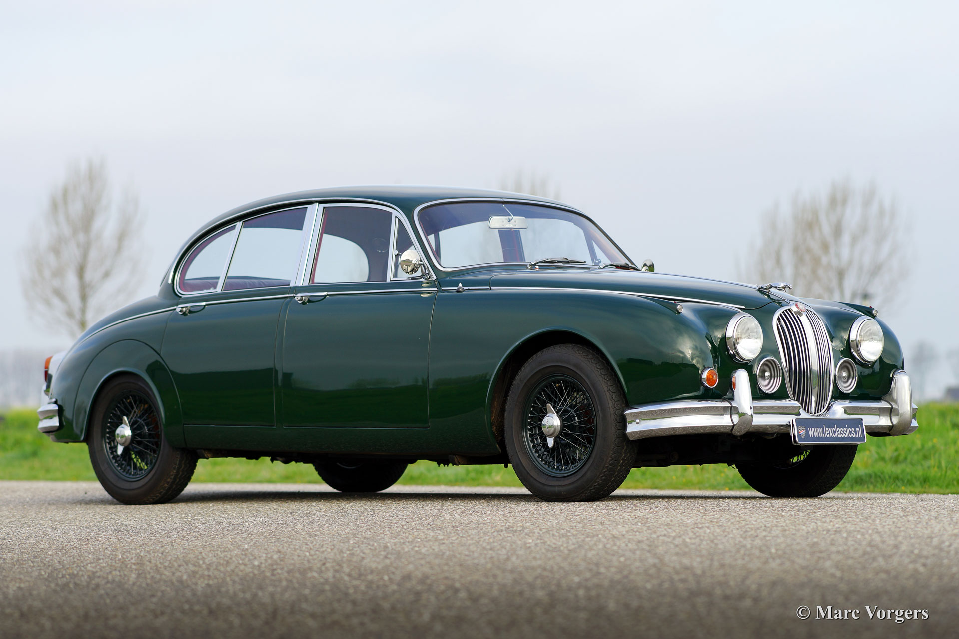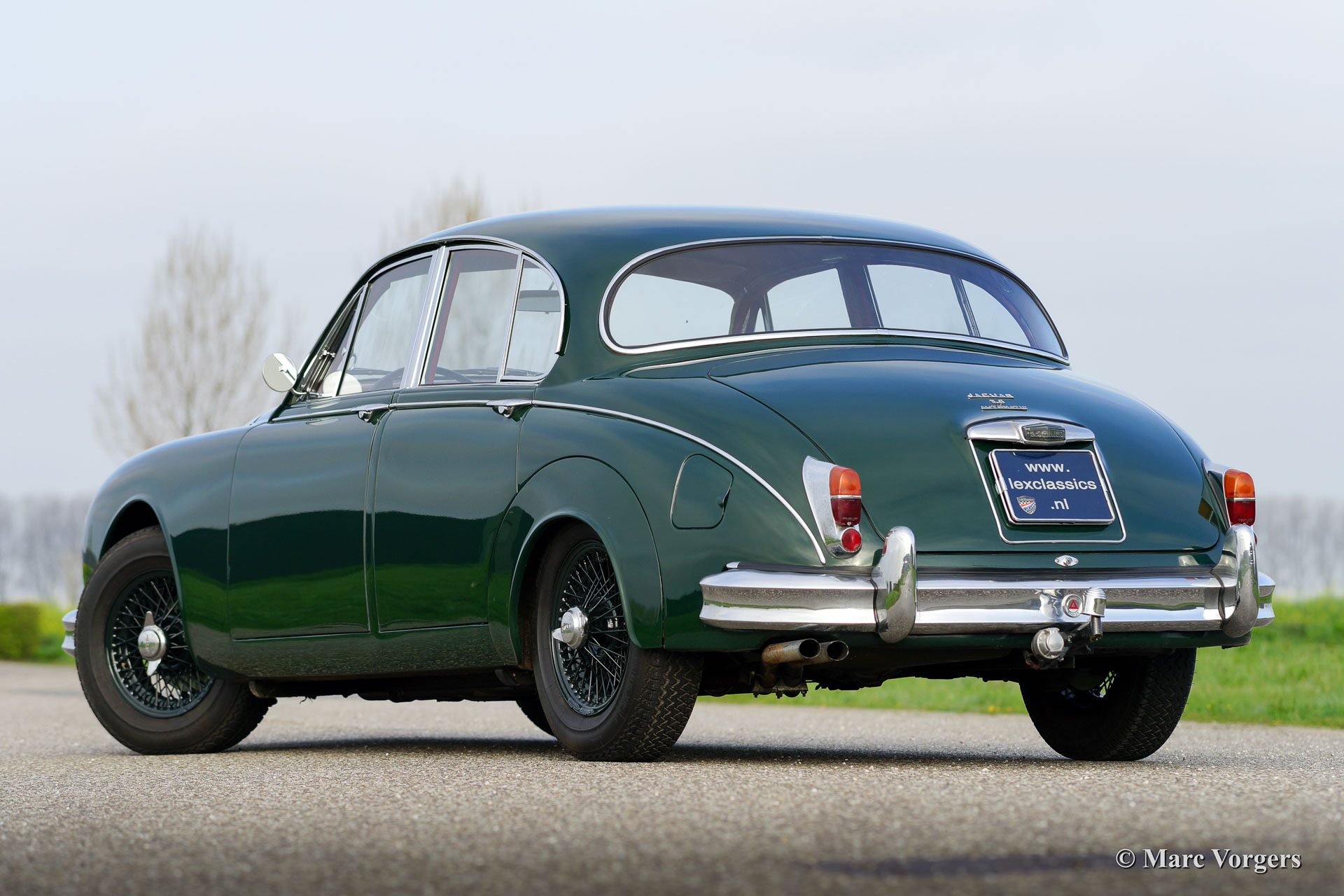 Jaguar Mk II 3.8 Litre, année 1961. Numéro de châssis: P217284BW. Couleur British Racing Green avec un intérieur cuir rouge et tapis rouge. Ce très élégant Jaguar Mk II 3.8 Litre a été importé des Etats-Unis aux Pays-Bas en l'an 1992. Puis la voiture a été longuement et ‘body off’ 'restauré. L'intérieur d'origine a été conservée. La restauration a été achevée en 1998. Un reportage photo complet de la restauration est présent. L'automobile dispose d'une boîte de vitesses automatique, roues fils émaillés verts, chrome 'knock off' écrous de roue, deux ailes miroirs, un ventilateur de refroidissement Kenlow électrique, couvercles de soupapes en aluminium, radio/CD Philips, d'échappement en acier inoxydable, allumage électronique 123, amortisseurs de choc Koni, l'appareil à gouverner moderne, direction assistée (XJ6) et une barre de remorquage. Cette belle Jaguar est en très bon état et la voiture roule délicieusement!