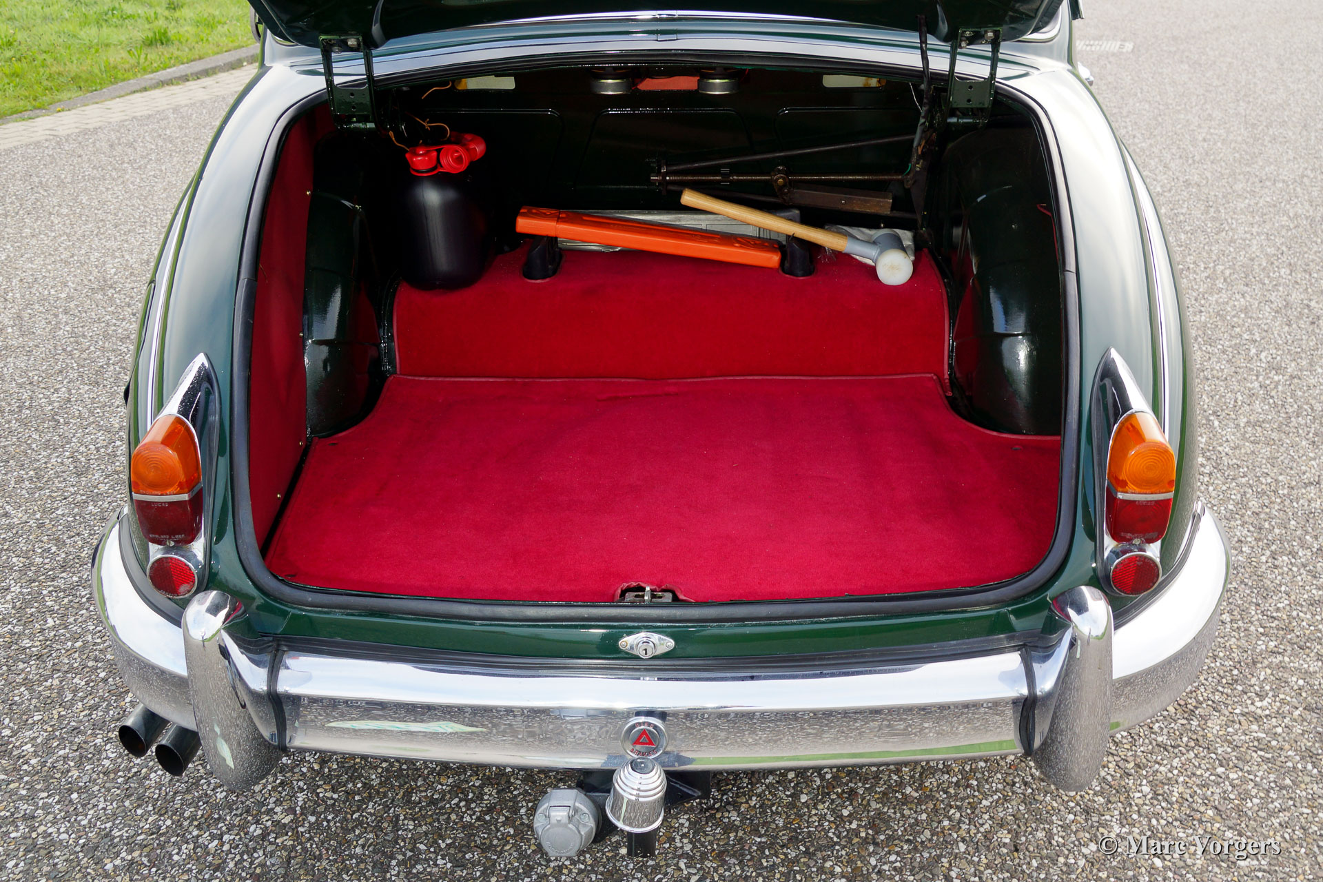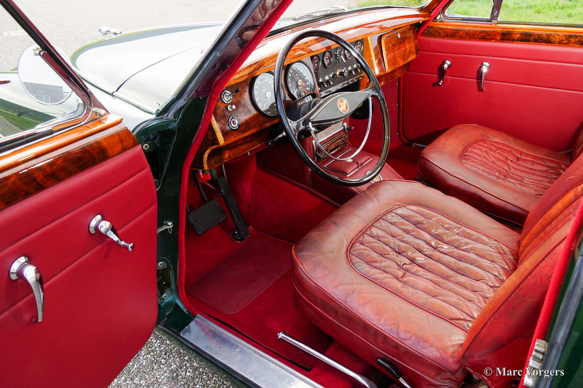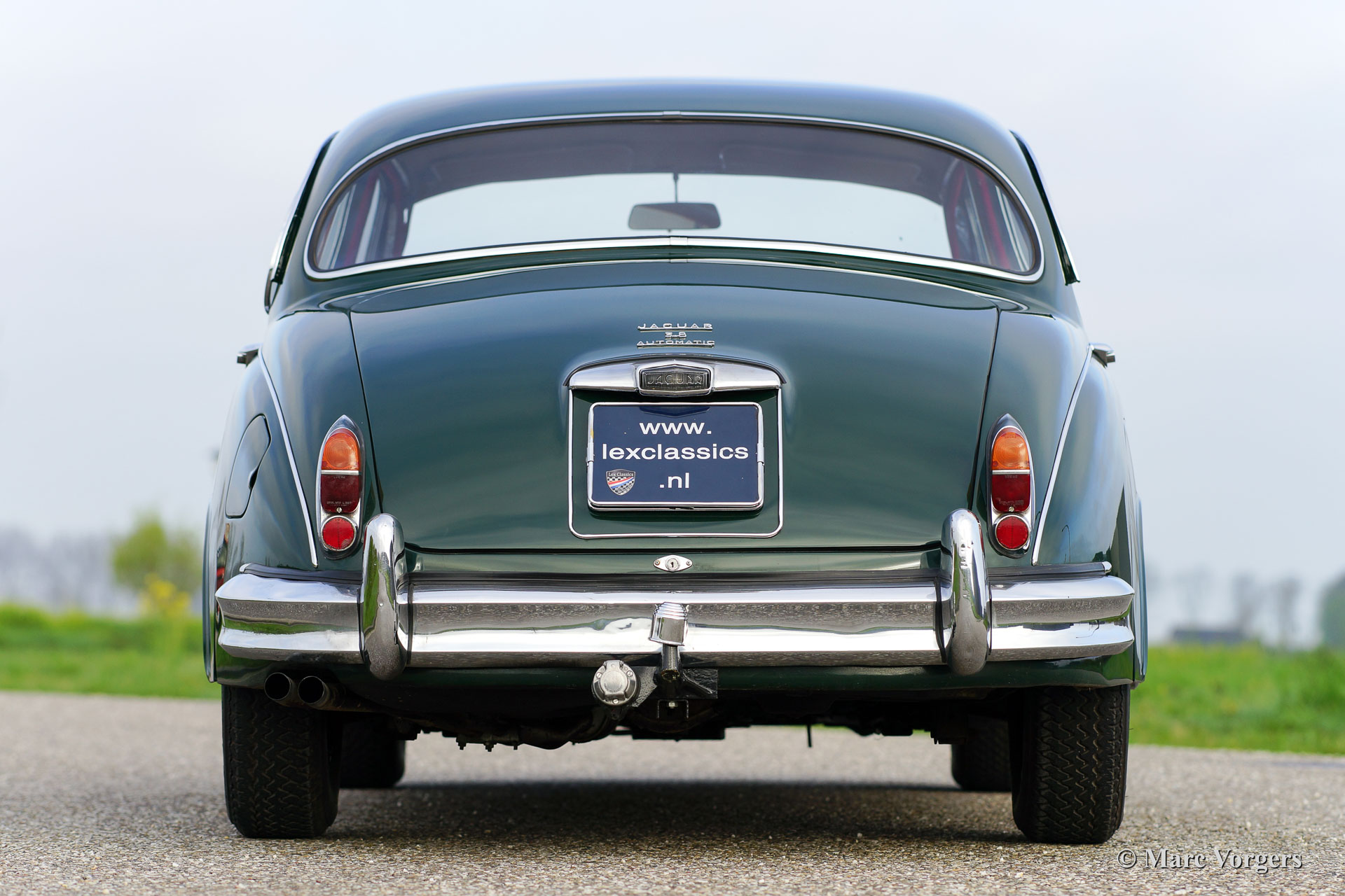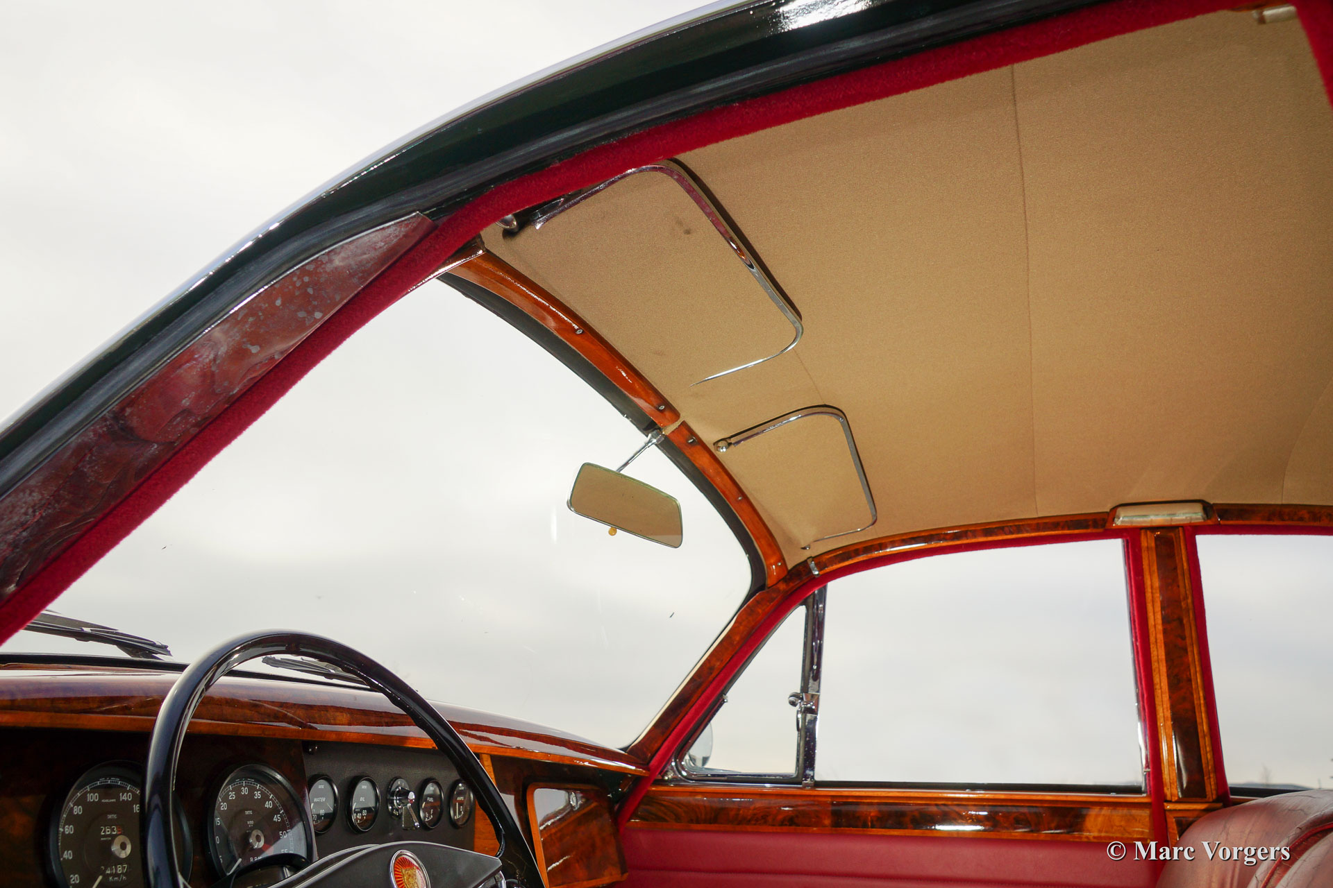 Jaguar Mk II 3.8 Litre, année 1961. Numéro de châssis: P217284BW. Couleur British Racing Green avec un intérieur cuir rouge et tapis rouge. Ce très élégant Jaguar Mk II 3.8 Litre a été importé des Etats-Unis aux Pays-Bas en l'an 1992. Puis la voiture a été longuement et ‘body off’ 'restauré. L'intérieur d'origine a été conservée. La restauration a été achevée en 1998. Un reportage photo complet de la restauration est présent. L'automobile dispose d'une boîte de vitesses automatique, roues fils émaillés verts, chrome 'knock off' écrous de roue, deux ailes miroirs, un ventilateur de refroidissement Kenlow électrique, couvercles de soupapes en aluminium, radio/CD Philips, d'échappement en acier inoxydable, allumage électronique 123, amortisseurs de choc Koni, l'appareil à gouverner moderne, direction assistée (XJ6) et une barre de remorquage. Cette belle Jaguar est en très bon état et la voiture roule délicieusement!