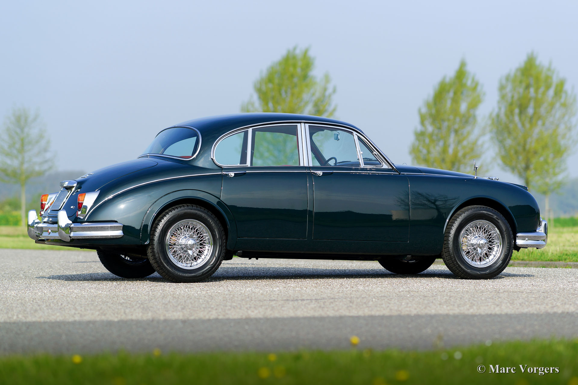 Jaguar Mk II 3,8 litres, année 1968. Couleur British Racing Green avec un intérieur en cuir rouge et tapis rouge. Ce magnifique Jaguar Mk II fut restauré détaillé et ‘body-off’ aux Pays-Bas, le Jaguar est en superbe état TOP ! Le moteur de 3,8 litres offre beaucoup de puissance et combine très bien avec la boîte de vitesses automatique. La voiture comporte des roues en fil chromée, des écrous de roue chromés, des lampes de commande supplémentaires à l'avant et deux rétroviseurs montés à l'aile. C'est un Jaguar Mk II dynamique, élégante et sublime !