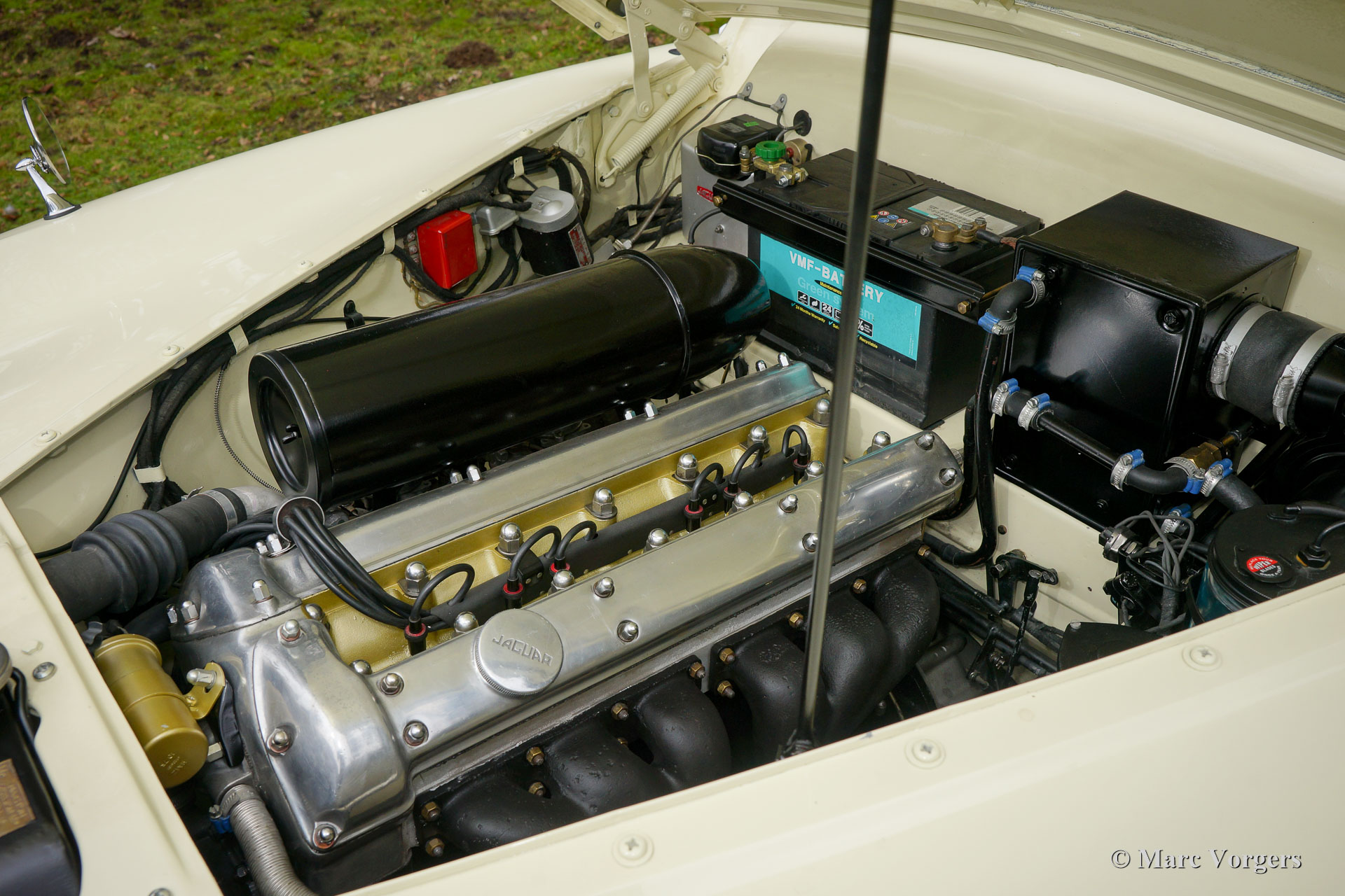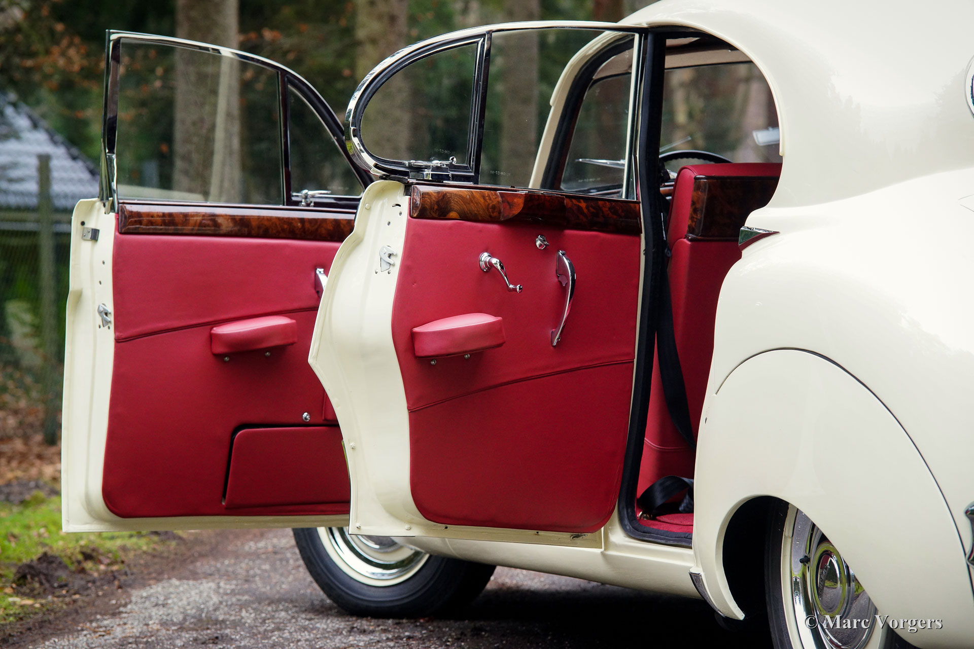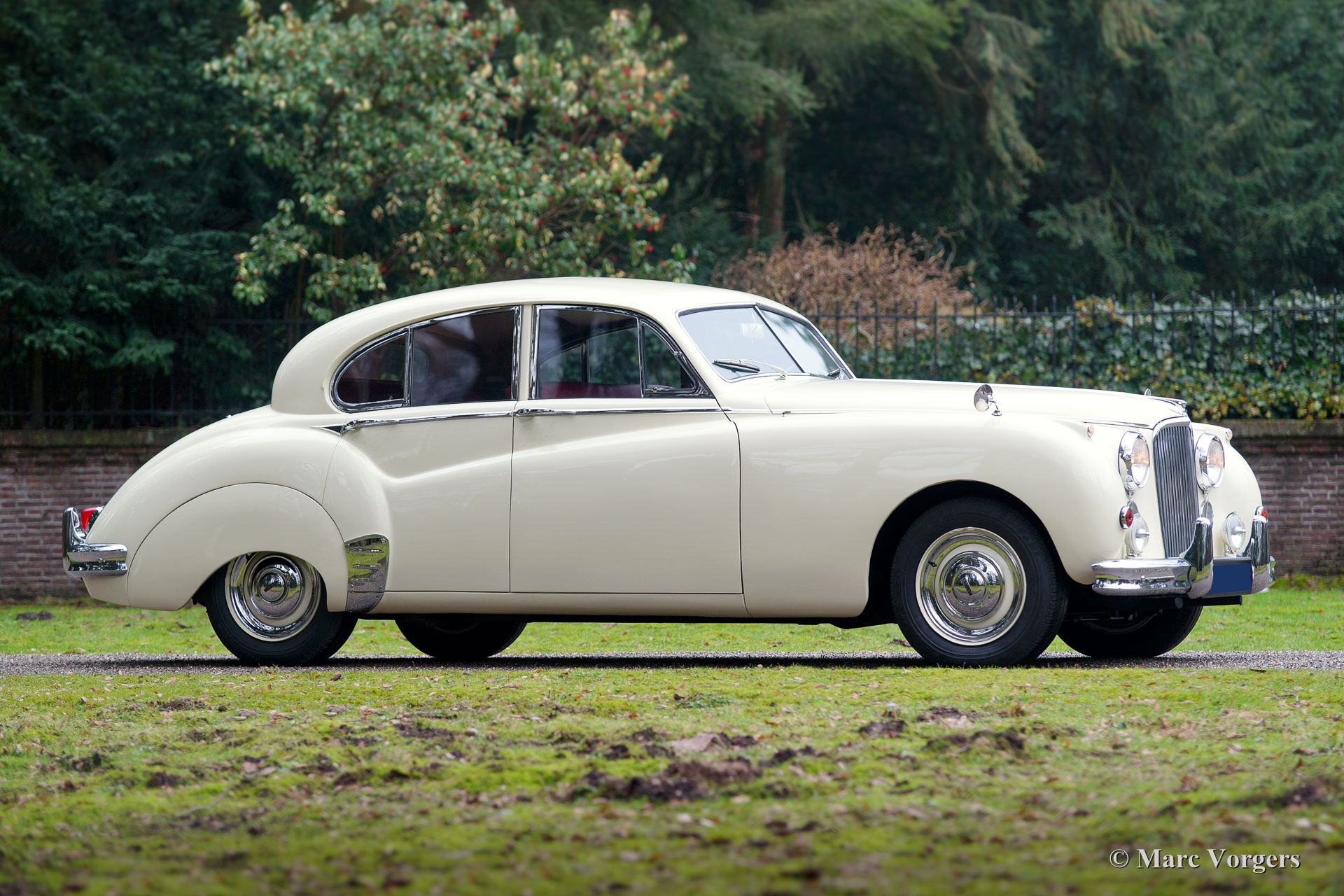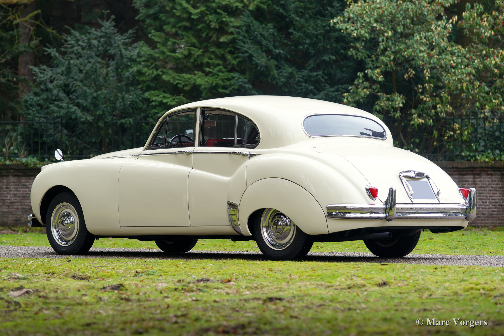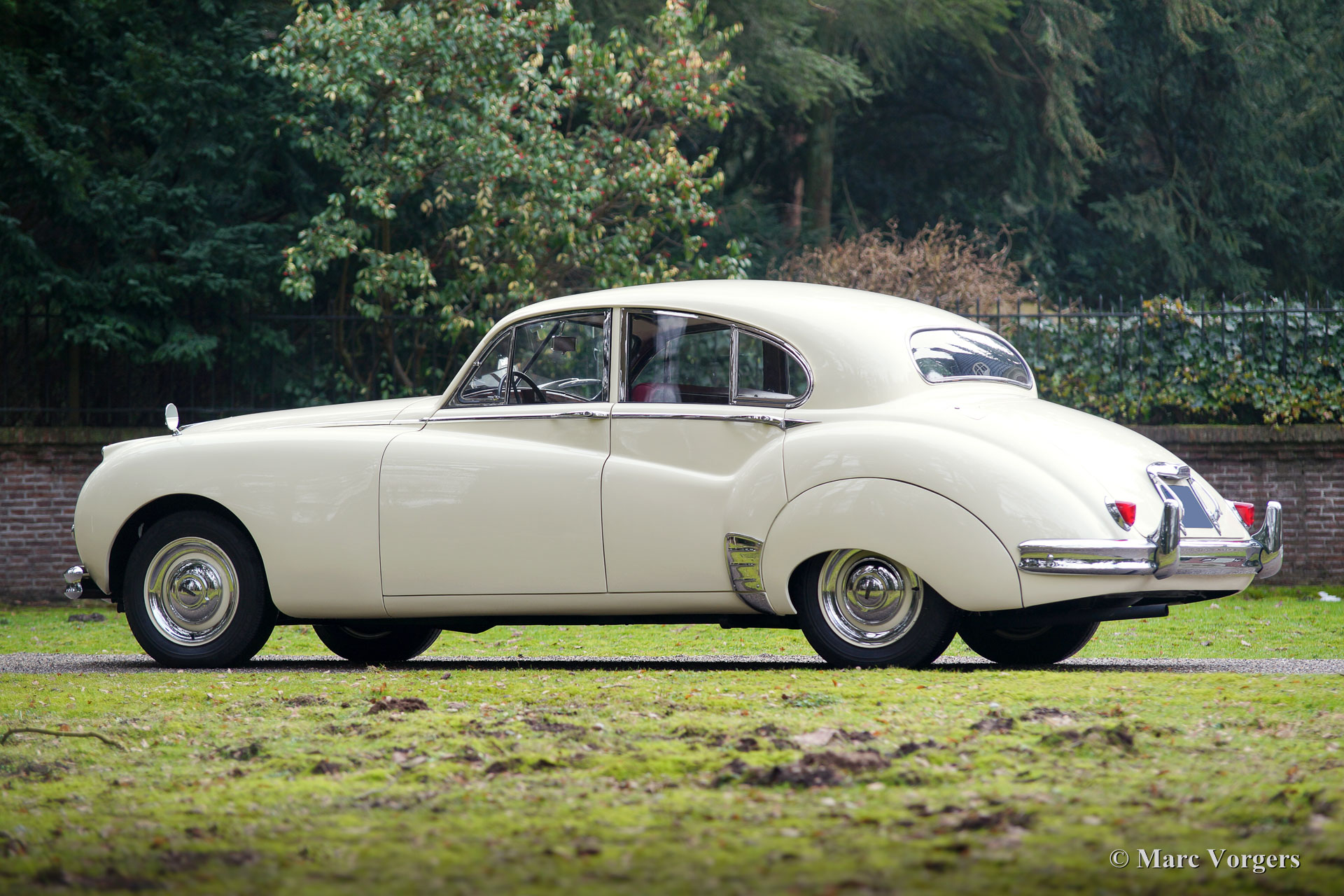 Jaguar Mk VIIM, année 1956. Couleur jaune pâle (Primrose Yellow) avec intérieur en cuir rouge foncé. Cette impressionnante berline Jaguar Mk VIIM a été vendue neuve en Nouvelle-Zélande. En 1996, l'automobile fut importée aux Pays-Bas. Le propriétaire actuel a acheté la voiture en 2011 et il avait la voiture largement et parfaitement restauré à état concours ! Ce Jaguar n'est pas un Mk 7 standard mais un Mk 7M spécial. Le « M » présente le moteur XK de 190 ch (au lieu de 160 ch) et la voiture peut être identifiée par les phares antibrouillard sur le pare-chocs avant, les clignotants sur les ailes avant, les phares avec un ‘J’ au centre, les pare-chocs reprofilés, et des feux arrière plus grands. L'exploit le plus remarquable du type MK VIIM a été de remporter le rallye Monte-Carlo de 1965 ! La voiture s'est révélée détendue pour conduire à des vitesses très élevées, soi-disant « voitures de sport » n'a pas eu une chance parce que leur équipage a usé beaucoup plus rapidement.