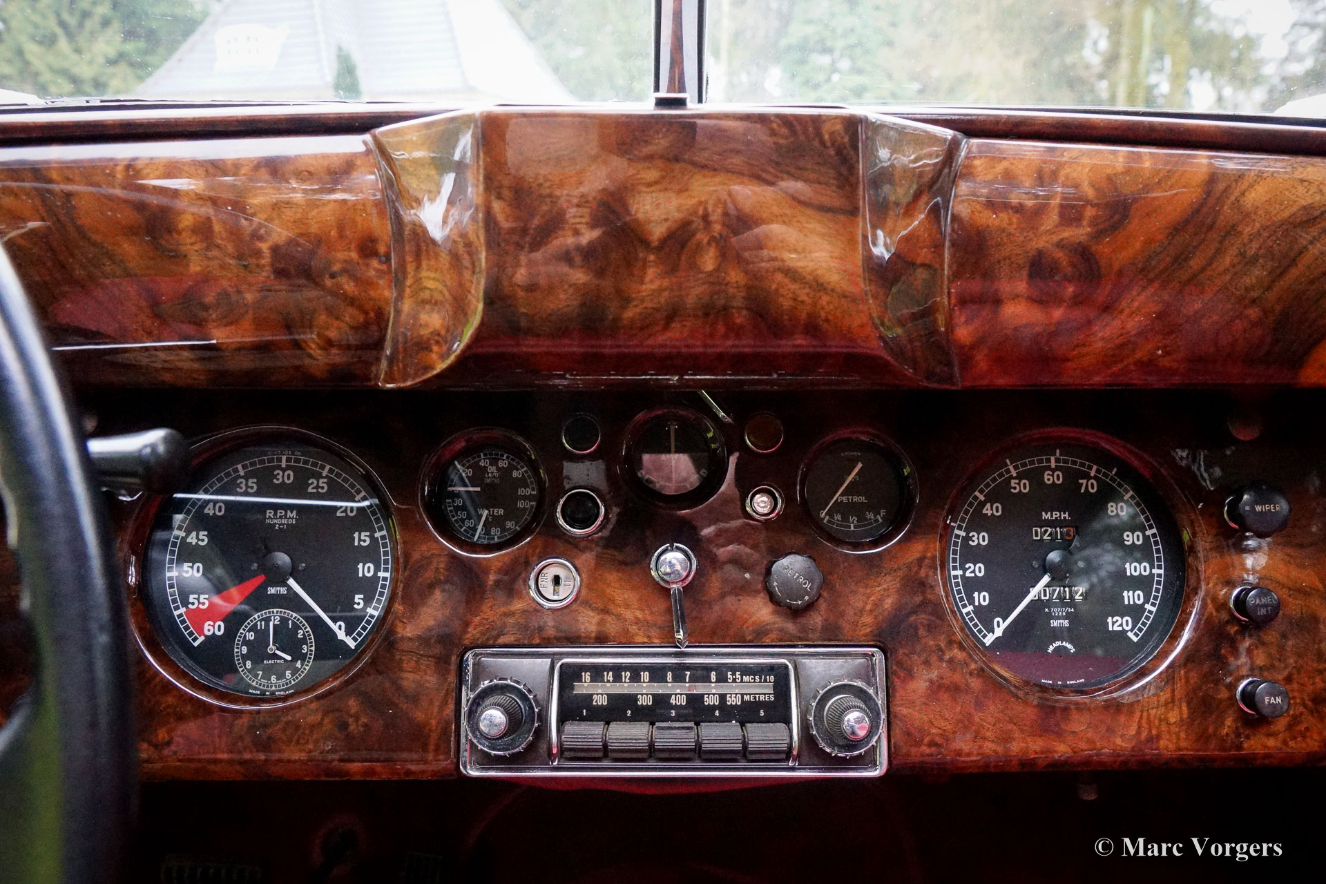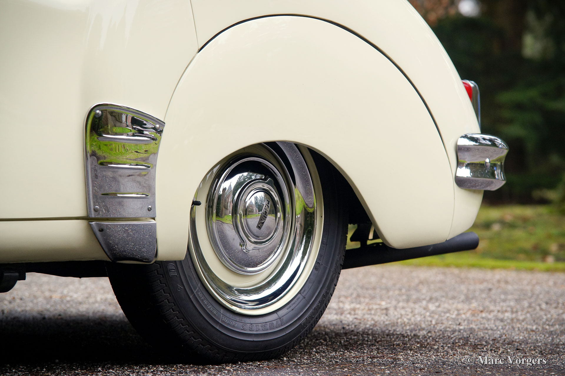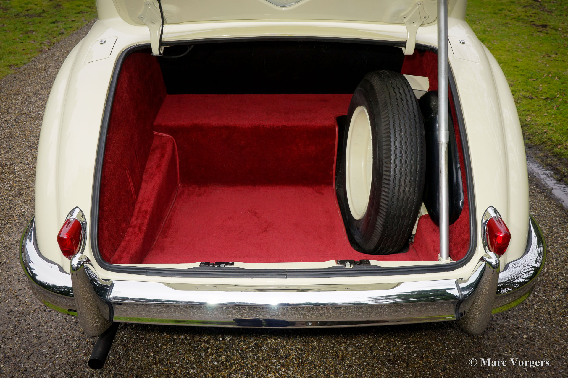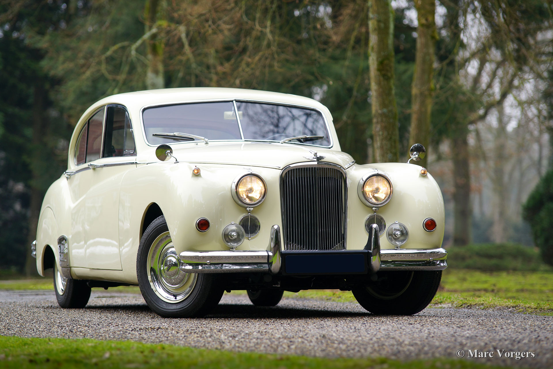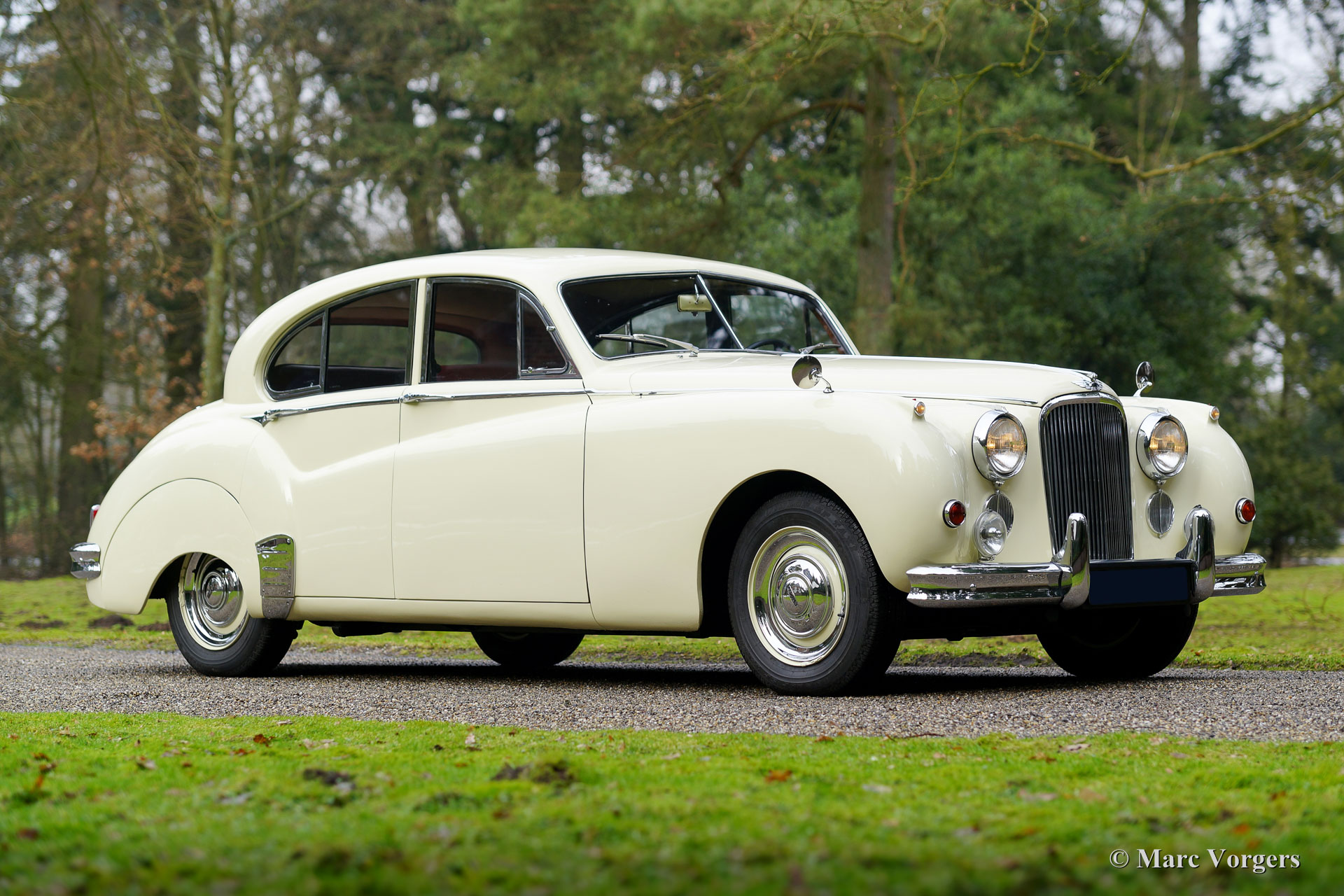 Jaguar Mk VIIM, année 1956. Couleur jaune pâle (Primrose Yellow) avec intérieur en cuir rouge foncé. Cette impressionnante berline Jaguar Mk VIIM a été vendue neuve en Nouvelle-Zélande. En 1996, l'automobile fut importée aux Pays-Bas. Le propriétaire actuel a acheté la voiture en 2011 et il avait la voiture largement et parfaitement restauré à état concours ! Ce Jaguar n'est pas un Mk 7 standard mais un Mk 7M spécial. Le « M » présente le moteur XK de 190 ch (au lieu de 160 ch) et la voiture peut être identifiée par les phares antibrouillard sur le pare-chocs avant, les clignotants sur les ailes avant, les phares avec un ‘J’ au centre, les pare-chocs reprofilés, et des feux arrière plus grands. L'exploit le plus remarquable du type MK VIIM a été de remporter le rallye Monte-Carlo de 1965 ! La voiture s'est révélée détendue pour conduire à des vitesses très élevées, soi-disant « voitures de sport » n'a pas eu une chance parce que leur équipage a usé beaucoup plus rapidement.