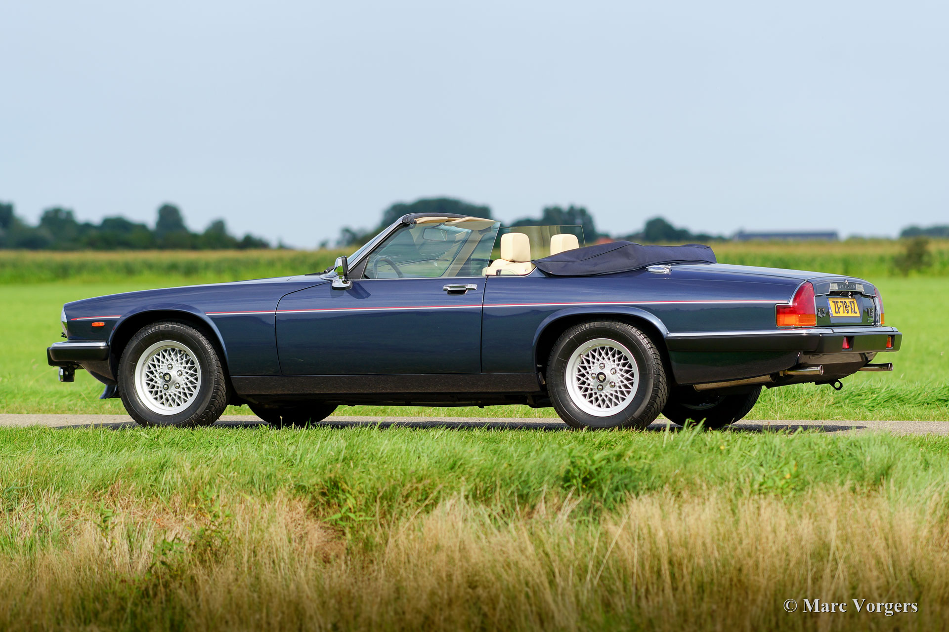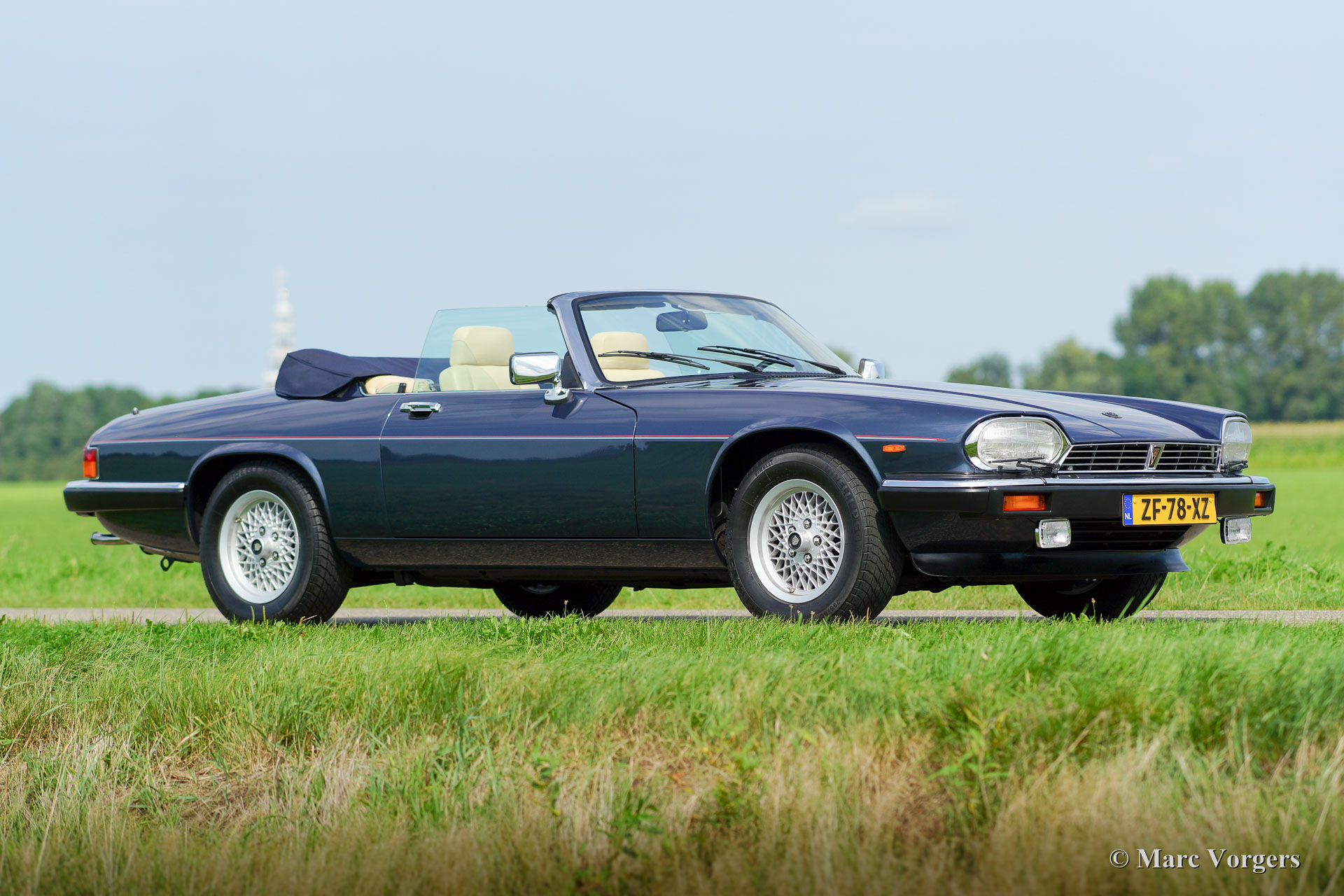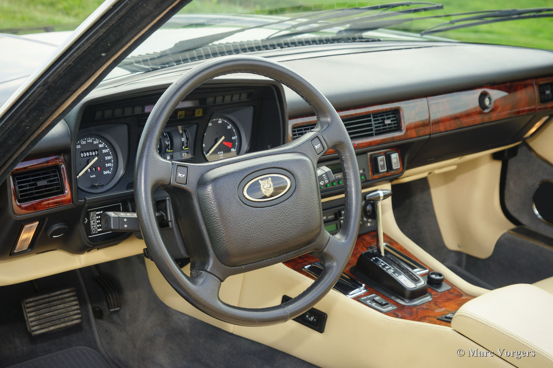 Jaguar XJS Convertible, année 1991. Couleur bleu métallique foncé avec un intérieur cuir Magnolia (beige clair) et tapis gris. Capote mohair bleu foncé et le couvercle de la hotte bleu foncé. Cette fabuleuse Jaguar XJS a été vendue neuve aux Pays-Bas par le représentant officiel Jaguar Cito Motors à Eindhoven. Cette entreprise a également réparé la voiture au fil des ans. L'automobile vient du deuxième propriétaire et la voiture a conduit seulement 36,340 km de nouveau ! Le manuel du propriétaire et le livret de service estampillé sont présents. Cette Jaguar XJS est en excellent état d'origine, comme NEUF ; concours! Le XJS dispose d'une boîte de vitesses automatique et le moteur Jaguar V12 légendaire ; ce XJS roule et pousse très impressionnante !