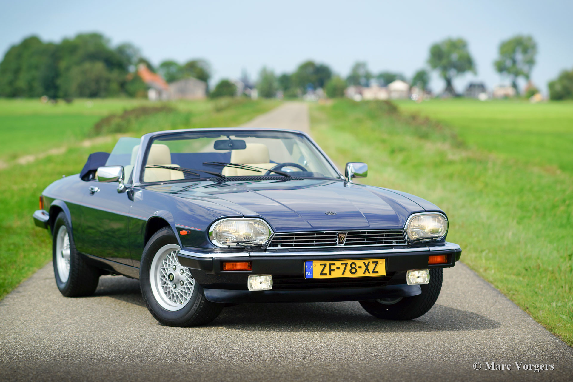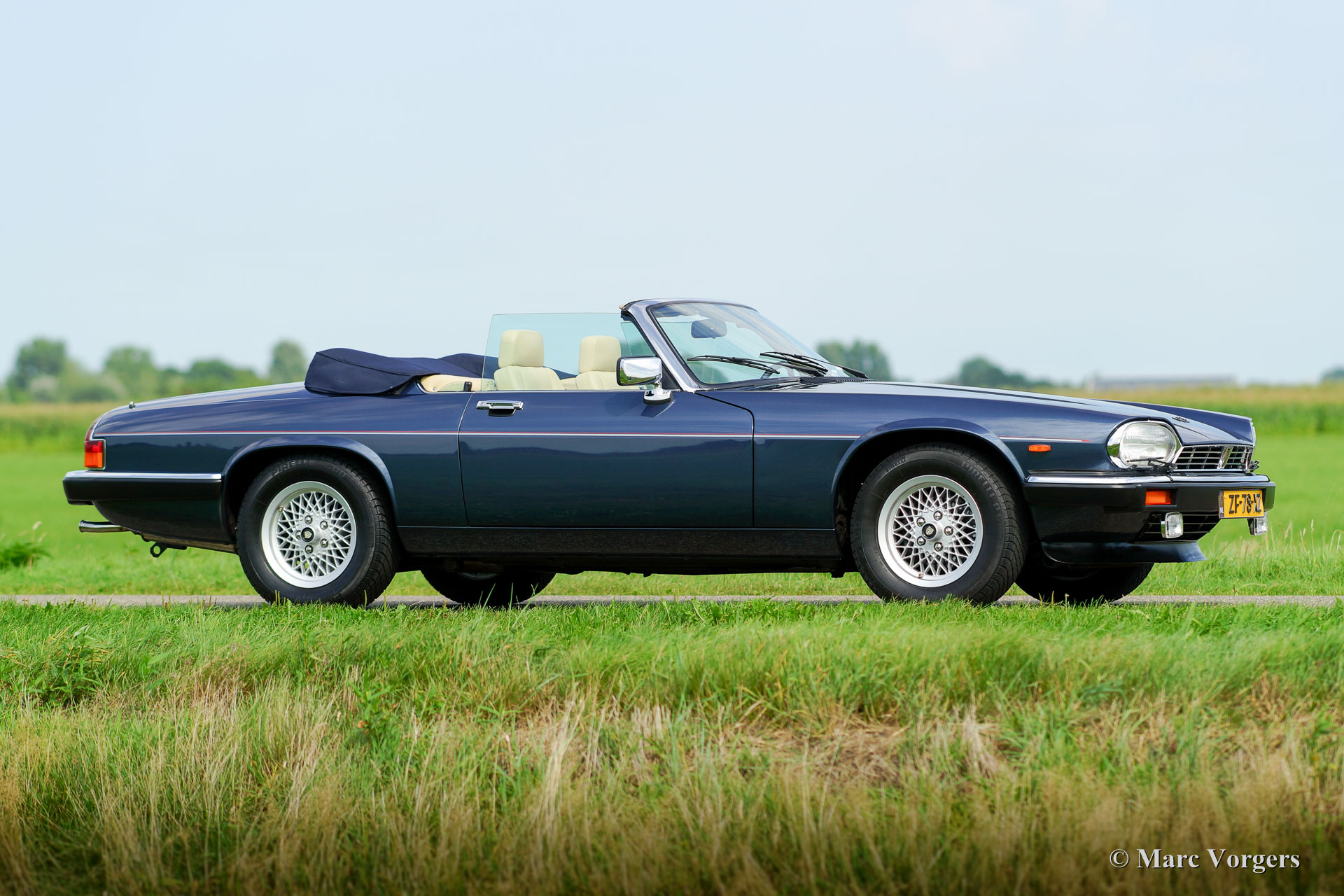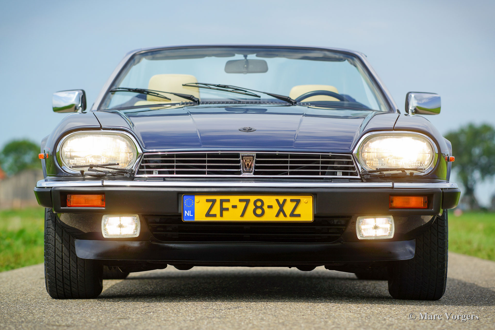 Jaguar XJS Convertible, année 1991. Couleur bleu métallique foncé avec un intérieur cuir Magnolia (beige clair) et tapis gris. Capote mohair bleu foncé et le couvercle de la hotte bleu foncé. Cette fabuleuse Jaguar XJS a été vendue neuve aux Pays-Bas par le représentant officiel Jaguar Cito Motors à Eindhoven. Cette entreprise a également réparé la voiture au fil des ans. L'automobile vient du deuxième propriétaire et la voiture a conduit seulement 36,340 km de nouveau ! Le manuel du propriétaire et le livret de service estampillé sont présents. Cette Jaguar XJS est en excellent état d'origine, comme NEUF ; concours! Le XJS dispose d'une boîte de vitesses automatique et le moteur Jaguar V12 légendaire ; ce XJS roule et pousse très impressionnante !