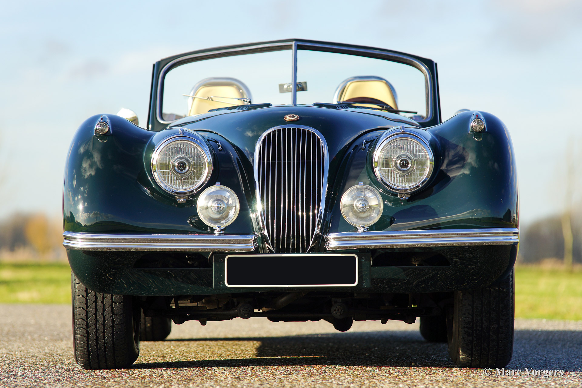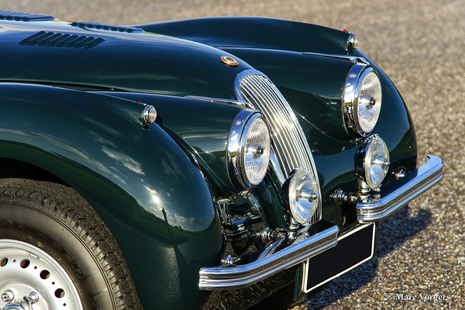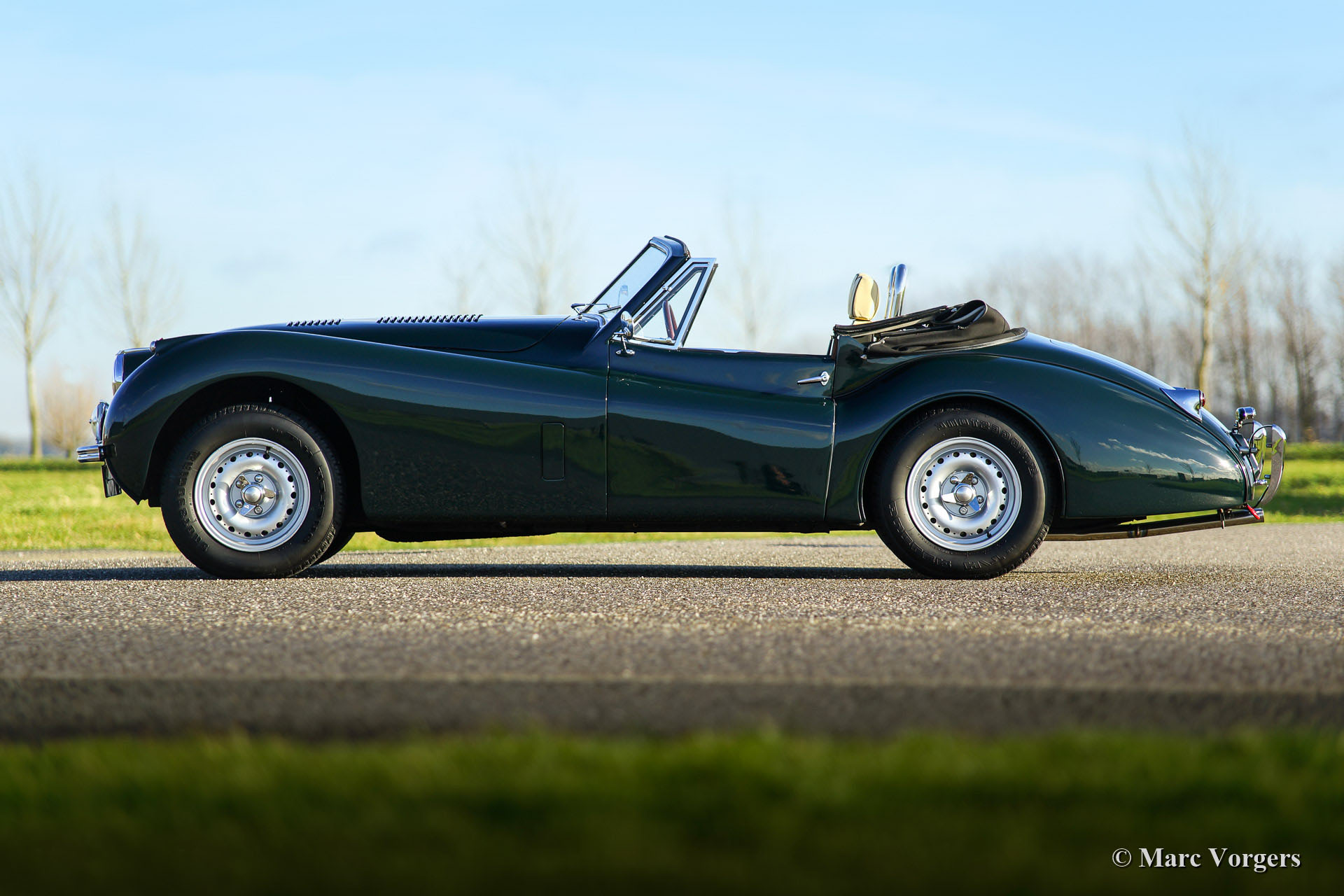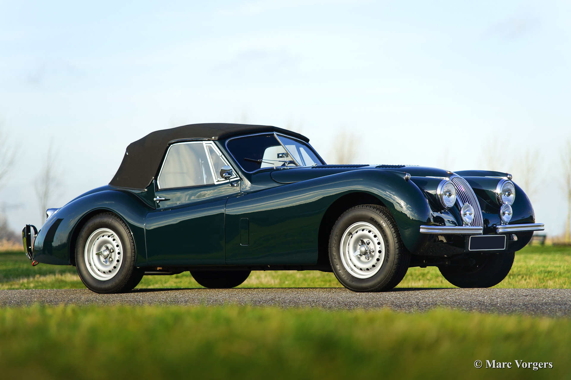 Jaguar XK 120 Drophead Coupe (DHC), year 1954. Chassis number: 678302, engine number: NAI242-8 and 7365-8. Colour British Racing Green with a beige leather interior trimmed with brown piping. Brown carpet. Black mohair soft top. This car was originally sold new in the Netherlands, the old linen registration 'paper' is still present. This fabulous Jaguar XK 120 was extensively restored in the year 2004. The automobile is in superb (excellent+) condition! Additionally some modifications were carried out to improve safety and reliability. Improvements: 'S' cylinderhead, 'fast road' camshafts, more precise XK 150 steering, Getrag 5-speed manual gearbox, special rollbars, special leather seats, 4-point safety harnesses, GTI rally twin, a louvered bonnet for improved cooling, 123 electronic ignition, 2 inch 'sand-cast' carburettors, Dunlop alloy wheels, additional driving lamps at front and a special steering wheel. This masculine XK 120 drives fantastic!