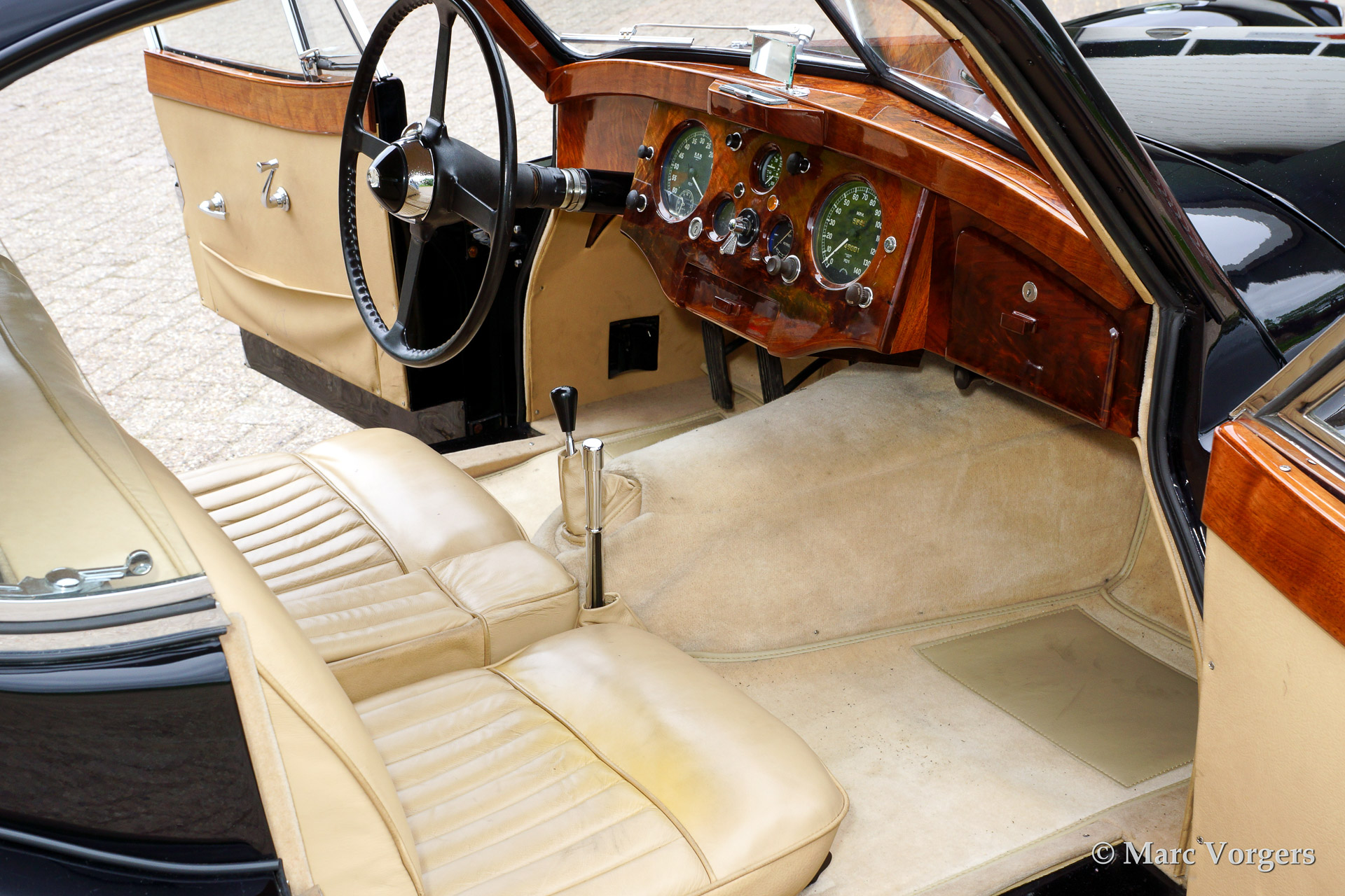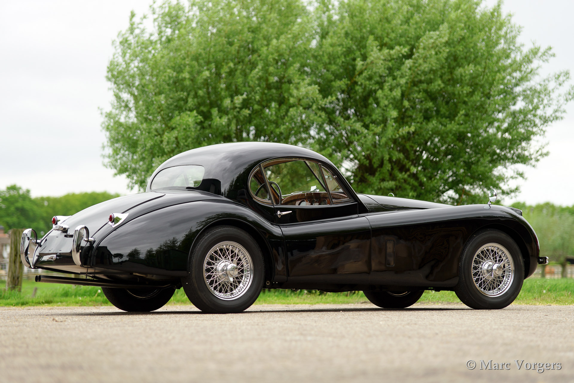 Jaguar XK 120 Fixed Head Coupe (FHC), year 1954. Colour black with a beige interior. The car features a manual 4-speed gearbox, 16 inch chrome wire wheels, additional driving lamps at front and the beautiful classic 'tripod' headlamps.
