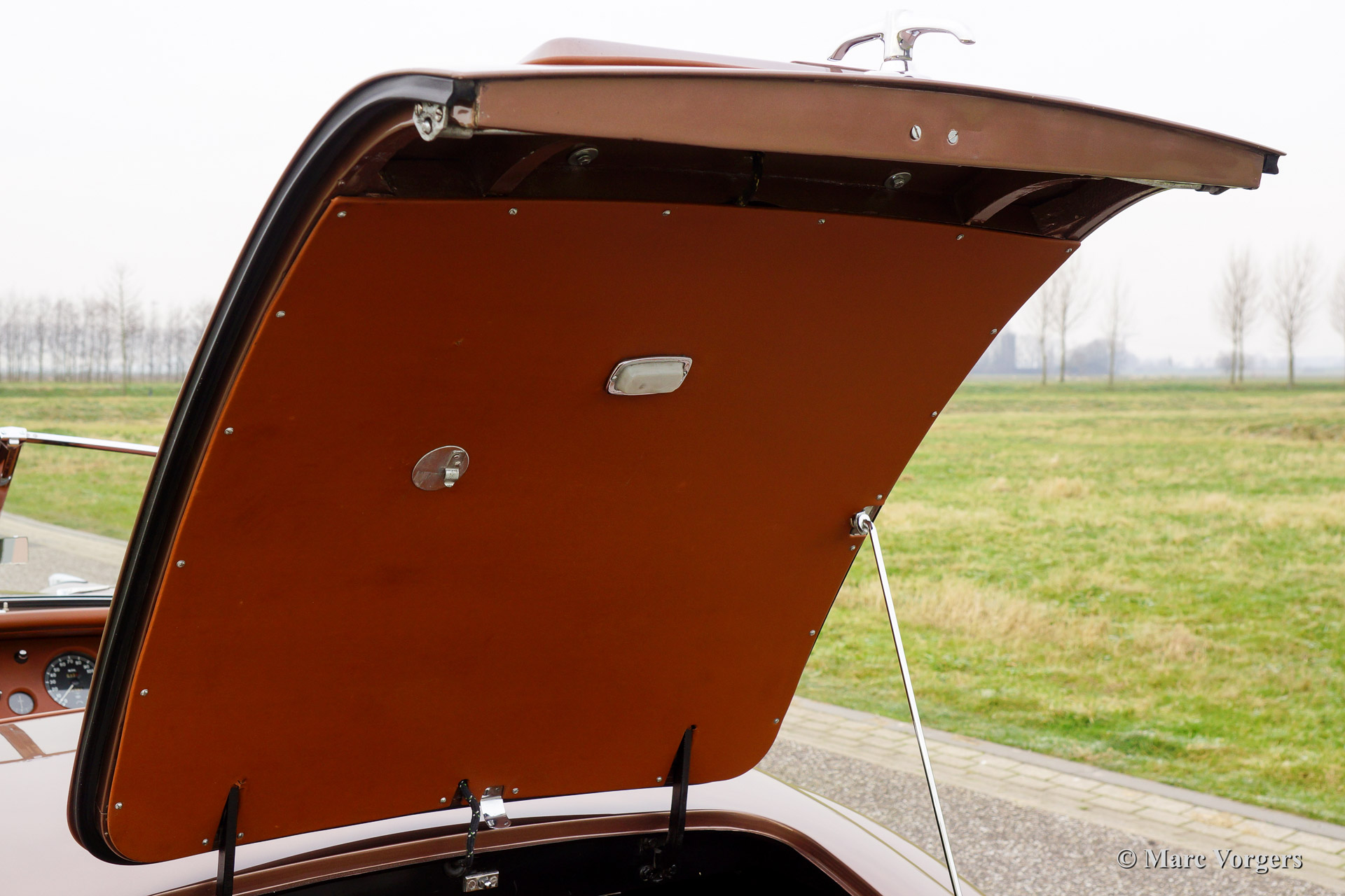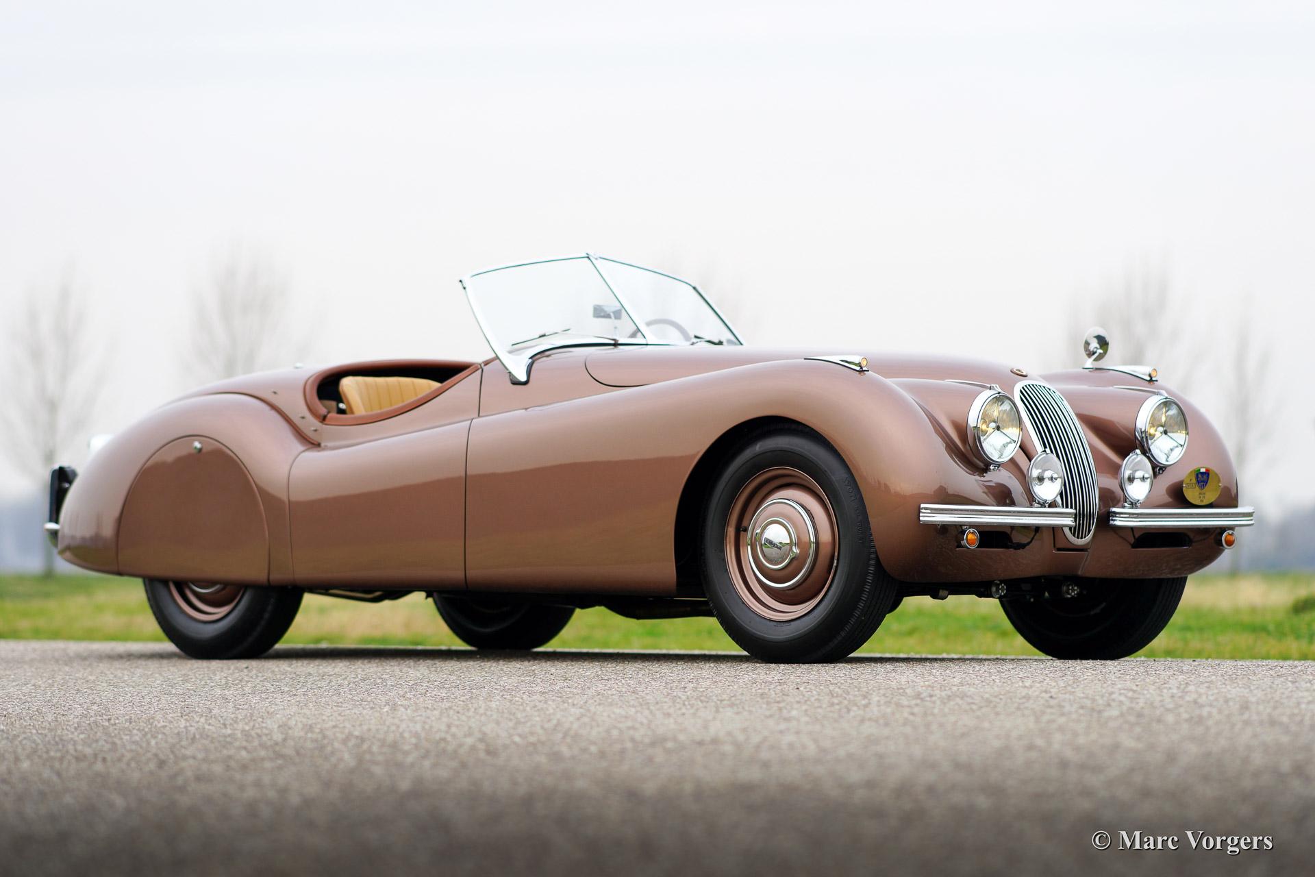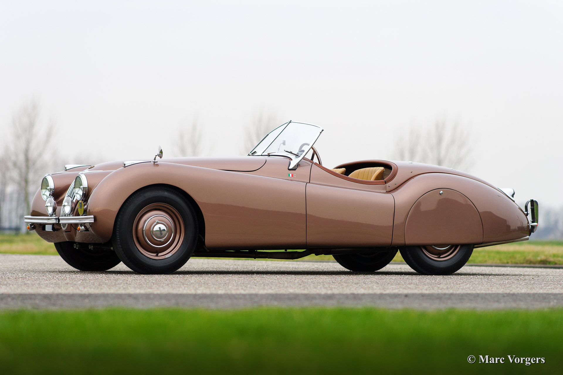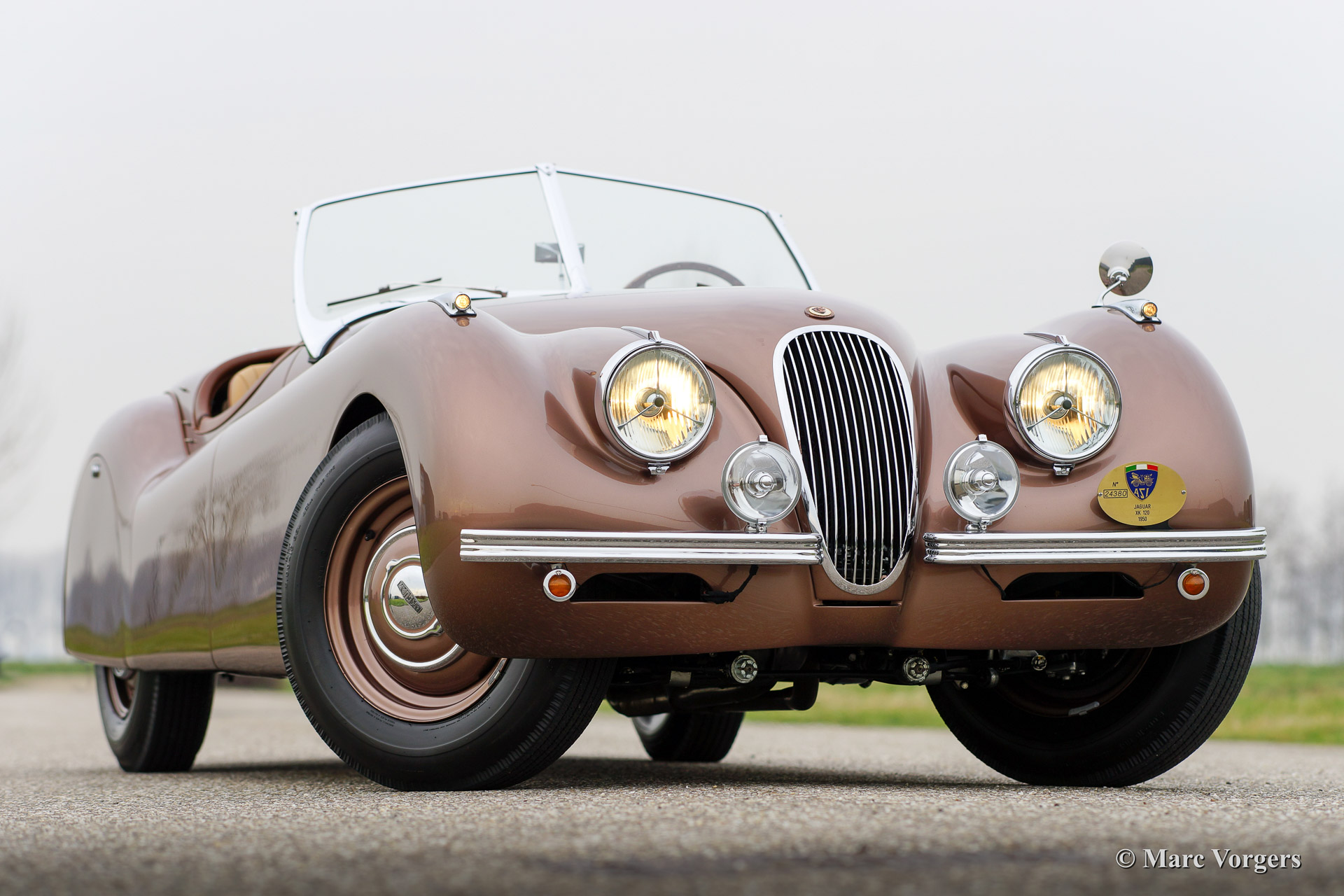 Jaguar XK 120 OTS (Open Two Seater / roadster), year 1950. Chassis number 670612, engine number W 1351-8. Colour bronze with a biscuit/tan leather interior. This early metal body Jaguar XK 120 was extensively and perfectly 'body off restored' a few years ago. The automobile is in concourse (show) condition. A Heritage certificate is present; this is a 'matching numbers' car. This XK 120 shows fantastic original details like the disc wheels and the 'spats' over the rear wheels. Furthermore the car is fitted with additional spot lamps at front and a beautiful 4-spoke steering wheel with wood rim. The rare polished metal lamps on the front wings were only fitted to the scarce aluminium bodied cars and to the earliest XK's with metal body work. This tremendous Jaguar XK 120 roadster has participated in the Mille Miglia Storiche in the years 2009, 2011 and 2012 and in the Gran Premio Nuvolari in the hands of a well-known Italian business man. This fine Jaguar comes beautifully documented. This car is a perfect investment and this car bring the chance to obtain a starting place in the famous Italian Mille Miglia.