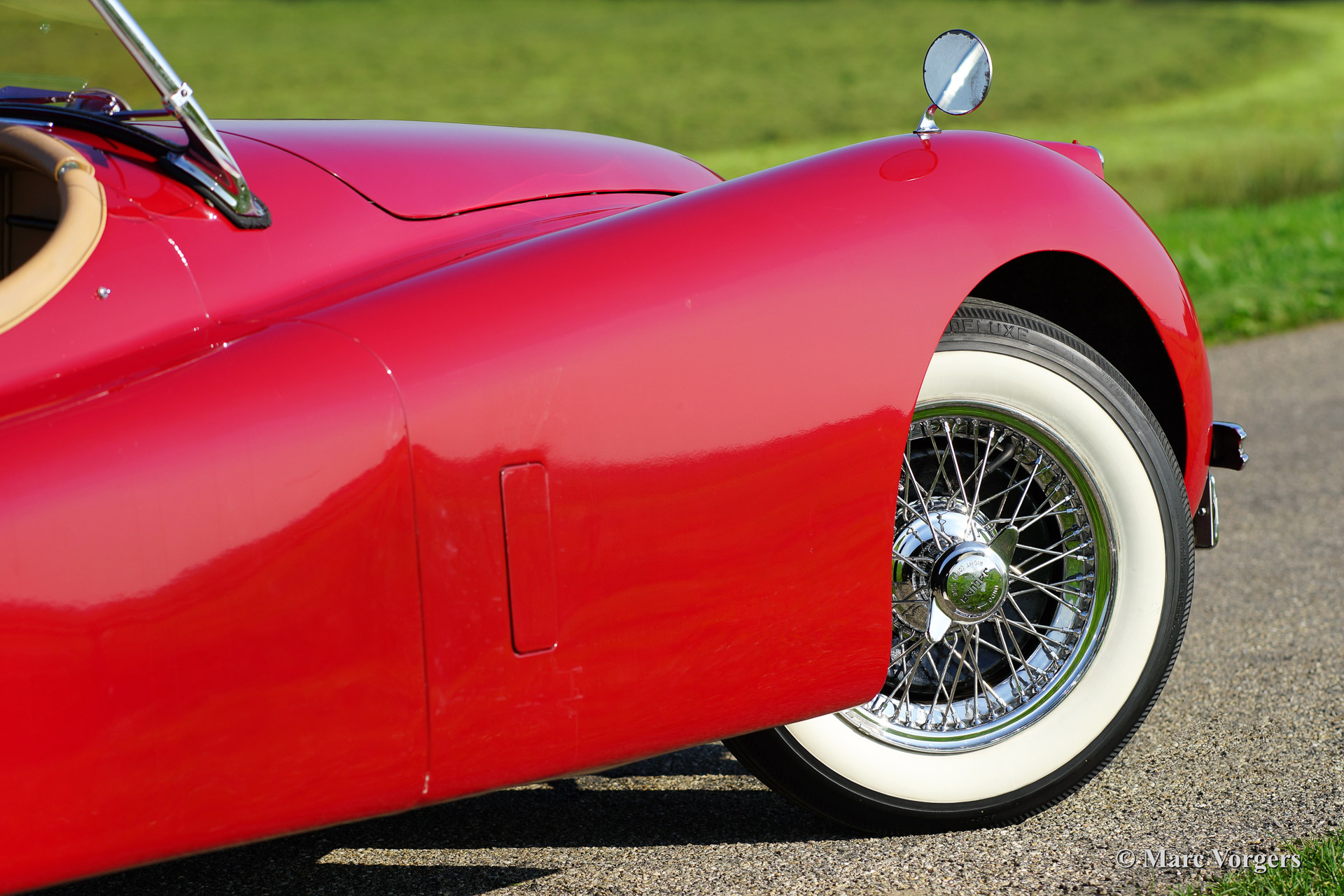 Jaguar XK 120 OTS (roadster), year 1954. Colour red with a beige leather interior. Beige mohair soft top and side screens. This fabulous looking and driving XK 120 roadster is in very good to excellent condition. The engine has been overhauled. The automobile features chrome wire wheels, white side-wall tyres, Stainless Steel exhaust, an aluminium petrol tank, an aluminium shift knob and a fantastic Brooklands style steering wheel. This beauty shows off crisp body lines and a dashing total appearance! Magnificent driver currently road registered in the Netherlands.