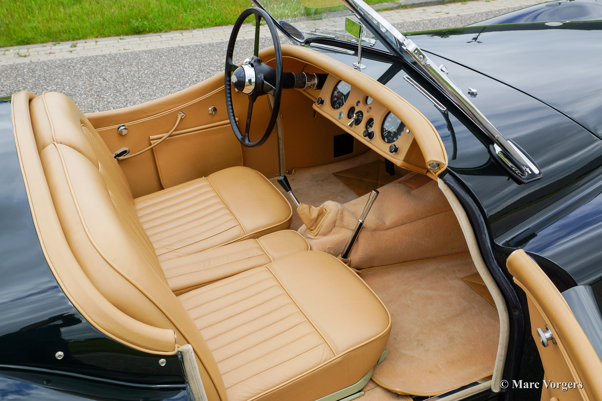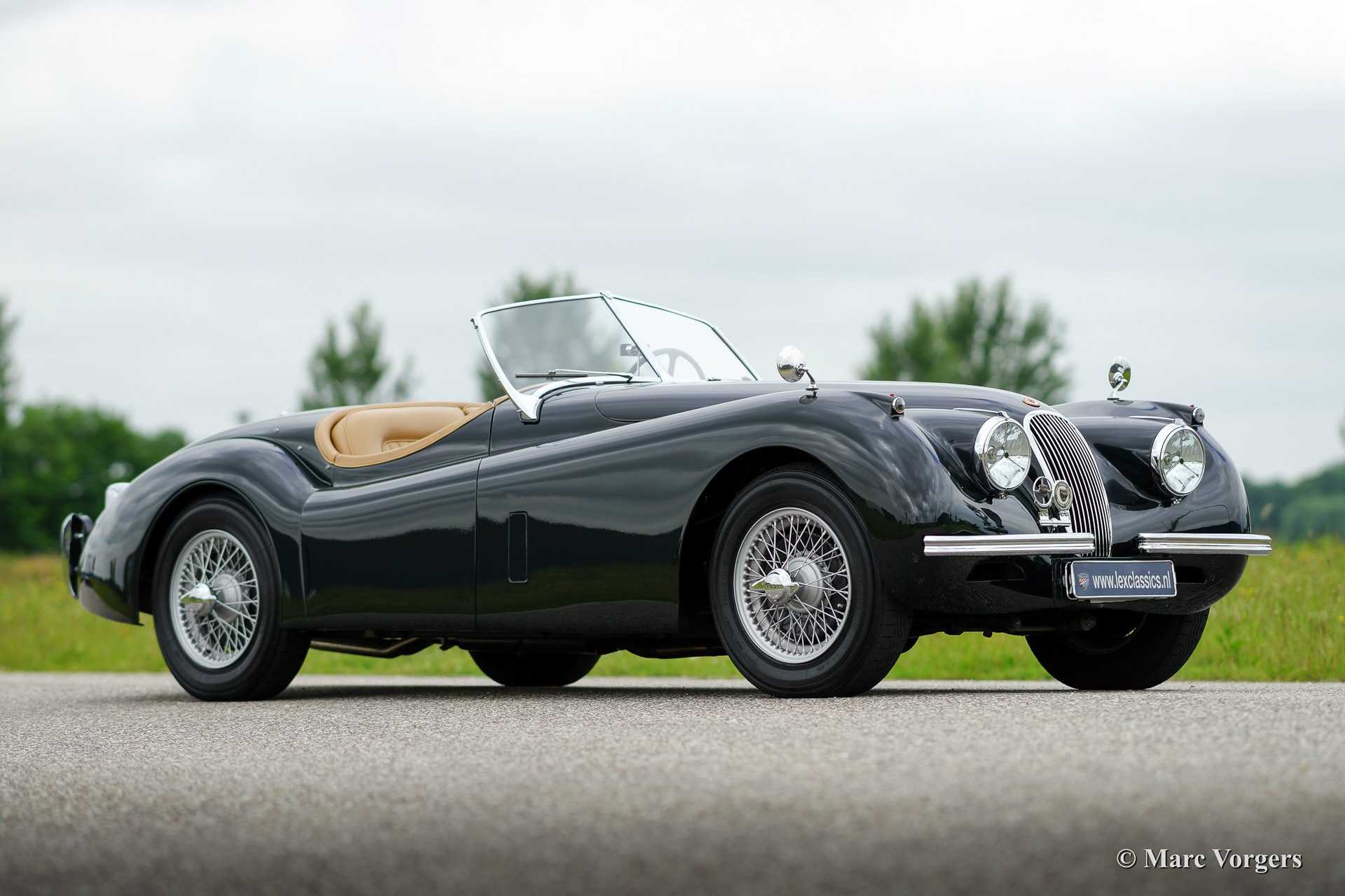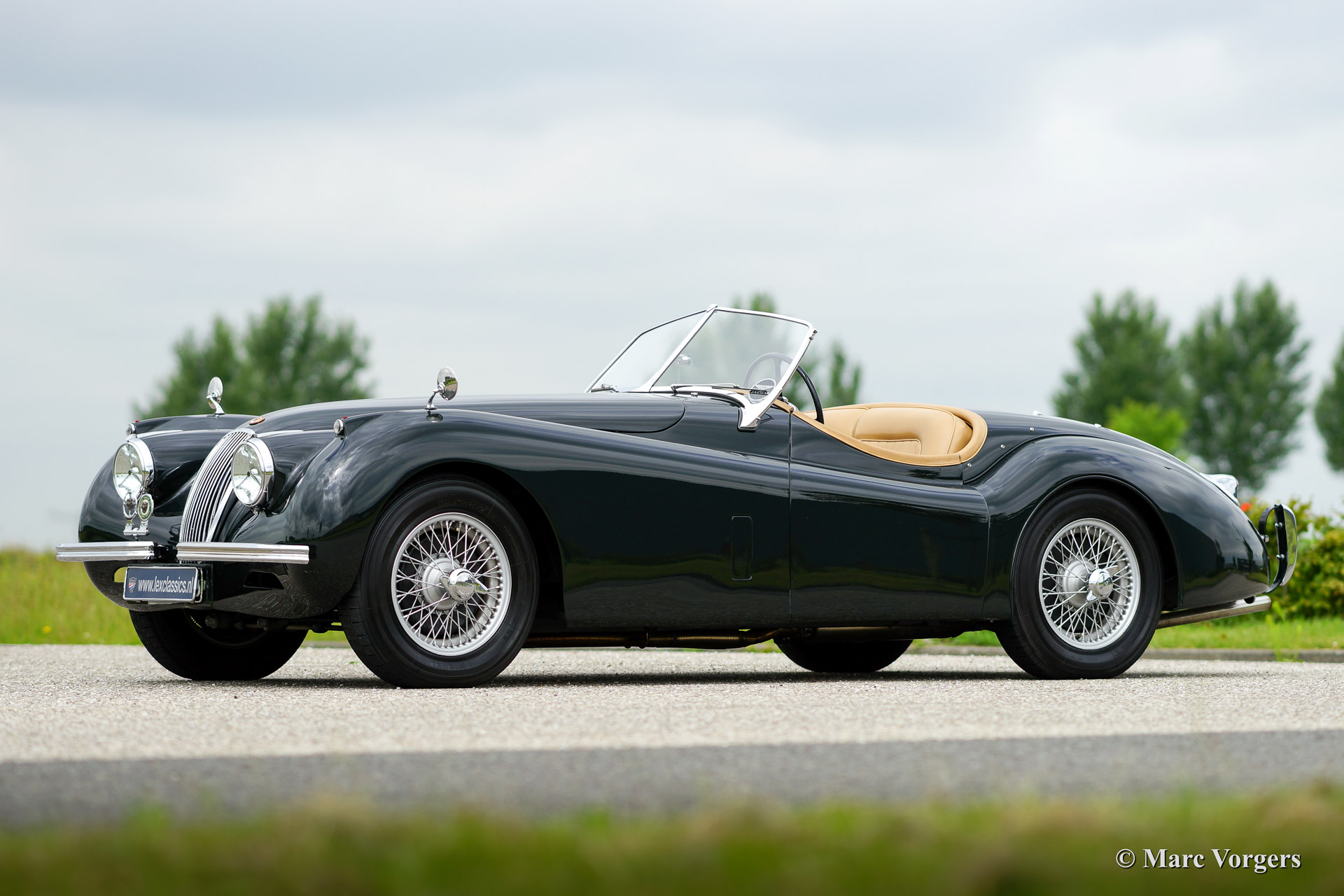 Jaguar XK 120 SE Open Two Seater (OTS/roadster), year 1954. Chassis number: S 674647. Colour British Racing Green with a beige leather interior. This fabulous Jaguar XK 120 SE roadster was sold new in the USA. This is a rare factory original Special Equipment (SE) model fitted with the more powerful engine. The automobile was imported to the Netherlands in the year 2003. The car was extensively restored, a photo reportage and documents of the restoration are present. In 2013 the XK 120 was registered and driven fro the first time. The car is in superb (excellent++) condition, concours! The automobile features silver enameled (54 spokes) wire wheels, a badge bar, tripod headlamps, a Stainless Steel exhaust system, Kenlow cooling fan, tool roll, tyre pump, crick and a grease gun. This magnificent Jaguar XK 120 SE OTS drives superbly!