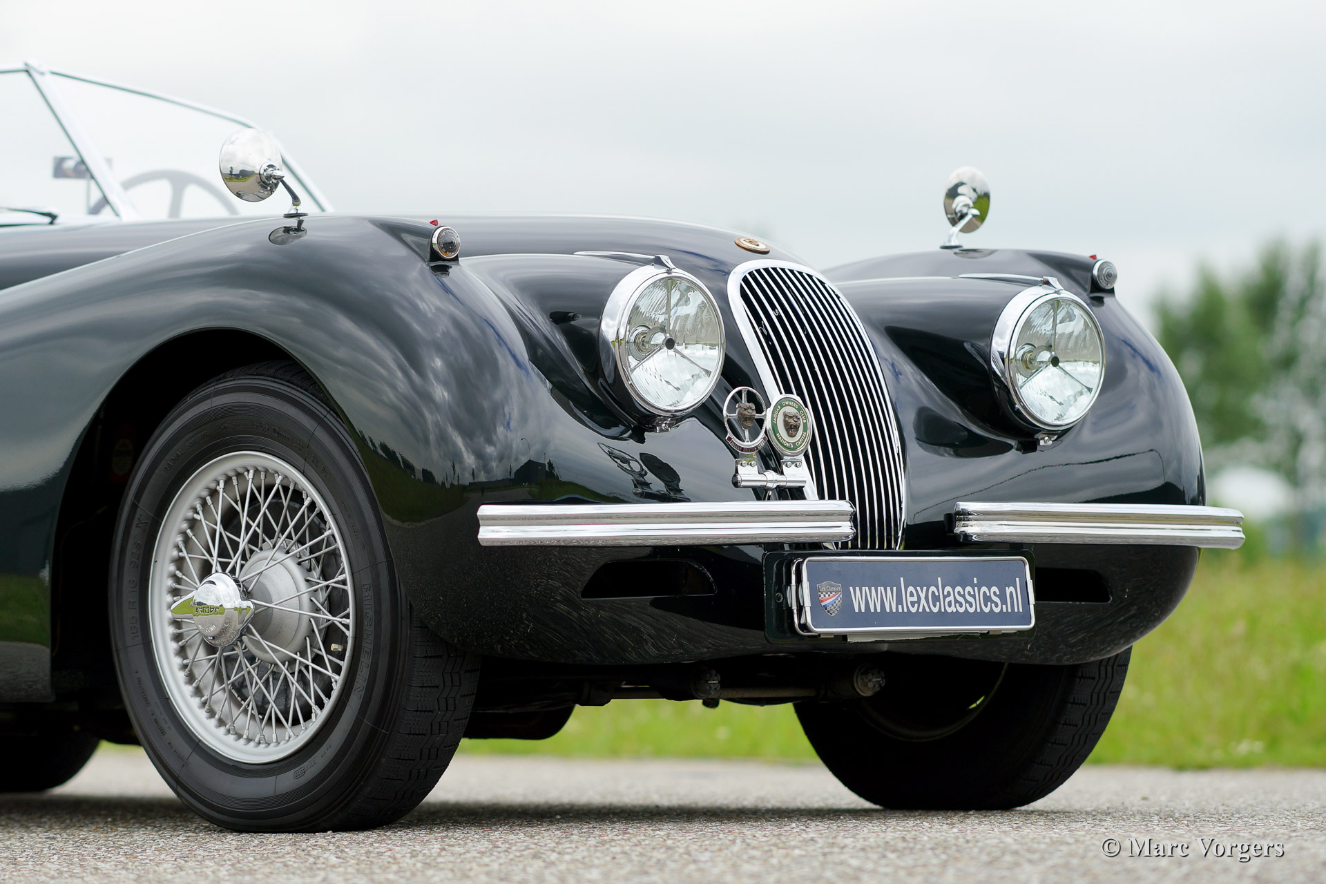 The Jaguar XK 120 was introduced in 1948, and caused an immediate sensation. The XK 120 had a top speed of 120 miles an hour (about. 200 km/h) and was the fastest production car for sale at that time. The XK 120 was designed by Jaguar’s boss and founder William Lyons. The bodywork had an almost sculptural design, with sober, well-chosen flowing lines and beautiful curves. With its exquisite long bonnet and elongated wing lines, the XK 120 has a very dynamic charisma.