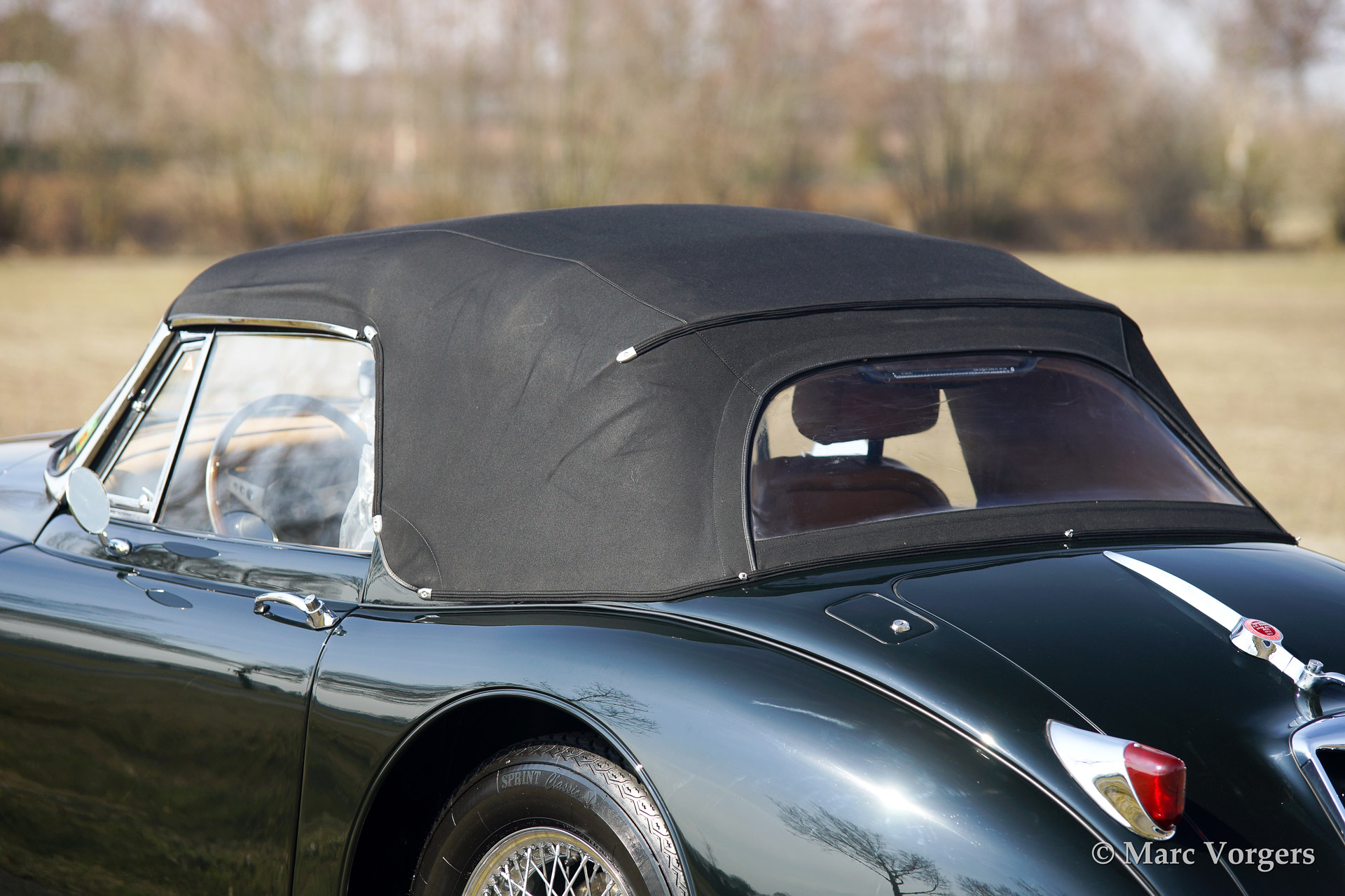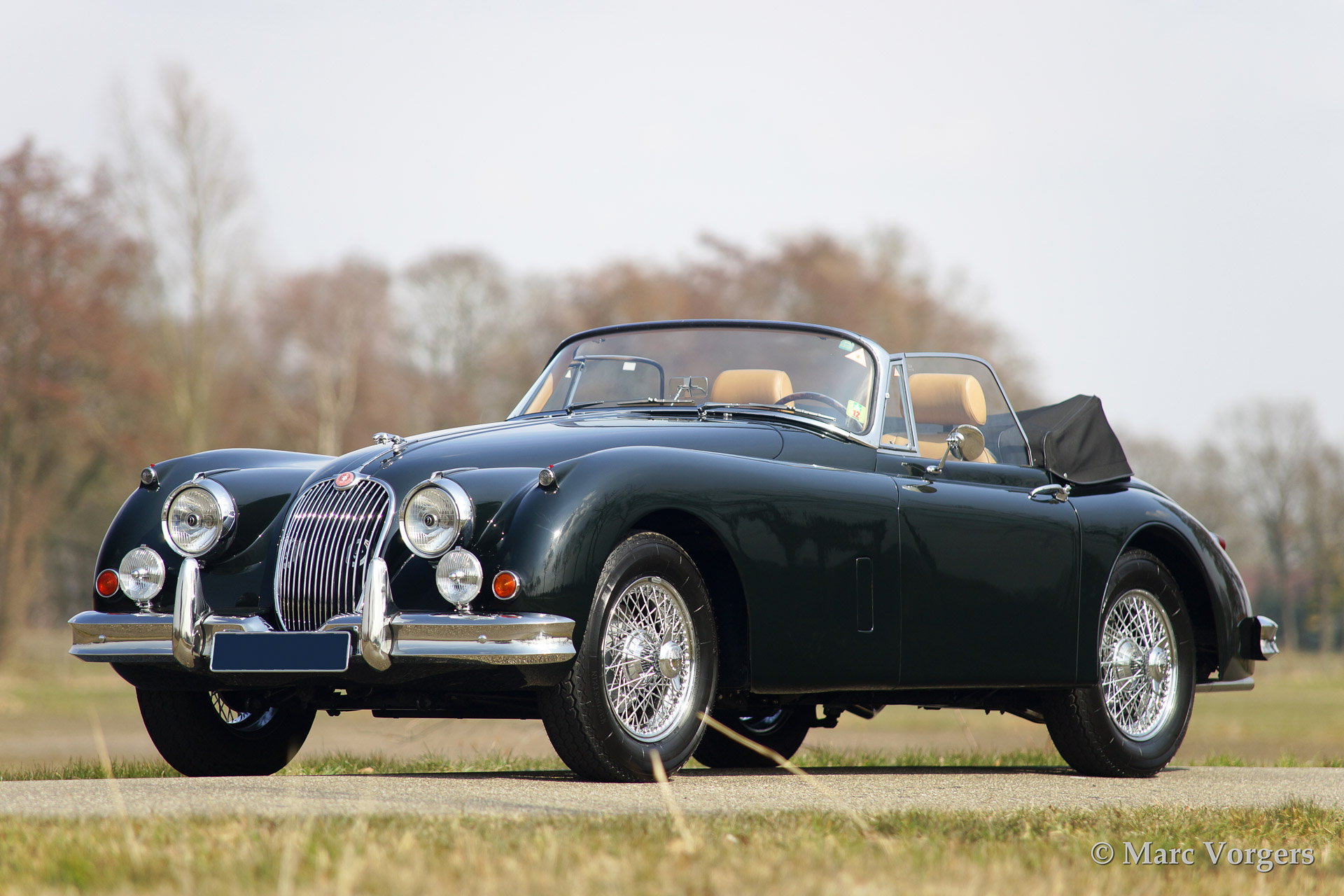 Jaguar XK 150 3.4 Litre DHC (Drophead Coupe), year 1961. Colour British Racing Green with a beige leather interior. Black mohair hood and hood cover. This very beautiful Jaguar XK Drophead Coupe was extensively and professionally restored in the past. The car features a bespoke interior with additional stowage space between the seats, special comfort seats and a sports steering wheel with wood rim. This to make the car a splendid companion for long (trans-European) travels in great style.