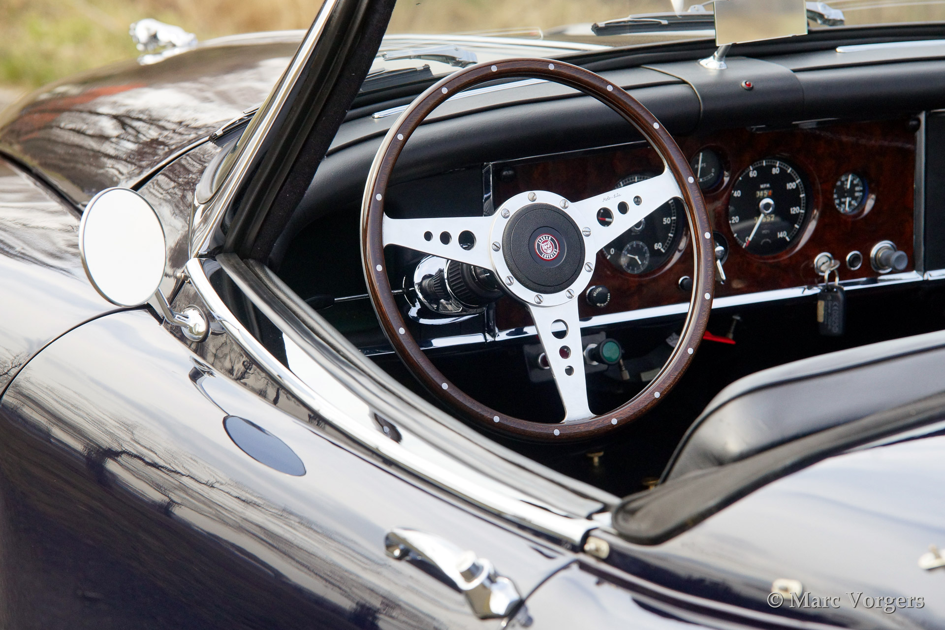 Jaguar XK 150 3.4 Litre OTS (Open Two Seater, also named roadster), year 1958. Colour dark blue with a black leather interior, black carpet and a dark blue mohair soft top. The automobile features chrome wire wheels and overdrive.