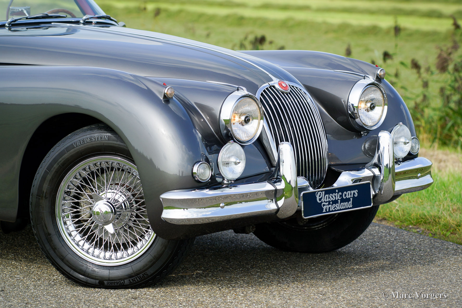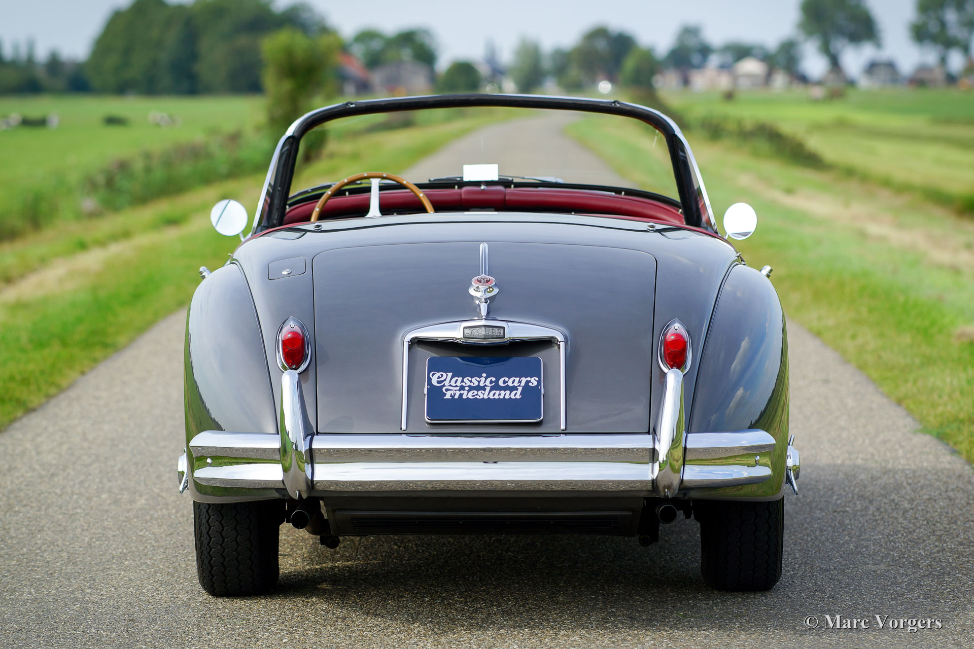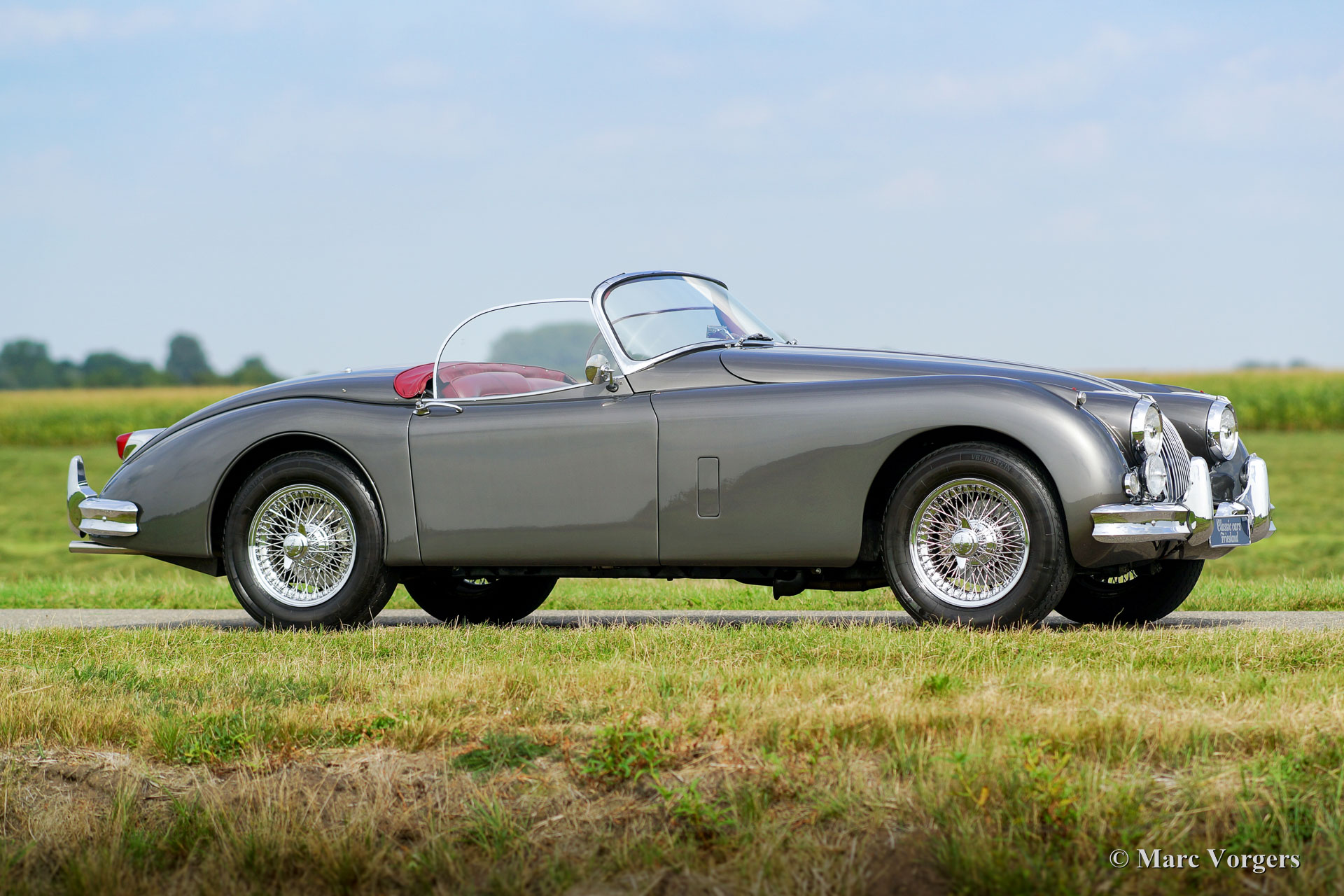 Jaguar XK 150 3.4 Liter OTS, année 1958. Couleur Gun-Metal-Gray métallisé avec un intérieur en cuir rouge foncé et un très joli tableau en noyer. Tapis rouge, capot mohair noir doux et un couvercle de tonneau noir. Ce magnifique Jaguar XK150 OTS (Open Two Seater) - ce qu'on appelle Roadster - fut restaurée détaillée et "body-off" dans le passé. Le travail fut effectué par Brooklands Classic Cars aux Pays-Bas aux standards plus hauts ! Un rapport photo complet de la restauration est présent sous la forme d'un fichier contenant toutes les factures de service et le journal de maintenance. Le manuel des propriétaires d'origine est également présent. Ce magnifique Jaguar XK 150 Roadster est superbe état et la voiture fonctionne parfaitement ! La voiture dispose d’un overdrive, d'une direction assistée, Servo freins hydraulique, un échappement en acier inoxydable, un radiateur en aluminium, allumage électronique, des roues de fil chromées, pneus Vredestein Classic, un ensemble d'outils, lampes antibrouillard Lucas originales et un volant magnifique MotoLita avec bordure en bois. C'est un Jaguar XK 150 Roadster dans une superbe condition et dans une belle combinaison de couleurs !