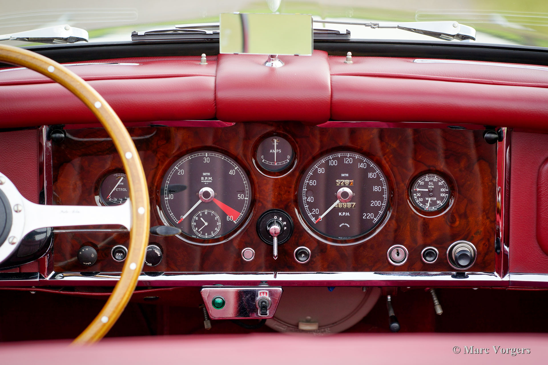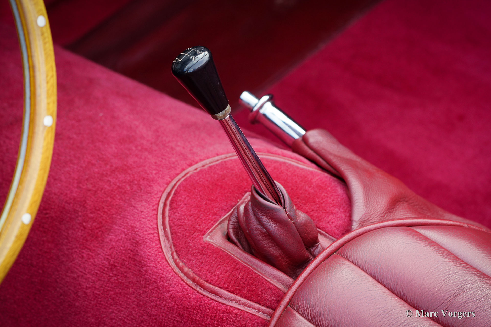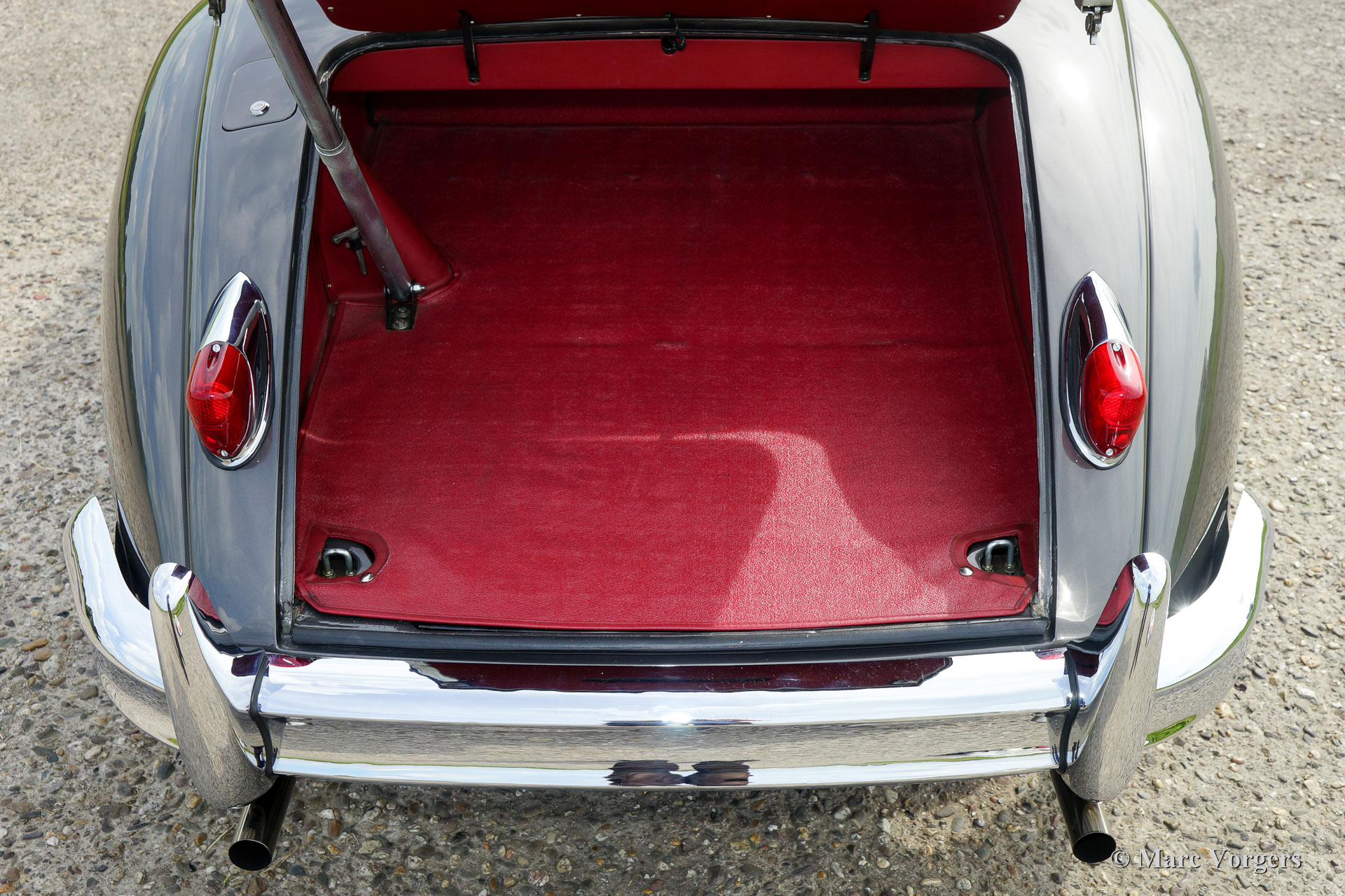 Jaguar XK 150 3.4 Liter OTS, année 1958. Couleur Gun-Metal-Gray métallisé avec un intérieur en cuir rouge foncé et un très joli tableau en noyer. Tapis rouge, capot mohair noir doux et un couvercle de tonneau noir. Ce magnifique Jaguar XK150 OTS (Open Two Seater) - ce qu'on appelle Roadster - fut restaurée détaillée et "body-off" dans le passé. Le travail fut effectué par Brooklands Classic Cars aux Pays-Bas aux standards plus hauts ! Un rapport photo complet de la restauration est présent sous la forme d'un fichier contenant toutes les factures de service et le journal de maintenance. Le manuel des propriétaires d'origine est également présent. Ce magnifique Jaguar XK 150 Roadster est superbe état et la voiture fonctionne parfaitement ! La voiture dispose d’un overdrive, d'une direction assistée, Servo freins hydraulique, un échappement en acier inoxydable, un radiateur en aluminium, allumage électronique, des roues de fil chromées, pneus Vredestein Classic, un ensemble d'outils, lampes antibrouillard Lucas originales et un volant magnifique MotoLita avec bordure en bois. C'est un Jaguar XK 150 Roadster dans une superbe condition et dans une belle combinaison de couleurs !