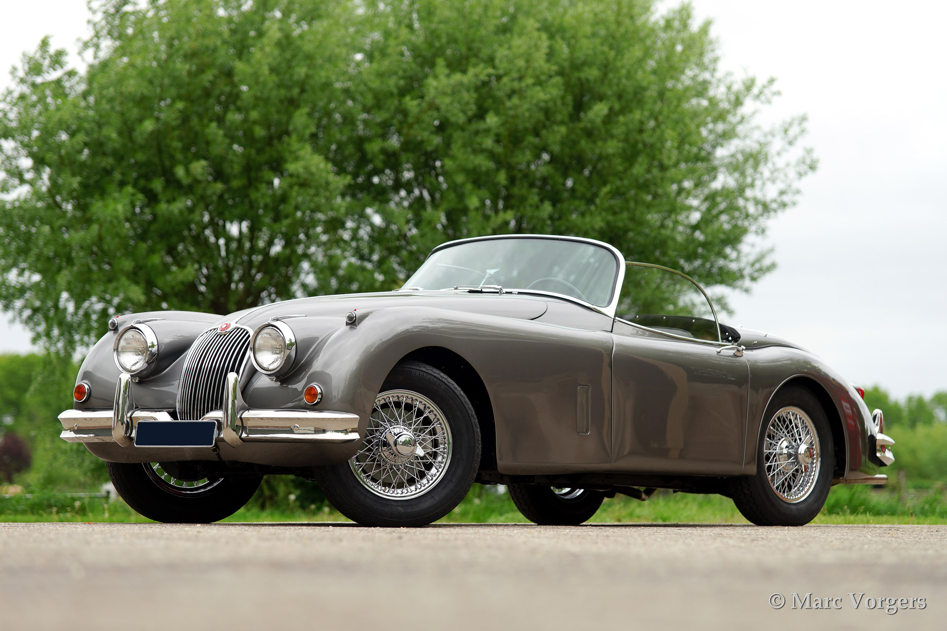 Jaguar XK 150 3.4 Litre Open Two Seater, year 1958. Colour 'Gun Metal' grey metallic with a black leather interior. This beautiful Jaguar XK 150 OTS has been extensively restored. The automobile is fitted with a manual gearbox, overdrive and chrome wire wheels.