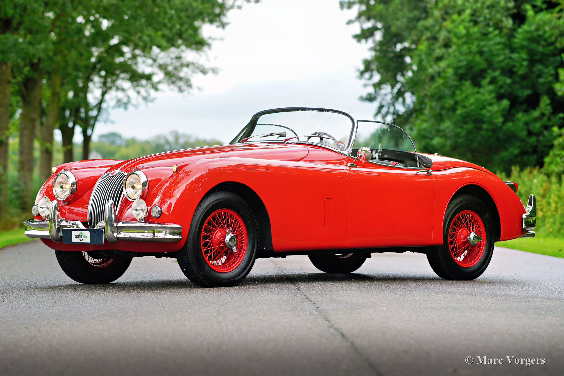 Jaguar XK 150 3,4 litres OTS (roadster), année 1959. Couleur rouge Carmen associée à un intérieur en cuir noir garni de moquette noire. Capote et couvre-caisse noirs. Cette glorieuse Jaguar XK 150 OTS (Open Two Seater, également appelée roadster aux USA) a été vendue neuve aux États-Unis. La voiture fut importée aux Pays-Bas en 1986 et achetée par le dernier propriétaire en 2001. L'historique (d'entretien) est entièrement documenté depuis 2009. Un certificat Heritage est présent et les informations indiquent qu'il s'agit d'une Jaguar « matching number » ! L'automobile est en très bon état et tout est à jour. La carrosserie présente un ajustement parfait des panneaux, une belle peinture et de magnifiques garnitures chromées. Le moteur six cylindres XK fut révisé en 2014 par un spécialiste aux Pays-Bas. En 2016, la direction assistée électrique EZ a été installée. Les 215 chevaux au freinage sont transmis aux roues arrière via une boîte de vitesses manuelle à quatre rapports avec overdrive. Ce roadster XK 150 roule parfaitement, c'est l'un des meilleurs exemplaires que nous n’ayons jamais conduits ! La voiture présente tous les détails d'origine et présente des options souhaitables telles que le centre du tableau de bord en bois, des roues à rayons de 16 pouces chaussées de pneus Vredestein Sprint Classic, une paire de feux antibrouillard/de virage Lucas SFT576 à l'avant, des freins assistés, un allumage électronique, un ventilateur électrique, des ceintures de sécurité rouges et une radio « rétro » avec navigation par satellite. Il s’agit d’une très désirable Jaguar XK 150 OTS (Roadster) dans un état merveilleux, une fantastique voiture de conducteur classique qui apportera beaucoup de plaisir de conduite à un fier nouveau propriétaire. La Jaguar XK 150 3,4 litres OTS est une voiture rare, seuls 1339 exemplaires furent construits.