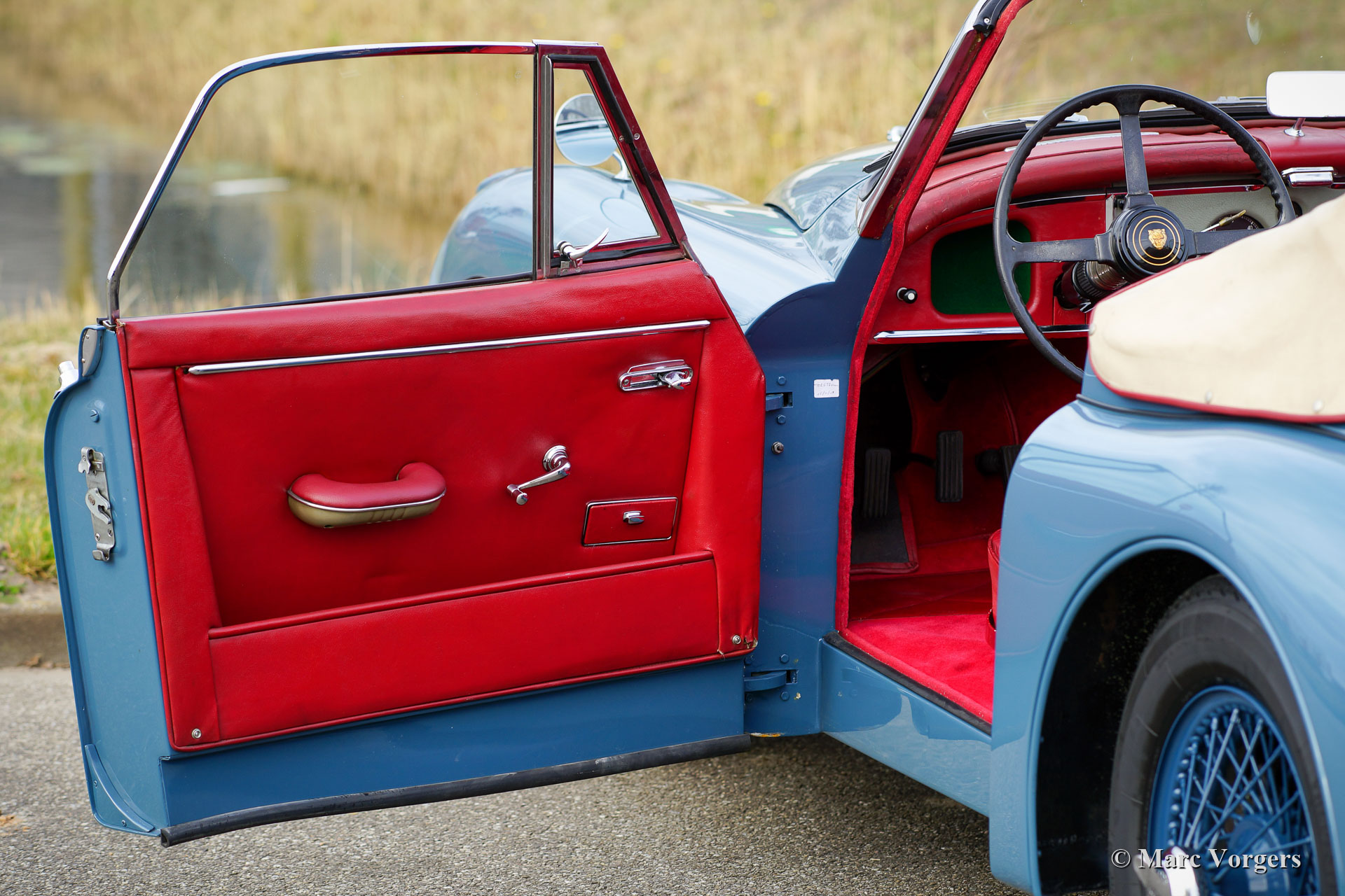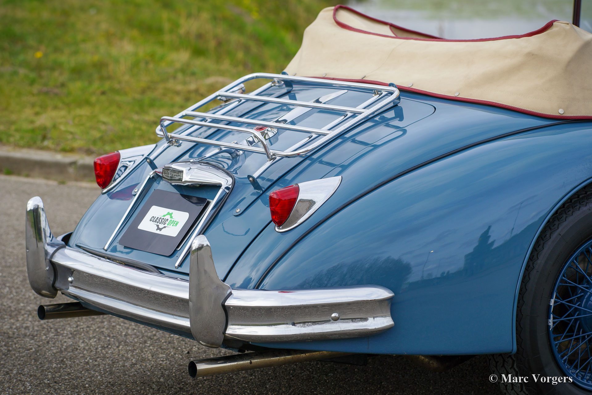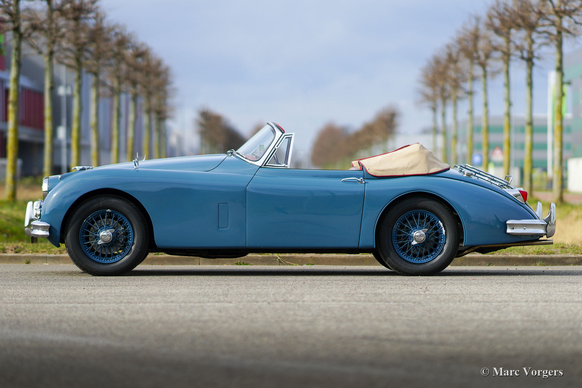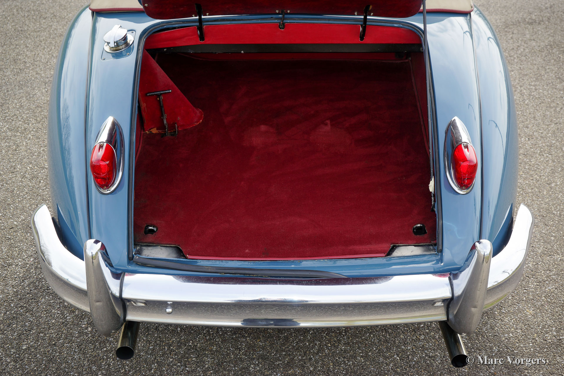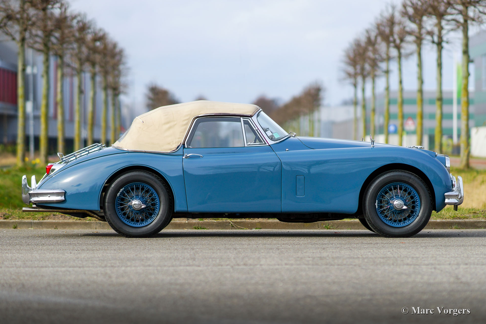 Jaguar XK 150 DHC, 1959. Couleur bleu Cotswold combiné avec des roues à rayons bleues et un intérieur en cuir rouge garni de tapis rouge. Cette magnifique Jaguar XK 150 DHC (Drop Head Coupe) a été vendue neuve aux USA. L'automobile fut bien entretenue au fil des ans, la voiture est dans un bon à très bon état de conduite avec de légers signes d'utilisation et d'âge. Cette Jaguar XK 150 DHC est un véritable « tourneur de têtes » avec son apparence élégante, sa magnifique palette de couleurs et sa note d'échappement sportive. Ce XK 150 n'offre pas seulement du spectacle, mais le nouveau propriétaire fier est également prêt pour beaucoup d'aller ! La voiture est équipée d'un puissant moteur de 4,2 litres (Jaguar type E 265 ch), d'une boîte de vitesses manuelle à 5 rapports moderne et d'un système d'échappement en acier inoxydable. Cette Jaguar XK 150 roule et gère une puissance impressionnante ! La puissance de freinage est également bien prise en compte, la voiture est équipée de freins à disque servo sur les quatre roues. De plus, cette magnifique Jaguar est équipée de ceintures de sécurité, de phares antibrouillard Lucas SFT576 à large faisceau à l'avant et d'un porte-bagages chromé sur le couvercle du coffre. Il s'agit d'une impressionnante voiture de conducteur Jaguar XK 150 DHC qui peut être appréciée au maximum !