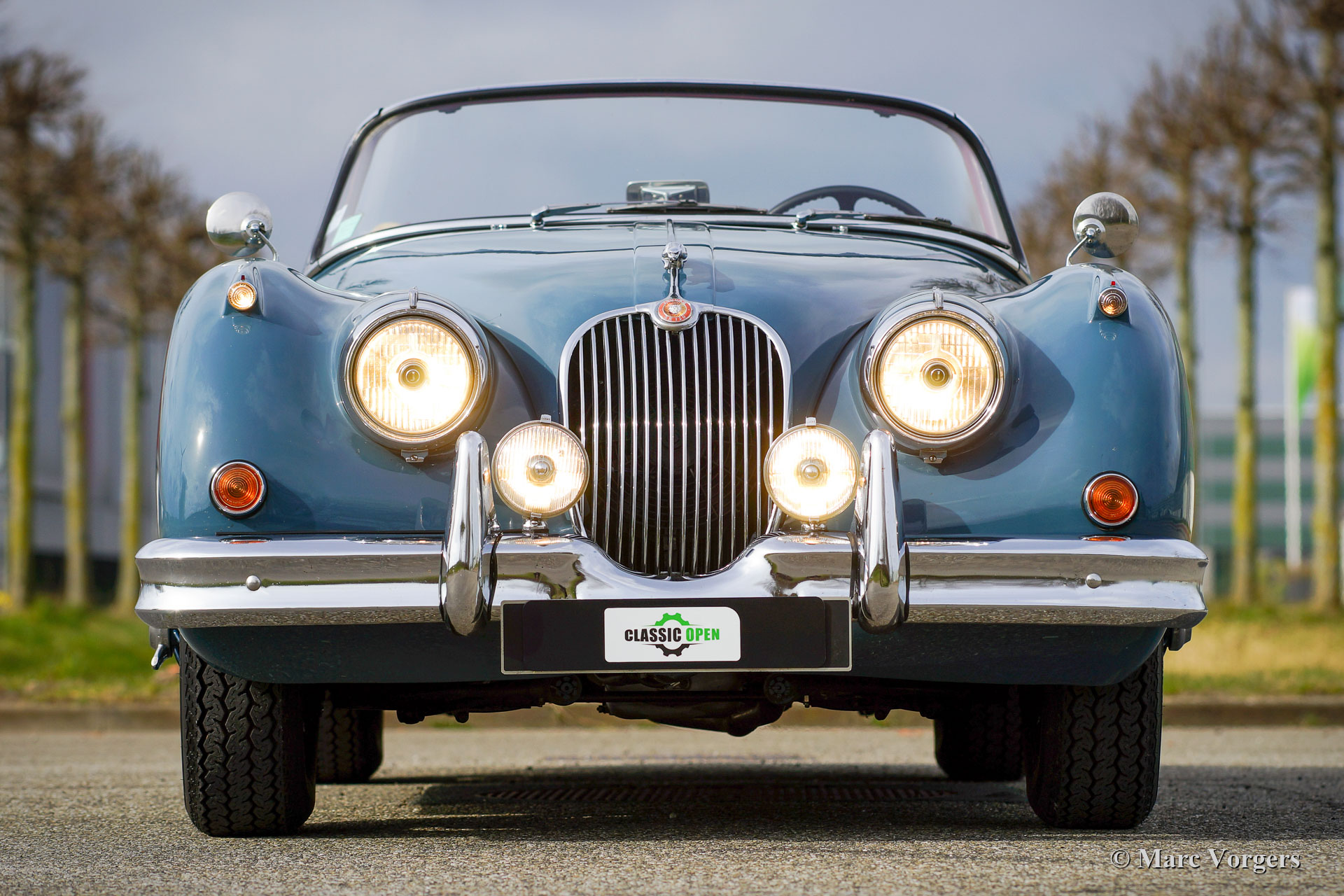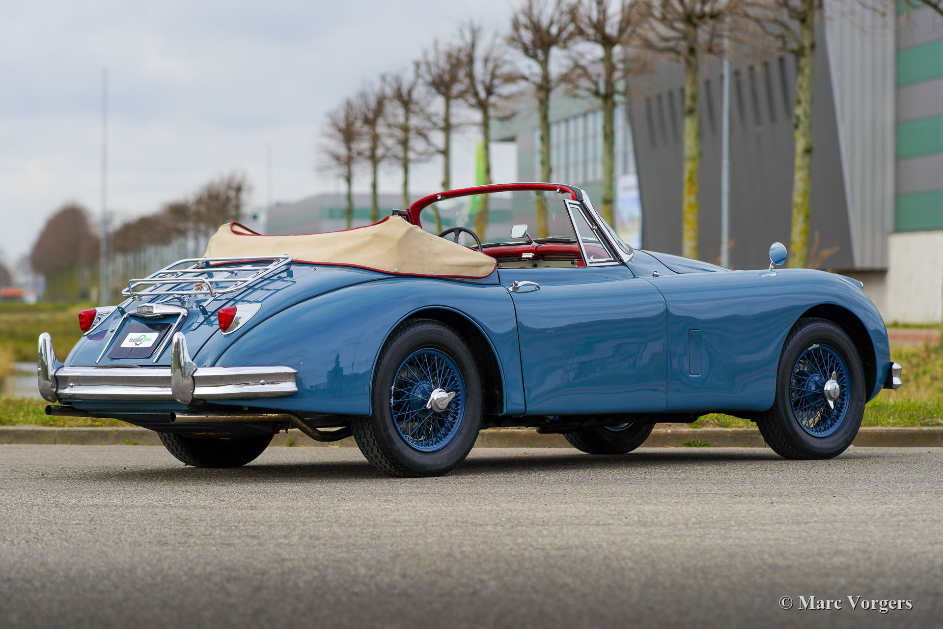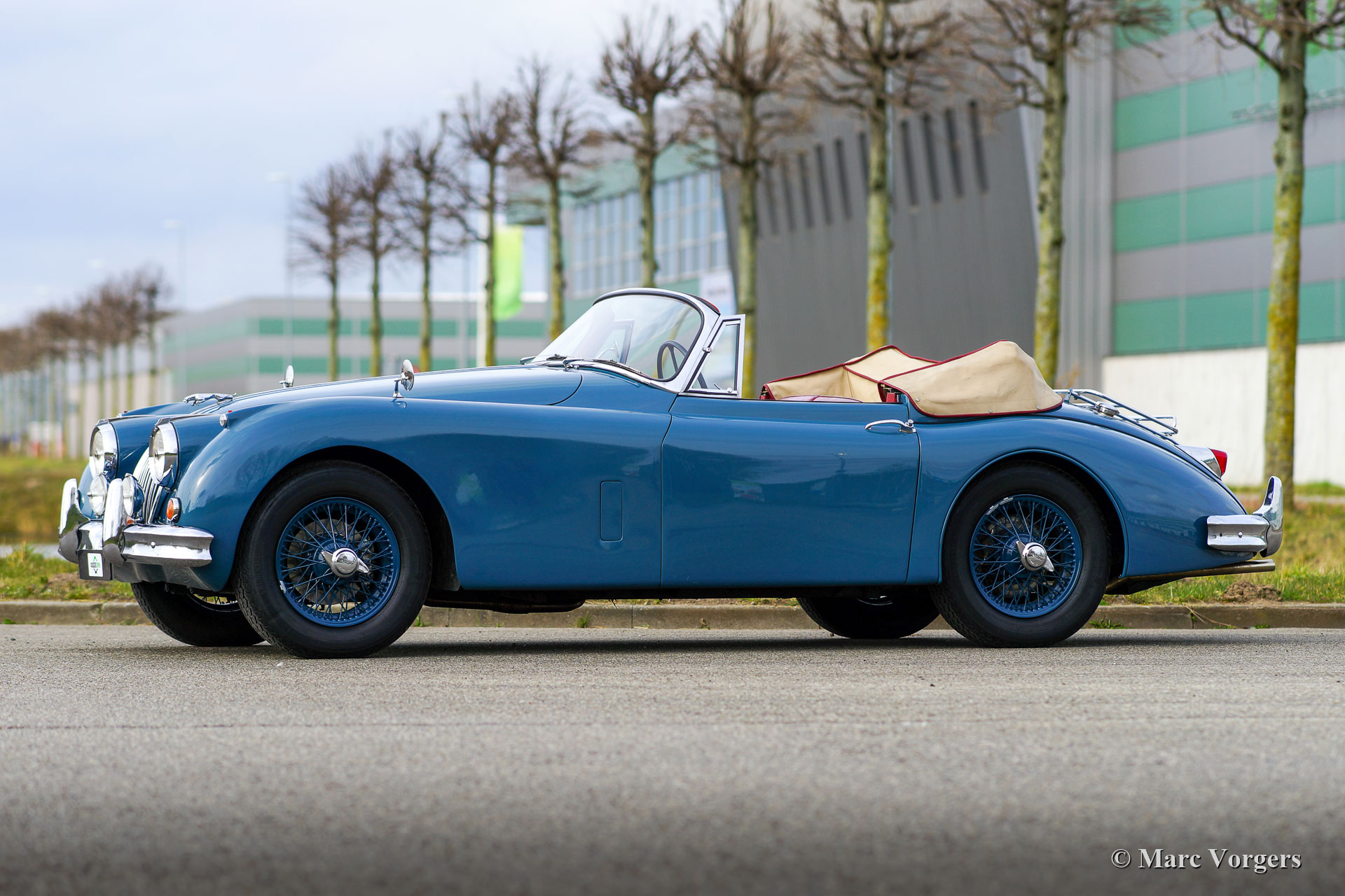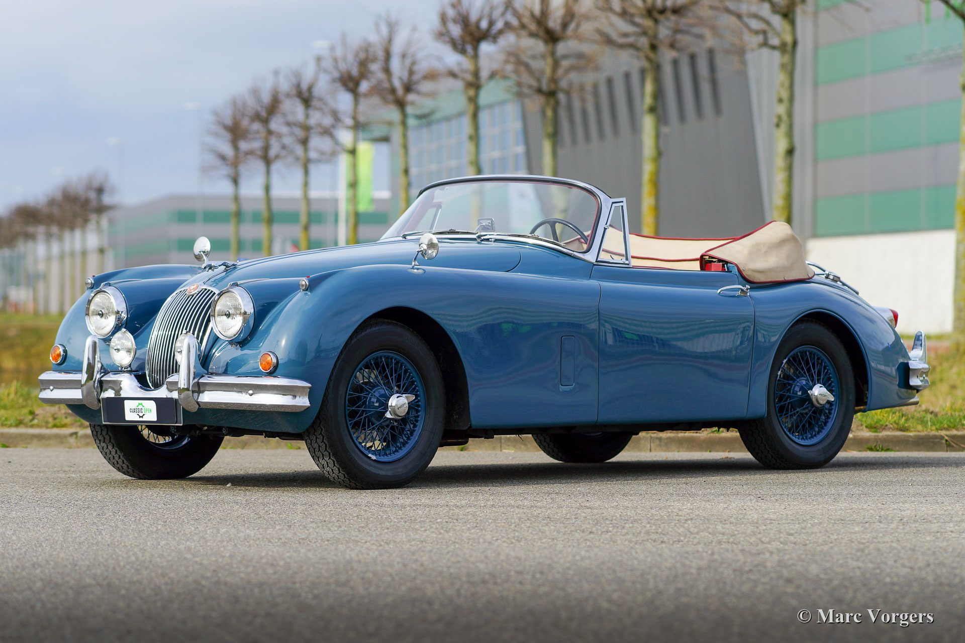 Jaguar XK 150 DHC, 1959. Couleur bleu Cotswold combiné avec des roues à rayons bleues et un intérieur en cuir rouge garni de tapis rouge. Cette magnifique Jaguar XK 150 DHC (Drop Head Coupe) a été vendue neuve aux USA. L'automobile fut bien entretenue au fil des ans, la voiture est dans un bon à très bon état de conduite avec de légers signes d'utilisation et d'âge. Cette Jaguar XK 150 DHC est un véritable « tourneur de têtes » avec son apparence élégante, sa magnifique palette de couleurs et sa note d'échappement sportive. Ce XK 150 n'offre pas seulement du spectacle, mais le nouveau propriétaire fier est également prêt pour beaucoup d'aller ! La voiture est équipée d'un puissant moteur de 4,2 litres (Jaguar type E 265 ch), d'une boîte de vitesses manuelle à 5 rapports moderne et d'un système d'échappement en acier inoxydable. Cette Jaguar XK 150 roule et gère une puissance impressionnante ! La puissance de freinage est également bien prise en compte, la voiture est équipée de freins à disque servo sur les quatre roues. De plus, cette magnifique Jaguar est équipée de ceintures de sécurité, de phares antibrouillard Lucas SFT576 à large faisceau à l'avant et d'un porte-bagages chromé sur le couvercle du coffre. Il s'agit d'une impressionnante voiture de conducteur Jaguar XK 150 DHC qui peut être appréciée au maximum !