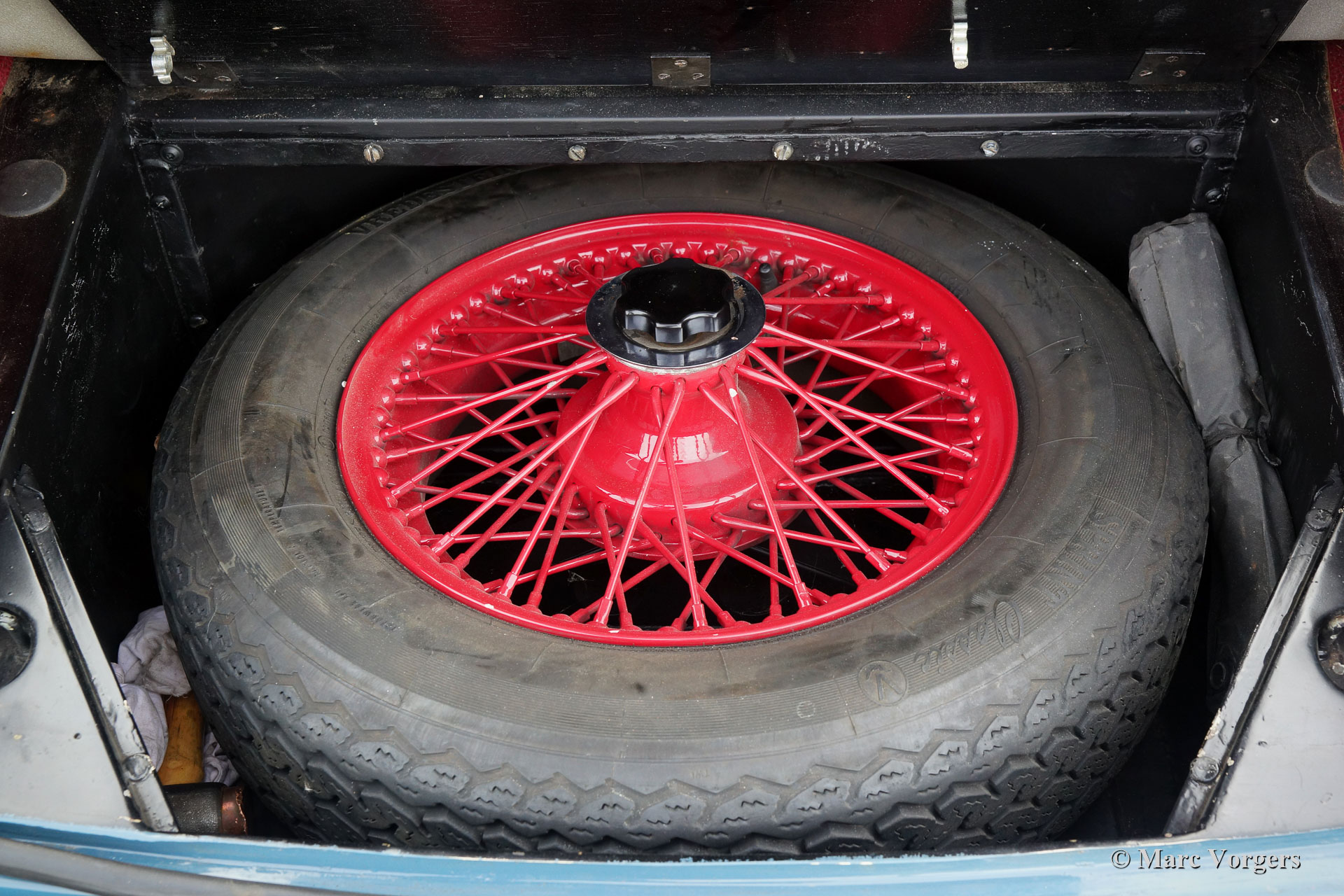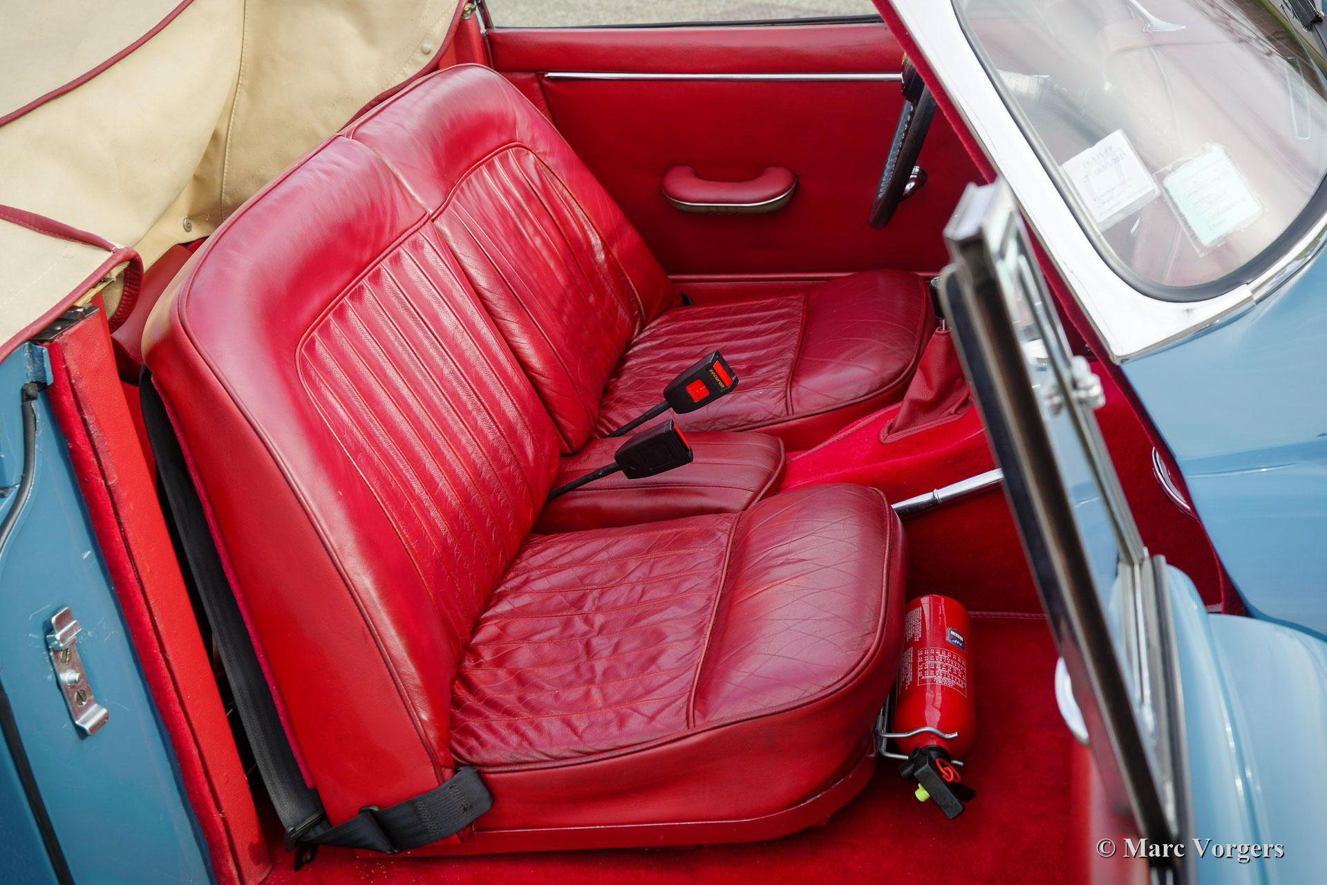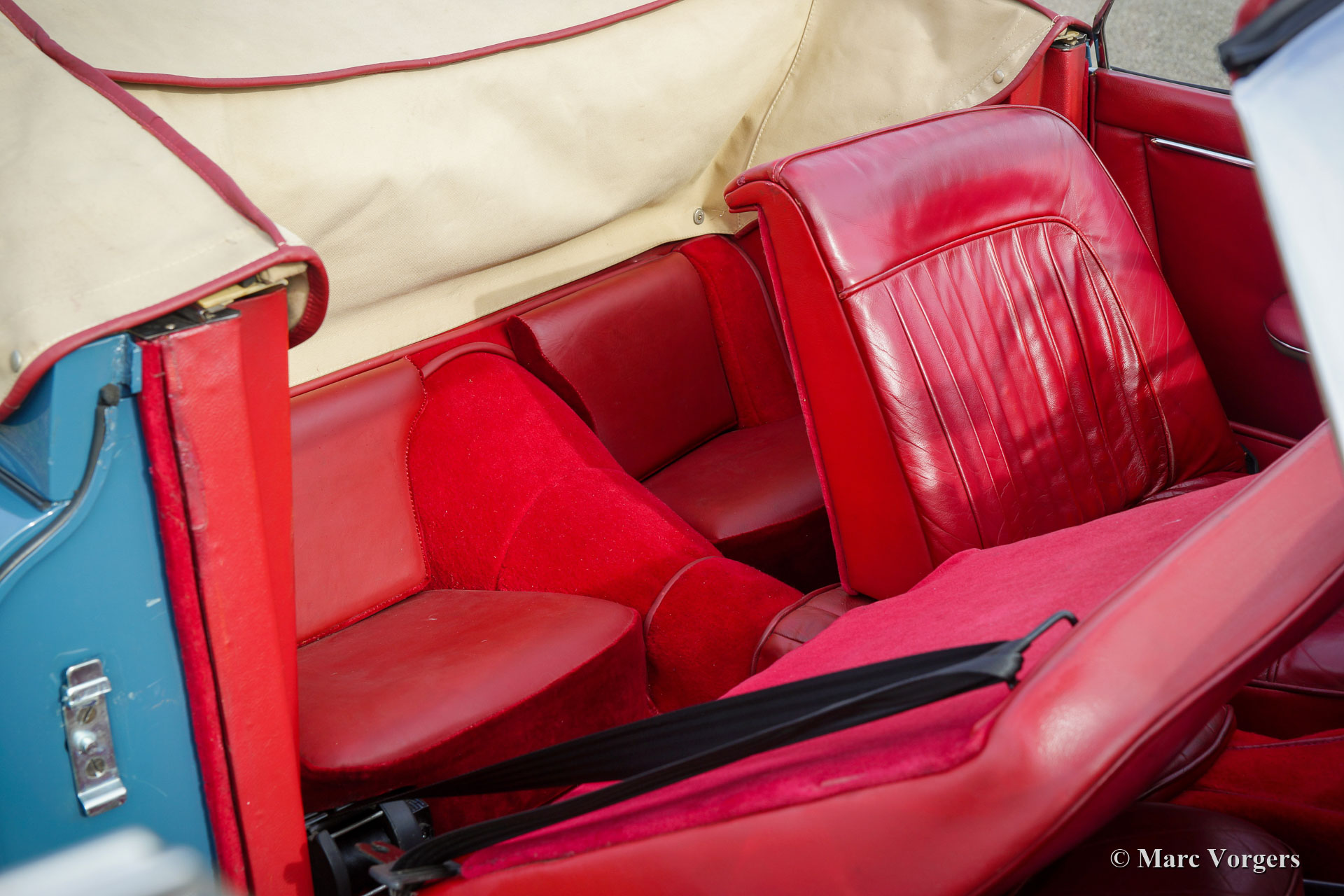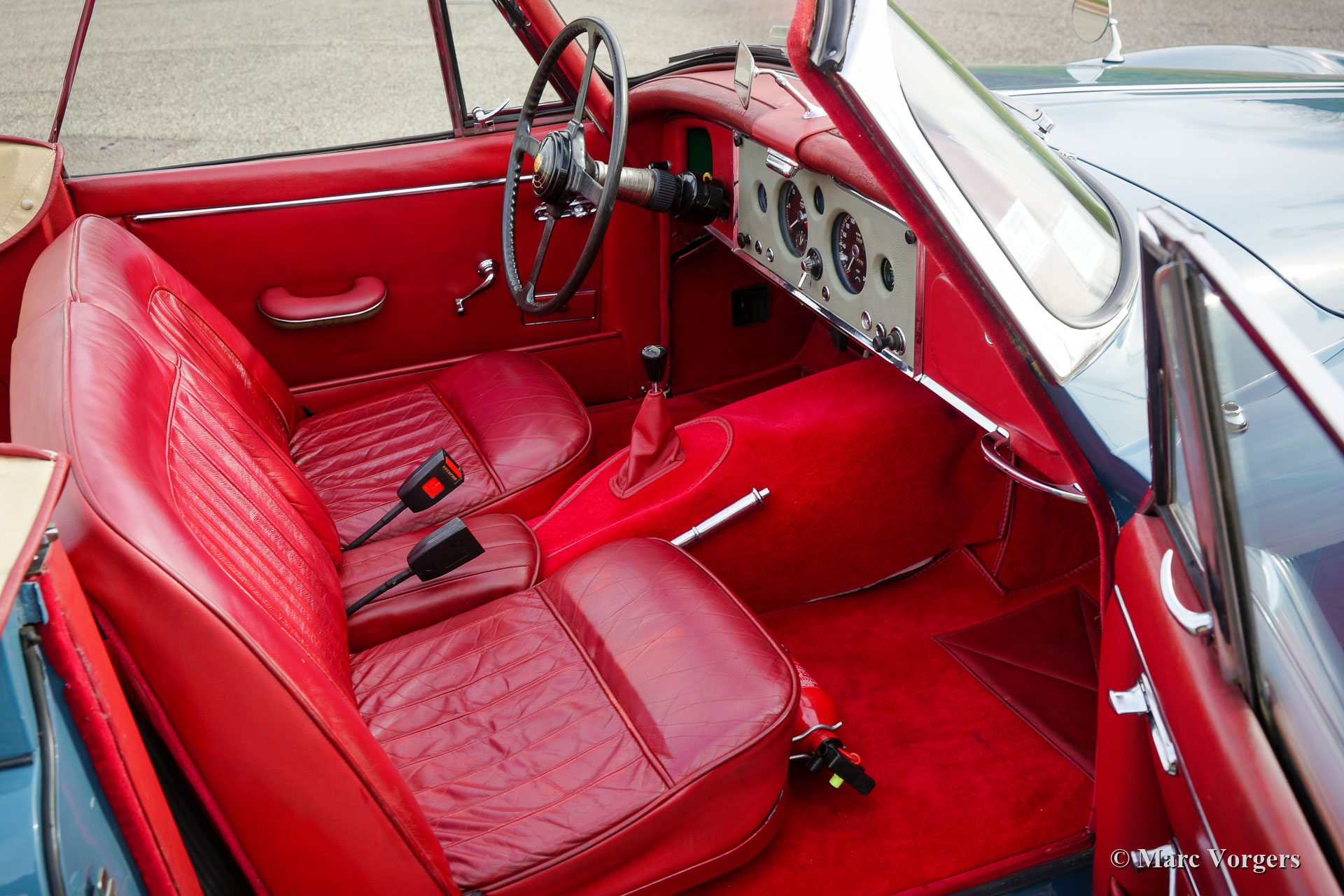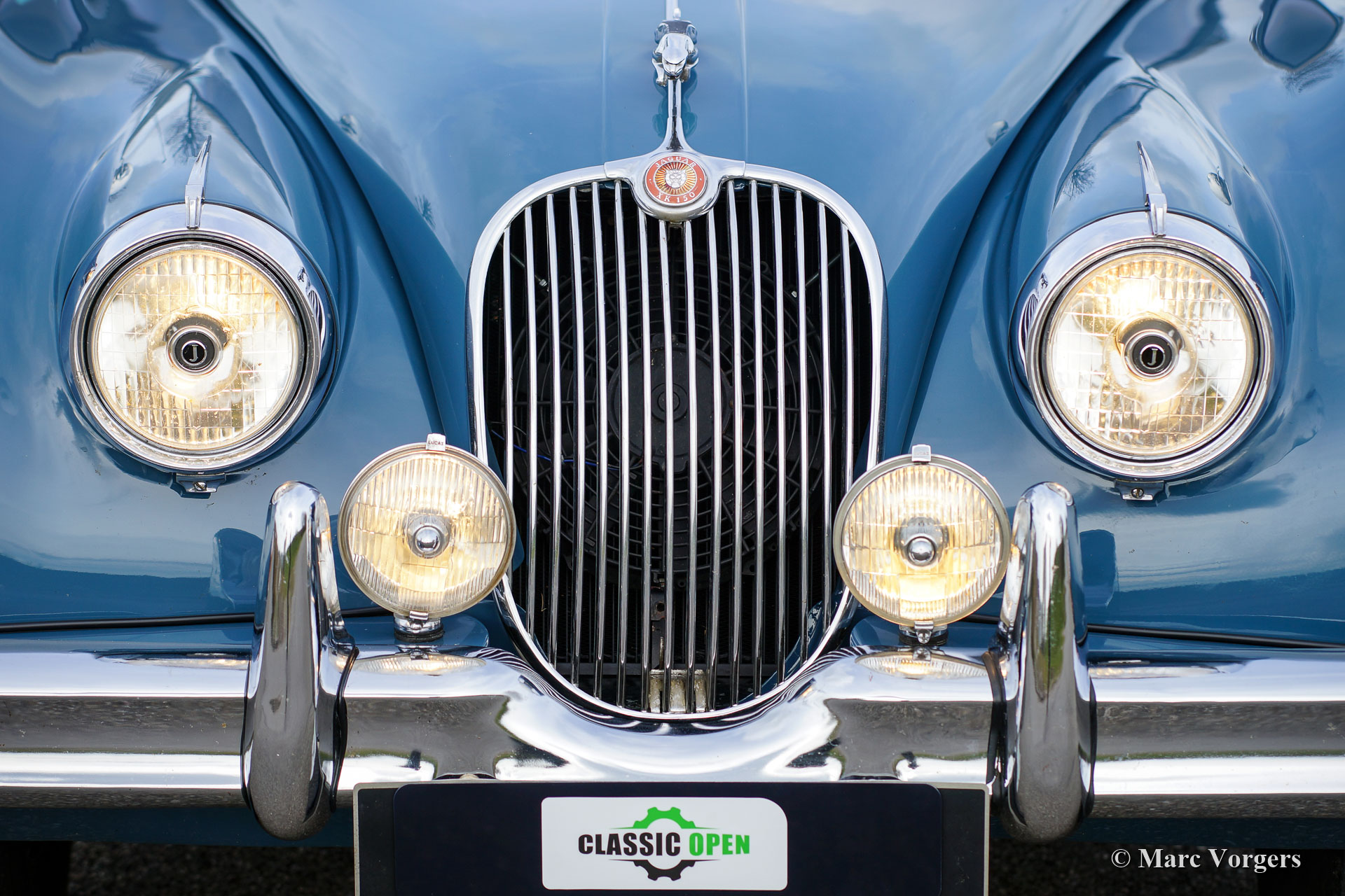Jaguar XK 150 DHC, 1959. Couleur bleu Cotswold combiné avec des roues à rayons bleues et un intérieur en cuir rouge garni de tapis rouge. Cette magnifique Jaguar XK 150 DHC (Drop Head Coupe) a été vendue neuve aux USA. L'automobile fut bien entretenue au fil des ans, la voiture est dans un bon à très bon état de conduite avec de légers signes d'utilisation et d'âge. Cette Jaguar XK 150 DHC est un véritable « tourneur de têtes » avec son apparence élégante, sa magnifique palette de couleurs et sa note d'échappement sportive. Ce XK 150 n'offre pas seulement du spectacle, mais le nouveau propriétaire fier est également prêt pour beaucoup d'aller ! La voiture est équipée d'un puissant moteur de 4,2 litres (Jaguar type E 265 ch), d'une boîte de vitesses manuelle à 5 rapports moderne et d'un système d'échappement en acier inoxydable. Cette Jaguar XK 150 roule et gère une puissance impressionnante ! La puissance de freinage est également bien prise en compte, la voiture est équipée de freins à disque servo sur les quatre roues. De plus, cette magnifique Jaguar est équipée de ceintures de sécurité, de phares antibrouillard Lucas SFT576 à large faisceau à l'avant et d'un porte-bagages chromé sur le couvercle du coffre. Il s'agit d'une impressionnante voiture de conducteur Jaguar XK 150 DHC qui peut être appréciée au maximum !