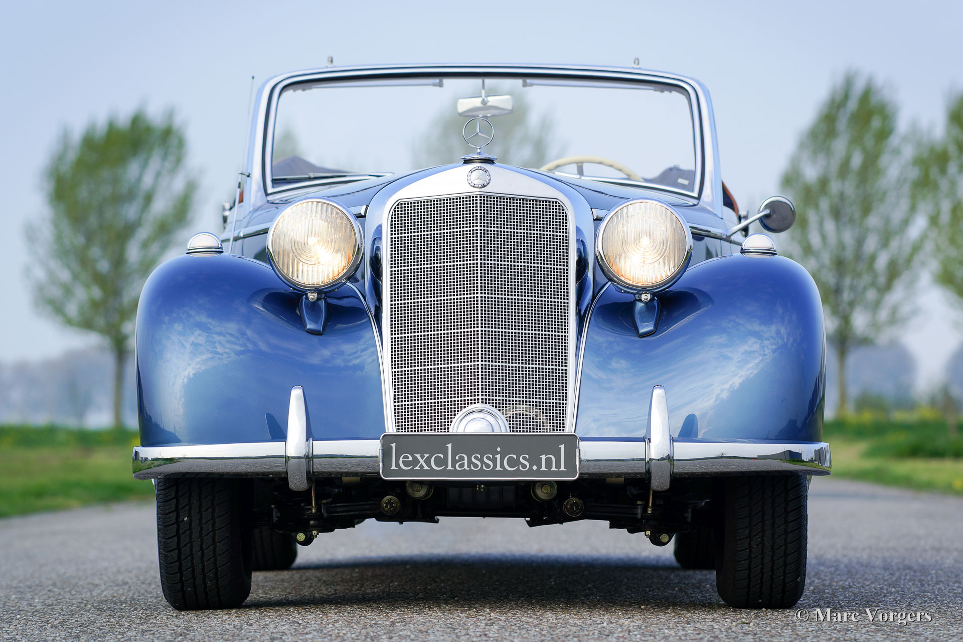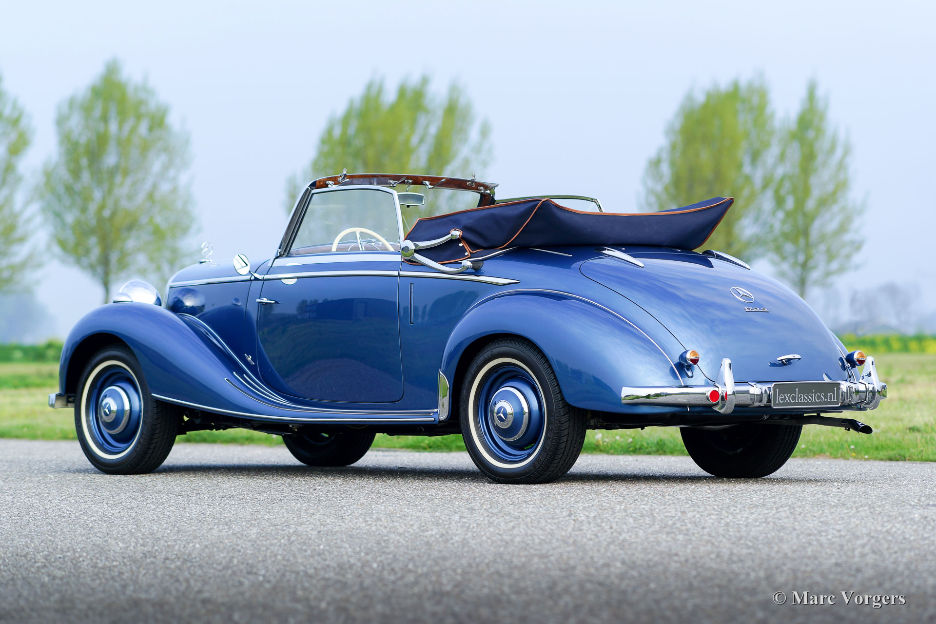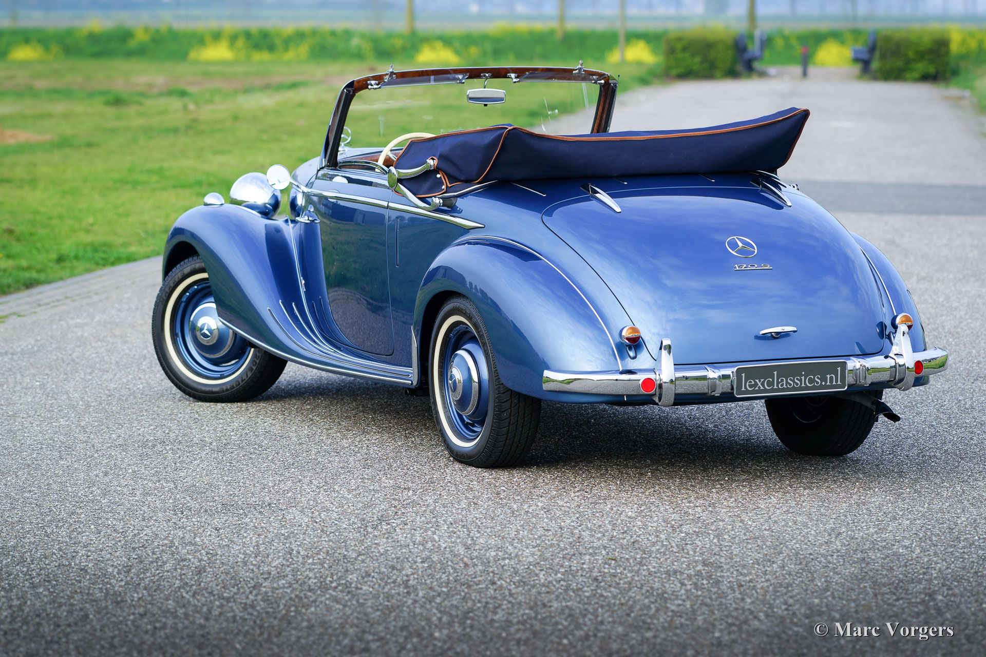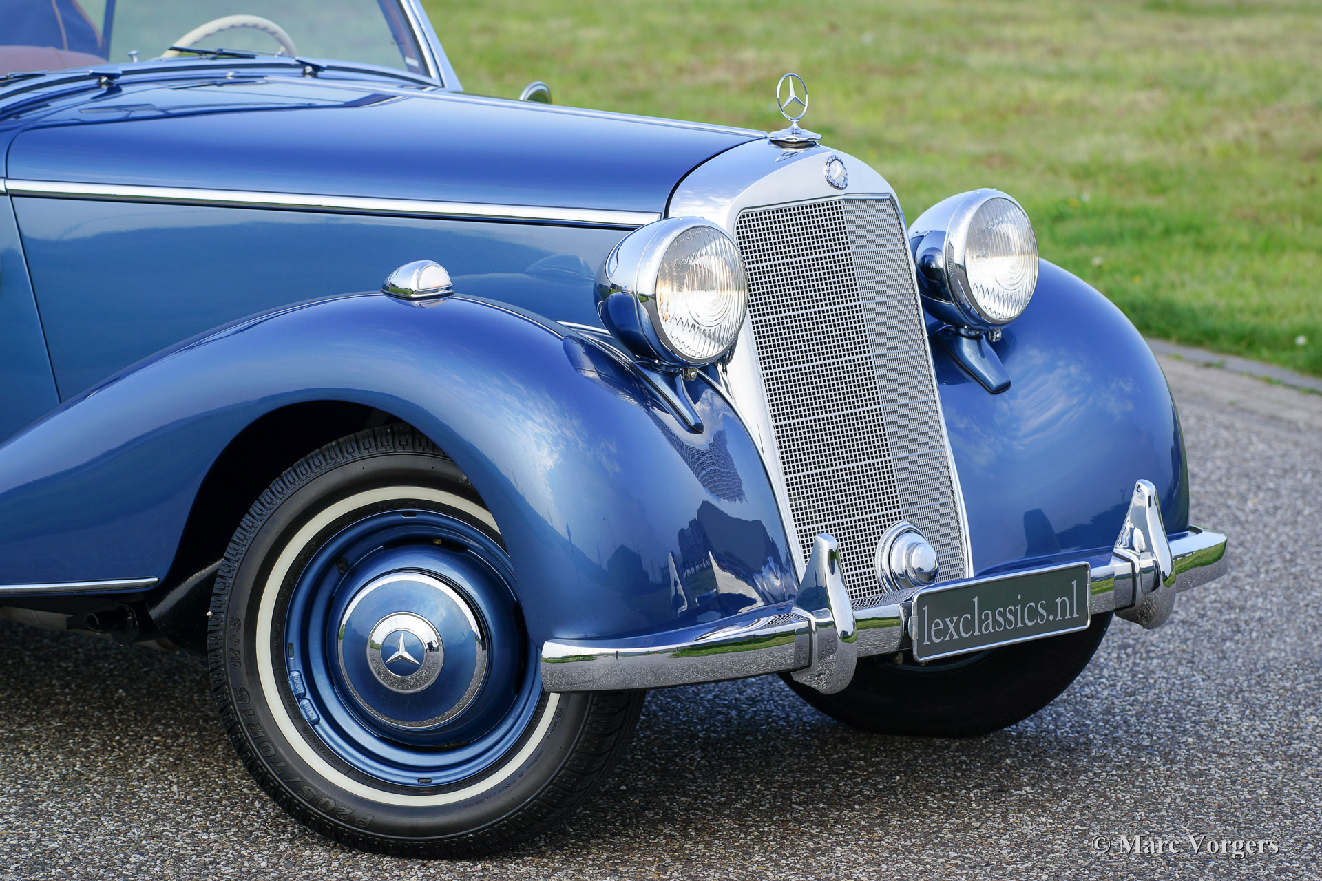 Mercedes-Benz 170 S cabriolet A, année 1950, Couleur bleu métallique avec un intérieur en cuir brun. Cette merveilleuse Mercedes-Benz fut restaurée superbement à la condition du concours ces dernières années. Chaque fois que vous regardez, chaque détail montre la perfection. Au cours du construction, des nombreuses nouvelles pièces d'origine ont été utilisées. Un reportage photo de cette restauration supérieure est présent. L'automobile est livrée avec un ensemble de troncs, fait sur mesure, dans la chaussure. Un spécimen TOP !