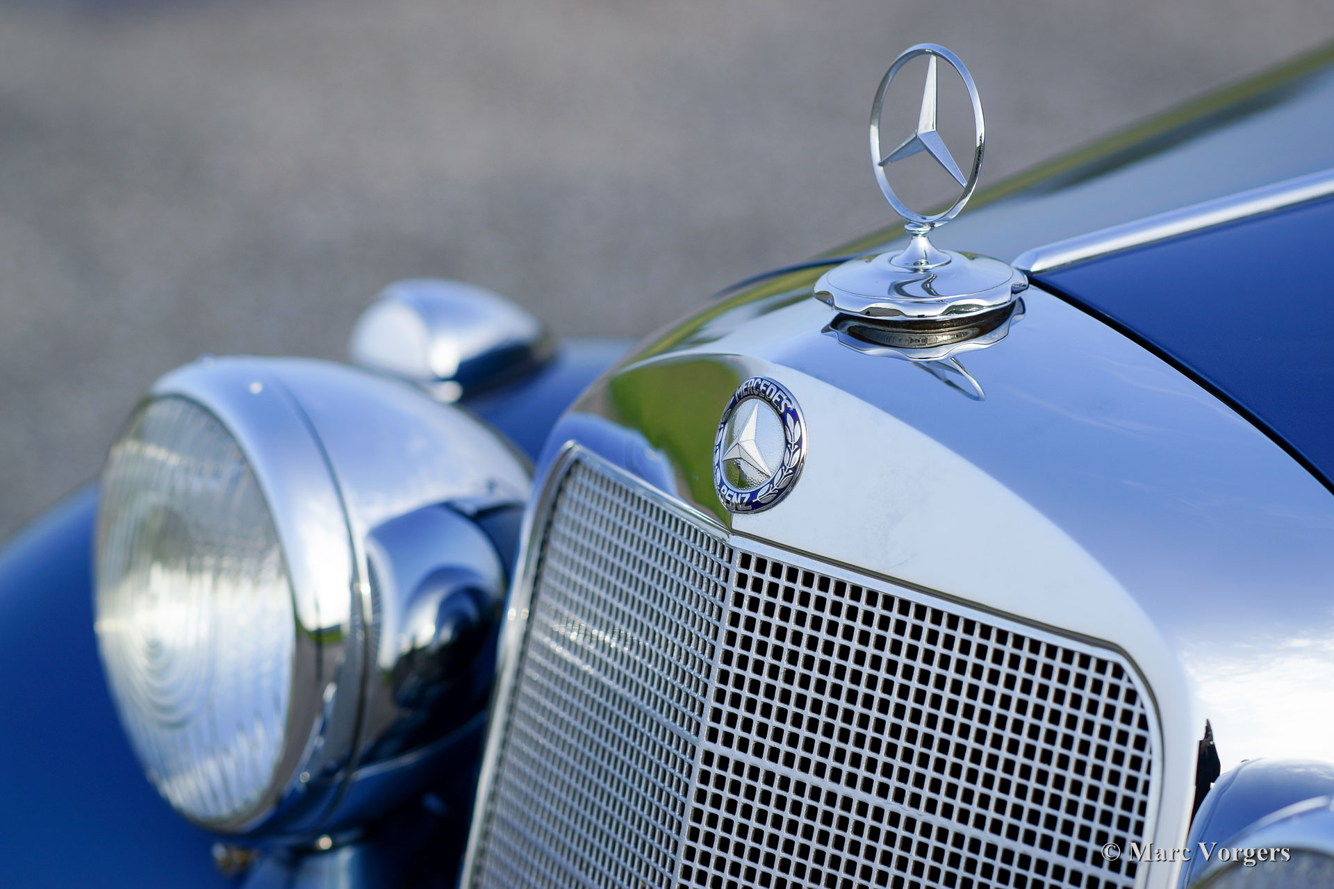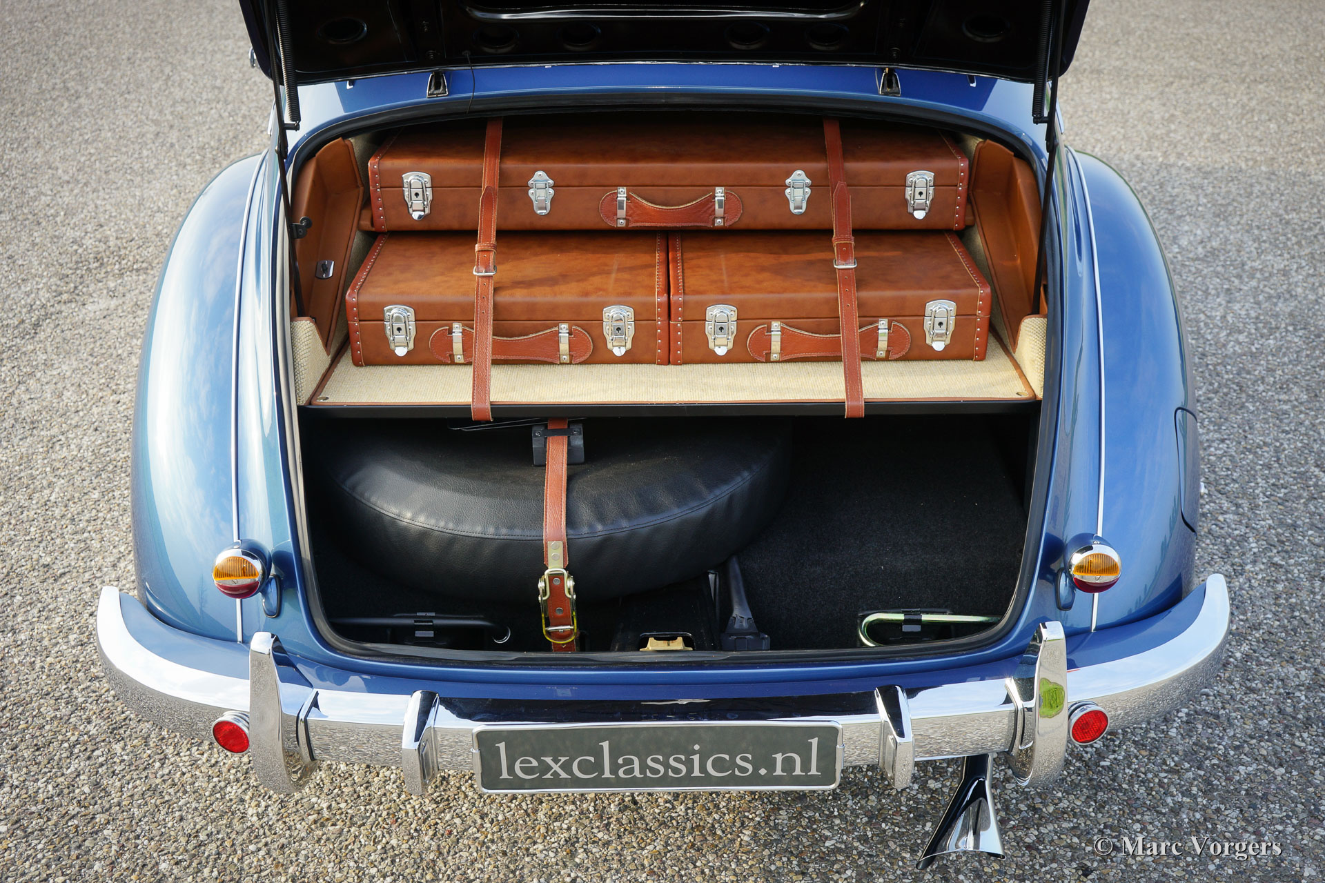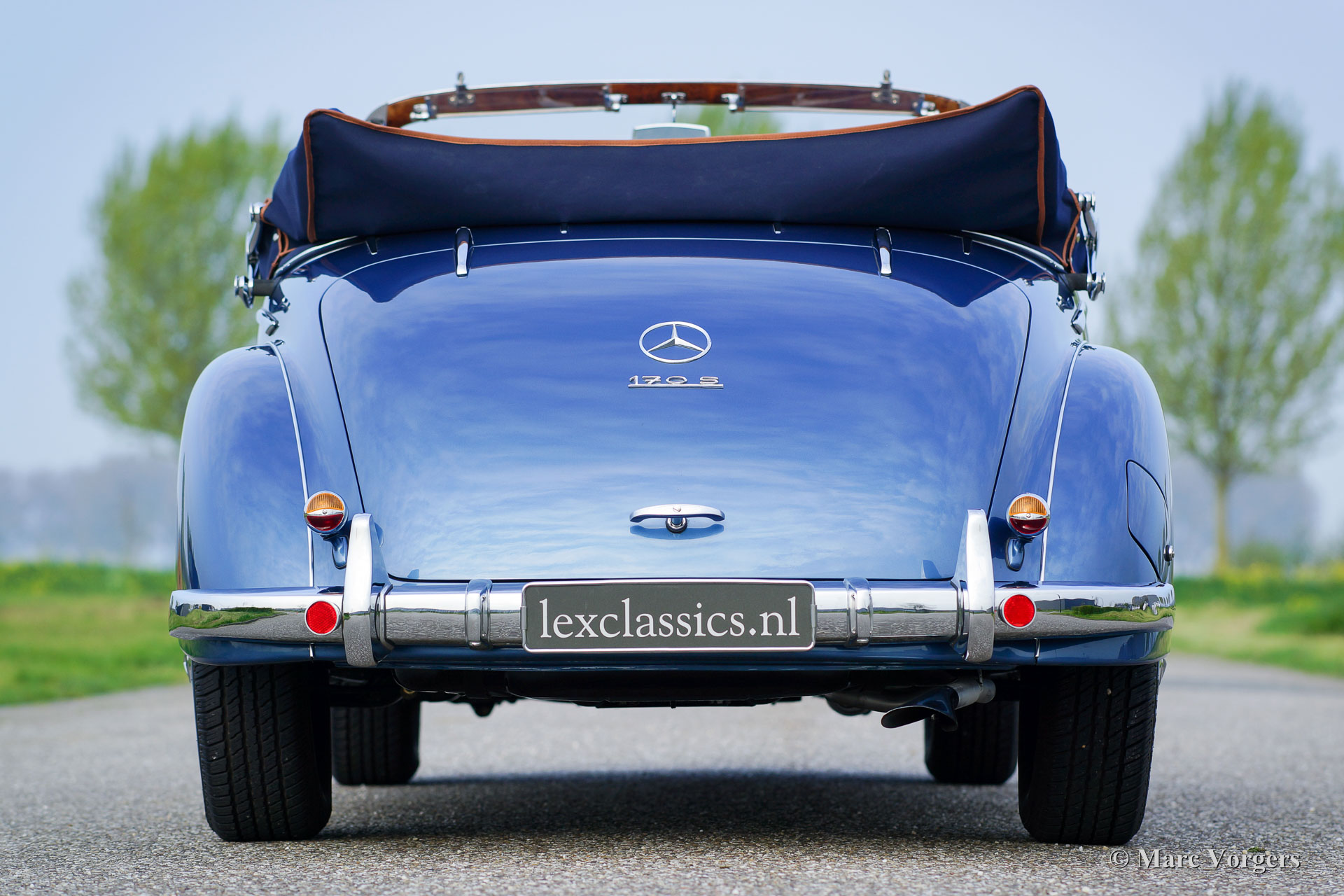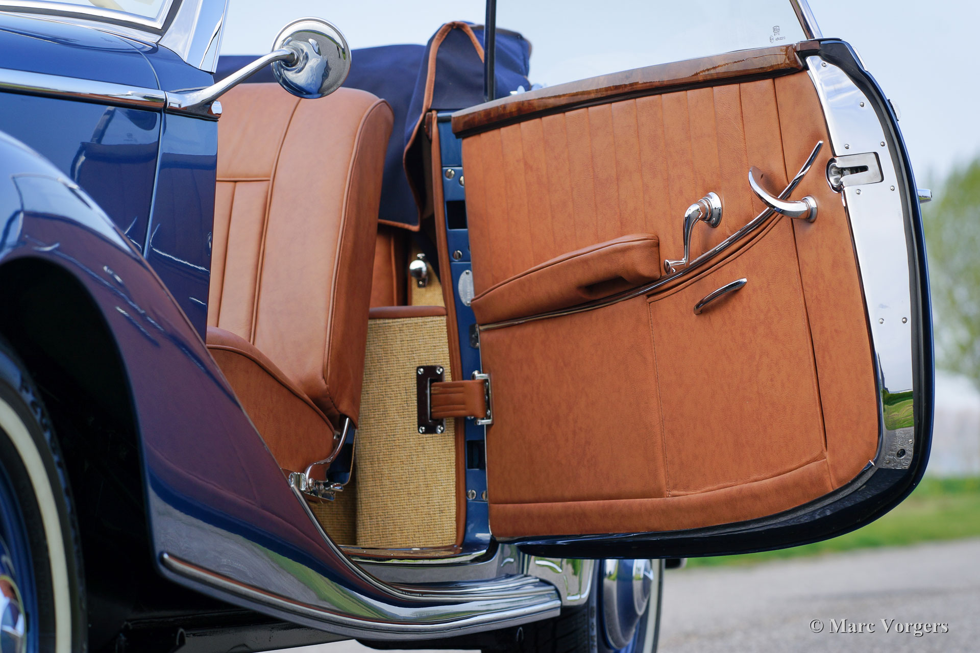 Mercedes-Benz 170 S cabriolet A, année 1950, Couleur bleu métallique avec un intérieur en cuir brun. Cette merveilleuse Mercedes-Benz fut restaurée superbement à la condition du concours ces dernières années. Chaque fois que vous regardez, chaque détail montre la perfection. Au cours du construction, des nombreuses nouvelles pièces d'origine ont été utilisées. Un reportage photo de cette restauration supérieure est présent. L'automobile est livrée avec un ensemble de troncs, fait sur mesure, dans la chaussure. Un spécimen TOP !
