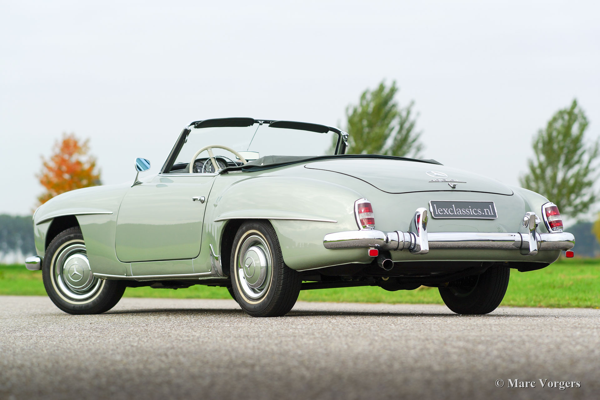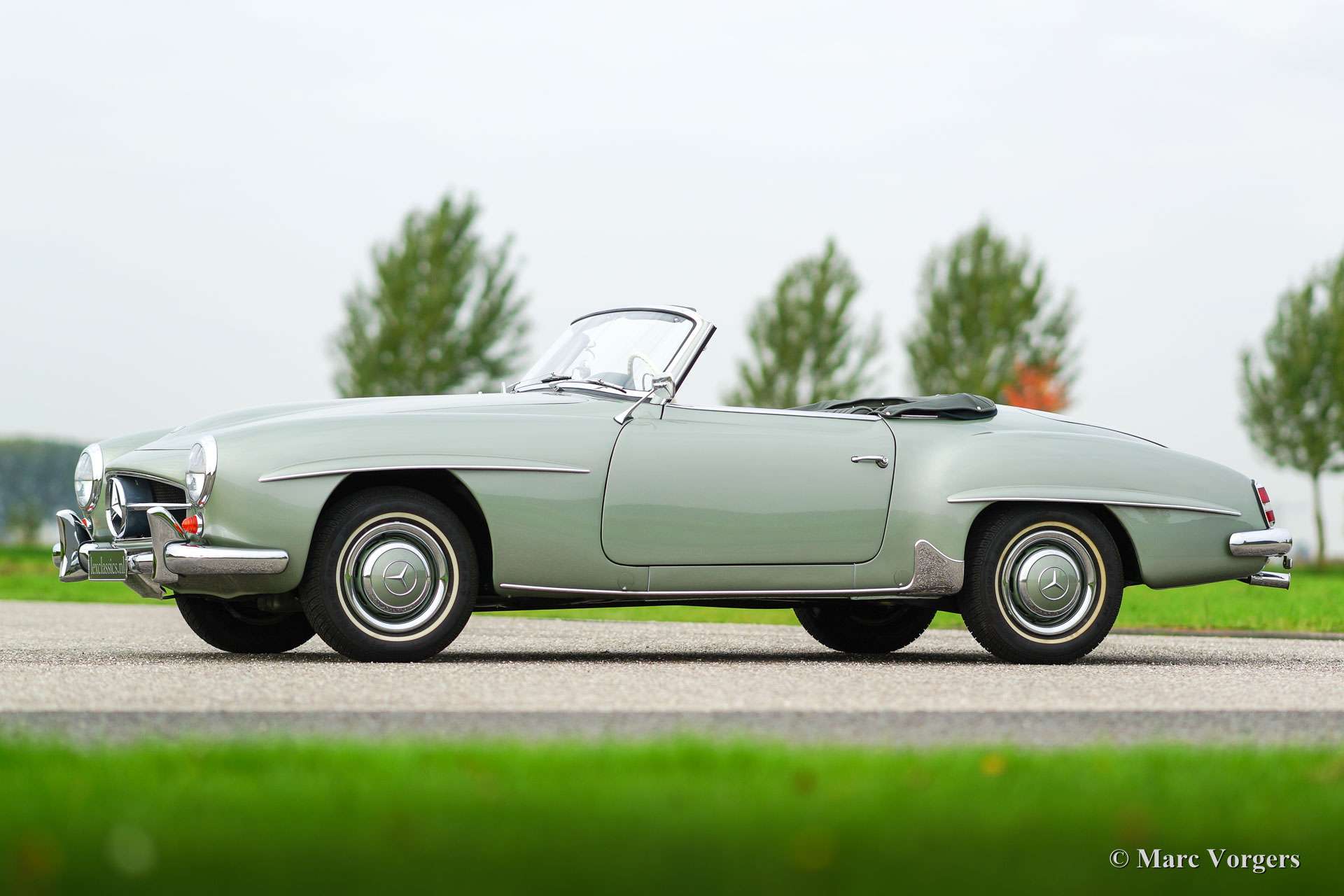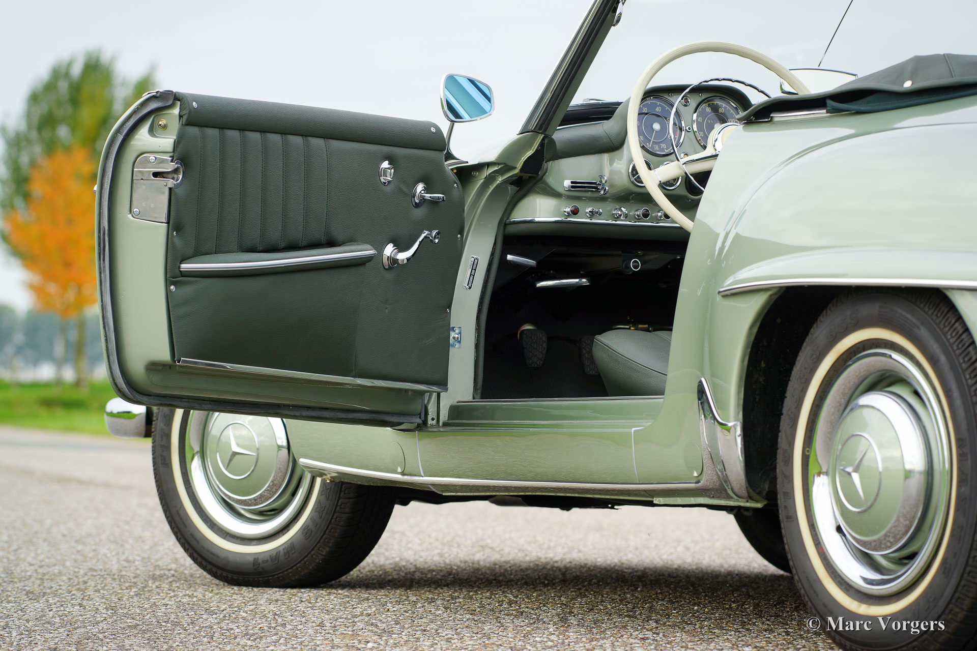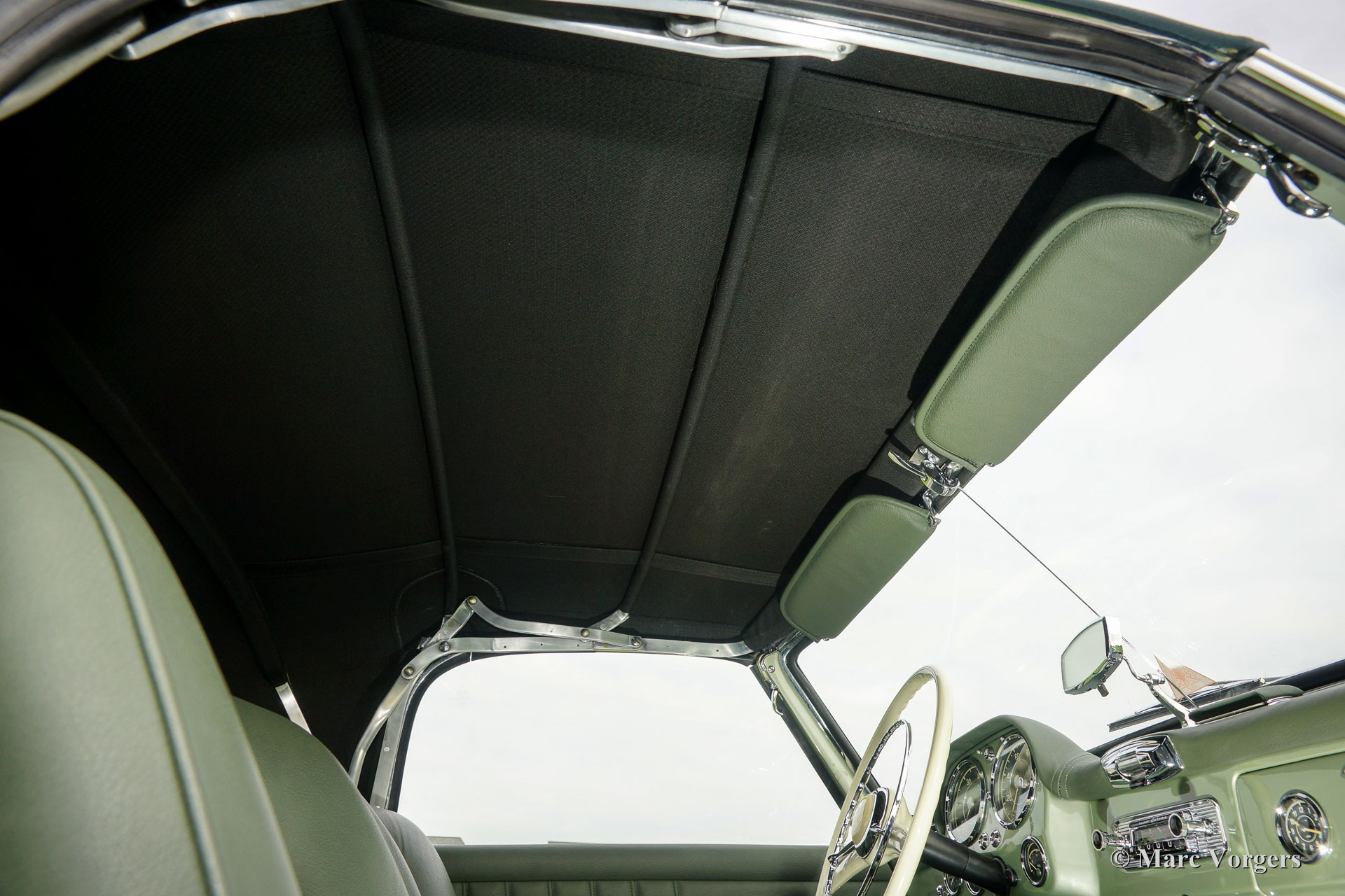Mercedes-Benz 190 SL, année 1958. Couleur 'Hellgrün' métallique (190 SL couleur original facultatif code DB274) avec un cuir vert intérieur et tapis vert. Capote mohair vert sombre et couvercle de protection vert. Ce magnifique Mercedes-Benz 190 SL vient de l'Oregon aux États-Unis. L'automobile a été importé aux Pays-Bas en 2012. Puis la voiture a été entièrement et parfaitement restauré au concours condition top! Le moteur, boîte de vitesses, carburateurs et autres pièces mécaniques ont été révisés par un spécialiste reconnu de SL néerlandais. Un reportage photo de la restauration est présent. Après «grand frère» 300 SL 190 SL est le modèle Mercedes plus souhaitable. Une voiture de la beauté intemporelle et un investissement solide. La 190 SL est aussi une voiture magnifique pour l'été tournées sportives. Les belles lignes et des détails qui ne cessera jamais d'exciter.