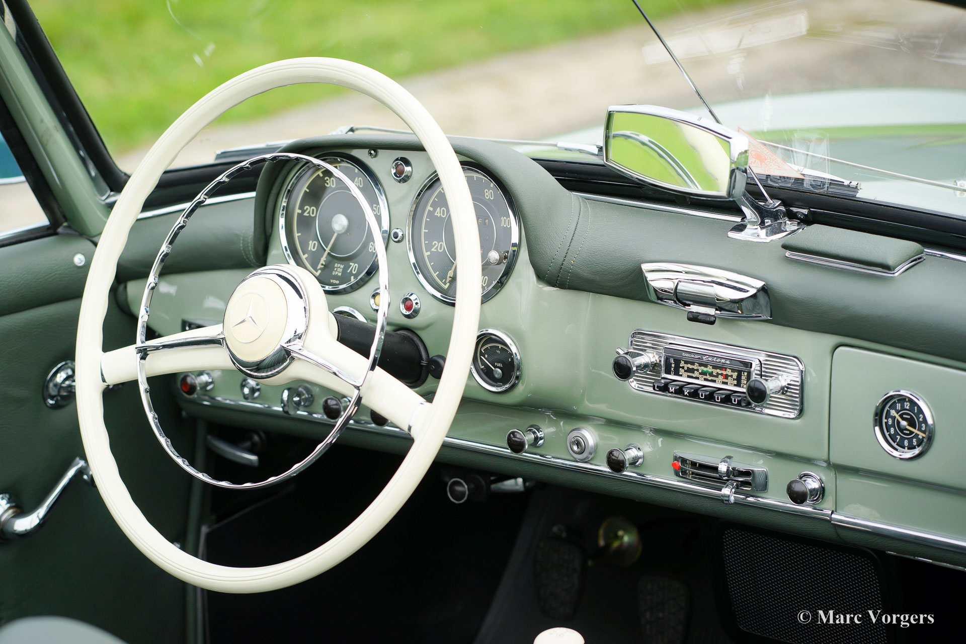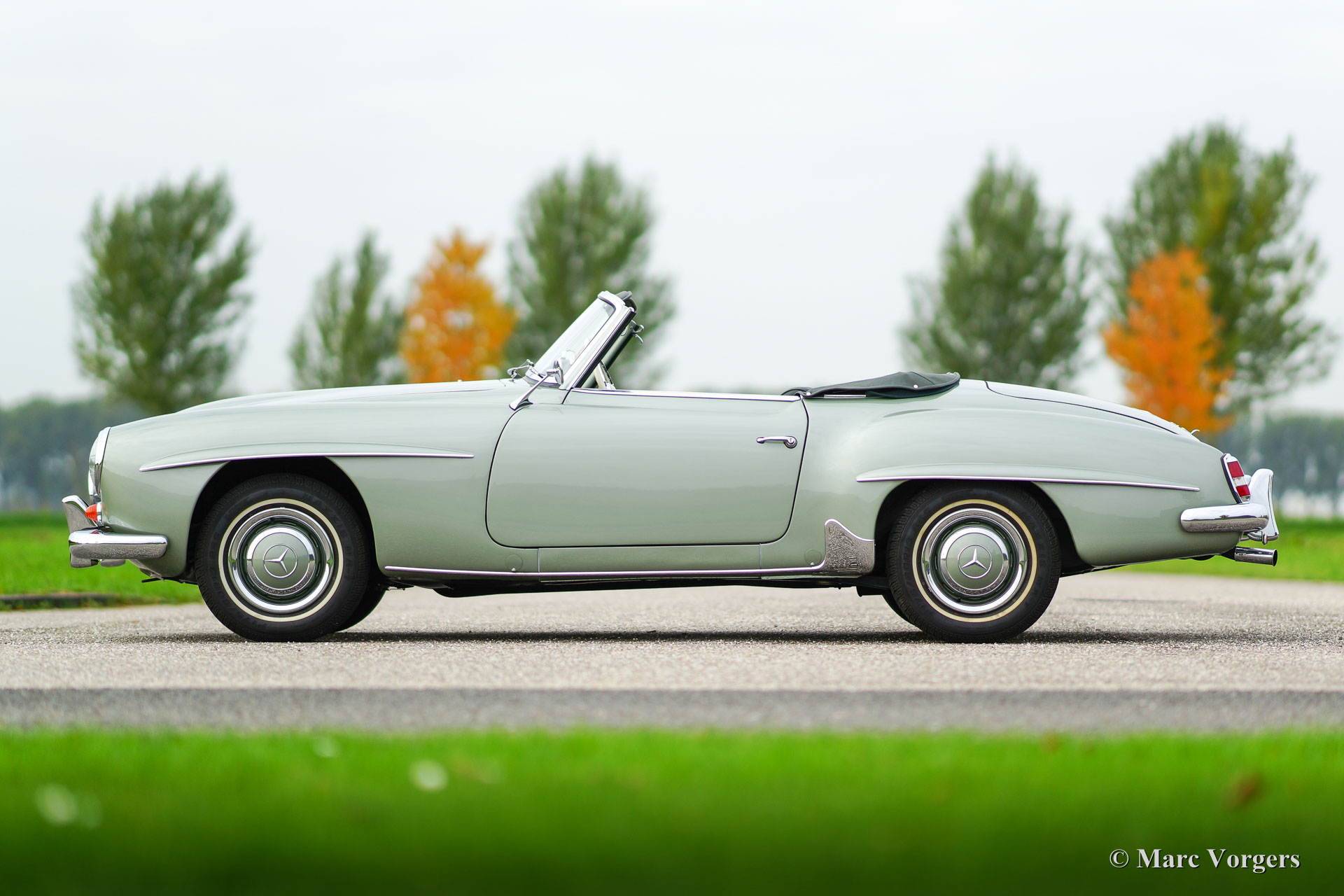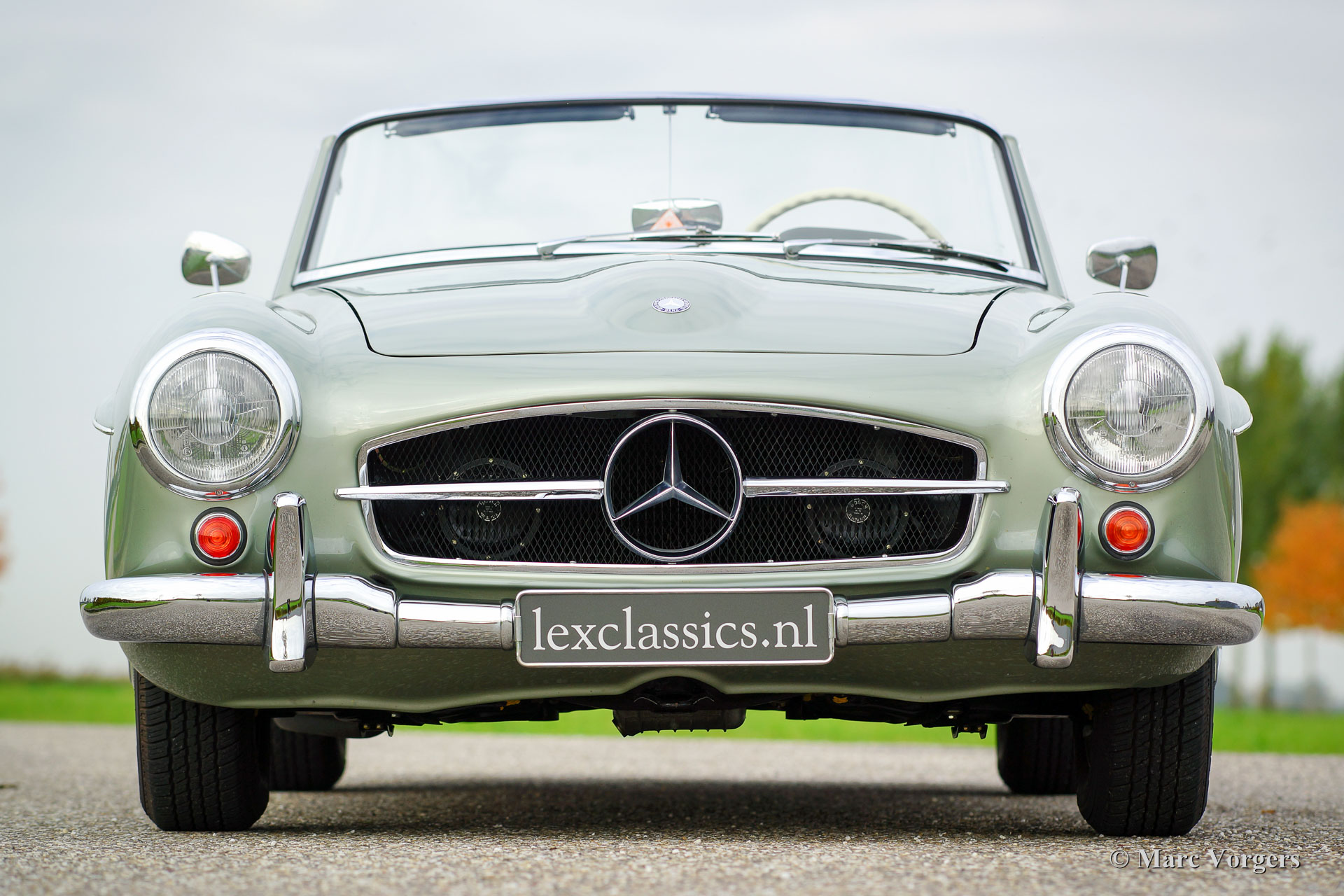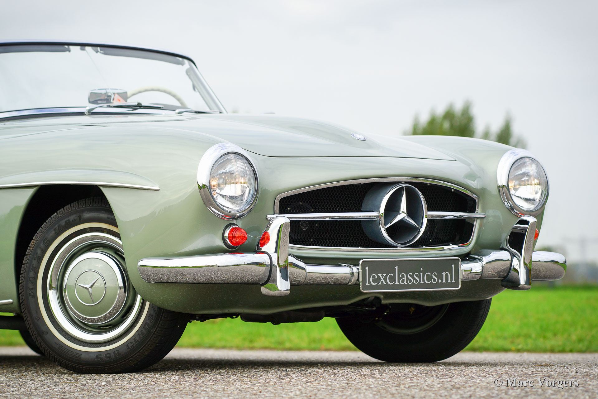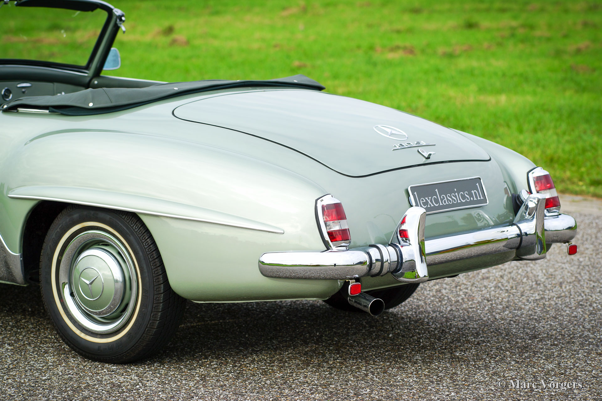 Mercedes-Benz 190 SL, année 1958. Couleur 'Hellgrün' métallique (190 SL couleur original facultatif code DB274) avec un cuir vert intérieur et tapis vert. Capote mohair vert sombre et couvercle de protection vert. Ce magnifique Mercedes-Benz 190 SL vient de l'Oregon aux États-Unis. L'automobile a été importé aux Pays-Bas en 2012. Puis la voiture a été entièrement et parfaitement restauré au concours condition top! Le moteur, boîte de vitesses, carburateurs et autres pièces mécaniques ont été révisés par un spécialiste reconnu de SL néerlandais. Un reportage photo de la restauration est présent. Après «grand frère» 300 SL 190 SL est le modèle Mercedes plus souhaitable. Une voiture de la beauté intemporelle et un investissement solide. La 190 SL est aussi une voiture magnifique pour l'été tournées sportives. Les belles lignes et des détails qui ne cessera jamais d'exciter.