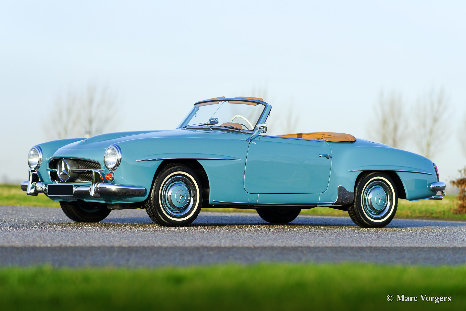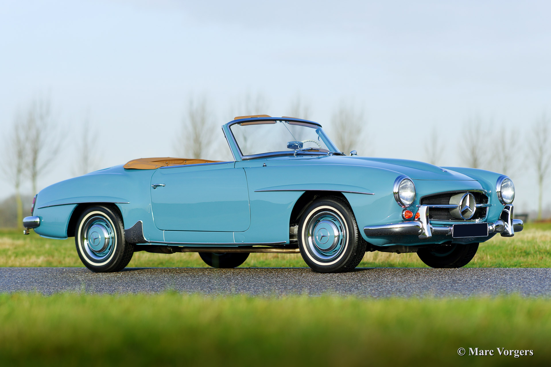 The Mercedes-Benz 190 SL roadster saw the light of day in the year 1955 impersonating a less expensive and less advanced alternative for the 300 SL roadster. Technically the 190 SL roadster shared nothing with big brother 300 SL. But the bodywork design and interior design, which appealed to many people, were strongly inspired by the 300 SL roadster. The Mercedes-Benz 190 SL was a real touring-convertible in opposite to the 300 SL roadster which was a true sports car. But the 190 SL was affordable (to Mercedes-Benz standards) and the car found a great share of enthusiastic owners primarily in the sunny states of the USA. The sales success of the 190 SL was based on the good looks of the car but also because of the excellent comfort, the excellent mechanics and its reliability. The Mercedes-Benz 190 SL was equipped with a four-cylinder engine with a cylinder capacity of 1897 cc. and fitted with two carburettors. The standard four-speed manual gearbox was fully synchronized and featured floor shift. From 1956 on the 190 SL was fitted with standard power brakes. During the entire period of production a very nice hardtop was available. The story goes that many European owner ordered the roadster with the hardtop and hardly ever took it off! In the year 1963 the 190 SL was succeeded by the new Mercedes-Benz 230 SL roadster which was going to be known by the nickname "Pagoda".