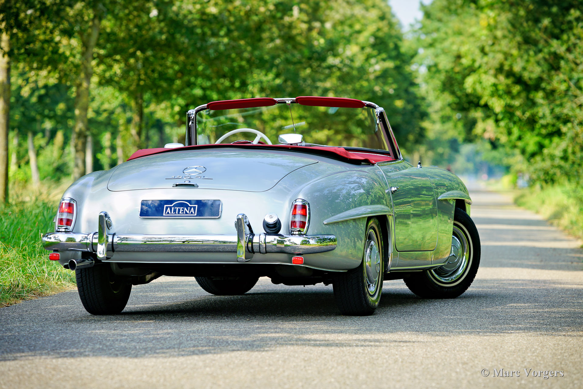 Mercedes-Benz 190 SL, année 1961. Couleur argent métallisé associée à un intérieur en cuir rouge et à une capote en mohair noir. Cette magnifique Mercedes 190 SL fut vendue neuve à Malines, en Belgique. L'automobile fut restaurée et révisée détaillée à la perfection dans le passé. De plus, les carburateurs Solex d'origine furent révisés. Un reportage photo de la restauration est présent. La peinture est fraîche et semblable à du verre, les garnitures chromées sont parfaites, l'intérieur présente tous les détails d'origine et est en parfait état. Sous le capot, tout semble neuf ! Cette Mercedes 190 SL est dans un excellent état TOP, et la voiture roule parfaitement. La voiture est livrée avec le toit rigide d'origine qui est toujours en état non restauré. Le toit rigide est le modèle d'origine de 1961 avec la grande lunette arrière. La voiture est équipée de pneus 185/80 13 pouces à flancs blancs et d'une radio Becker Europa. Cette Mercedes 190 SL est bien documentée et les anciens papiers d'immatriculation belges d'origine sont toujours avec la voiture.