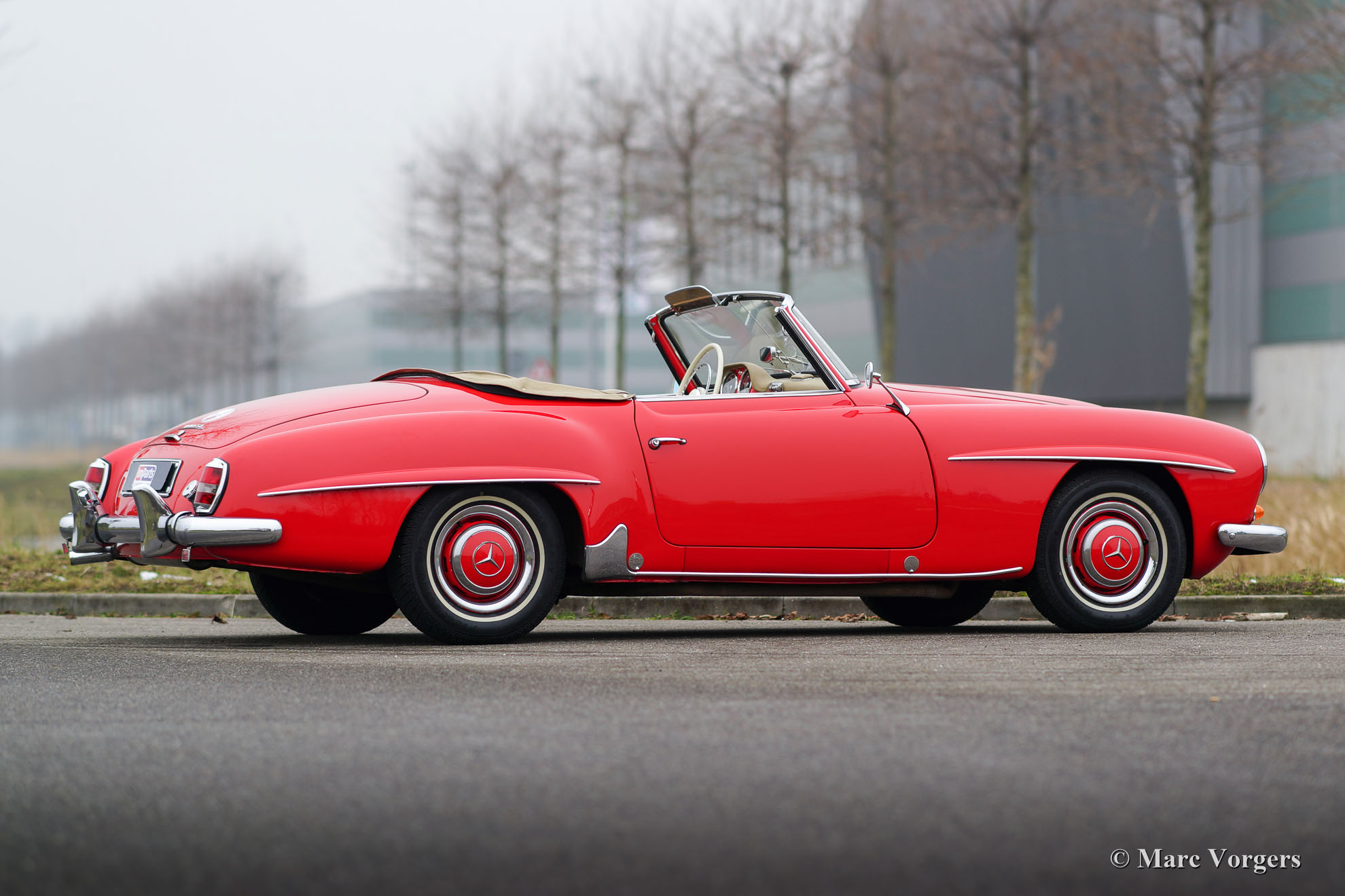 Mercedes-Benz 190 SL (W121), année 1962. Couleur rouge avec un intérieur en cuir beige et moquette beige. Capote noire et capuche beige. Cette belle Mercedes 190 SL a été vendue neuve aux Pays-Bas. La voiture a été bien entretenue au fil des ans, cette 190 SL est en très bon état. L'intérieur est entièrement original et il montre quelques signes d'utilisation et l'âge. La carrosserie a été donnée belle nouvelle peinture et le chrome est excellent. Le moteur a été soigneusement nettoyé et un nouveau joint de culasse a été installé. C'est une belle et parfaitement conduite 190 SL en très bon état !