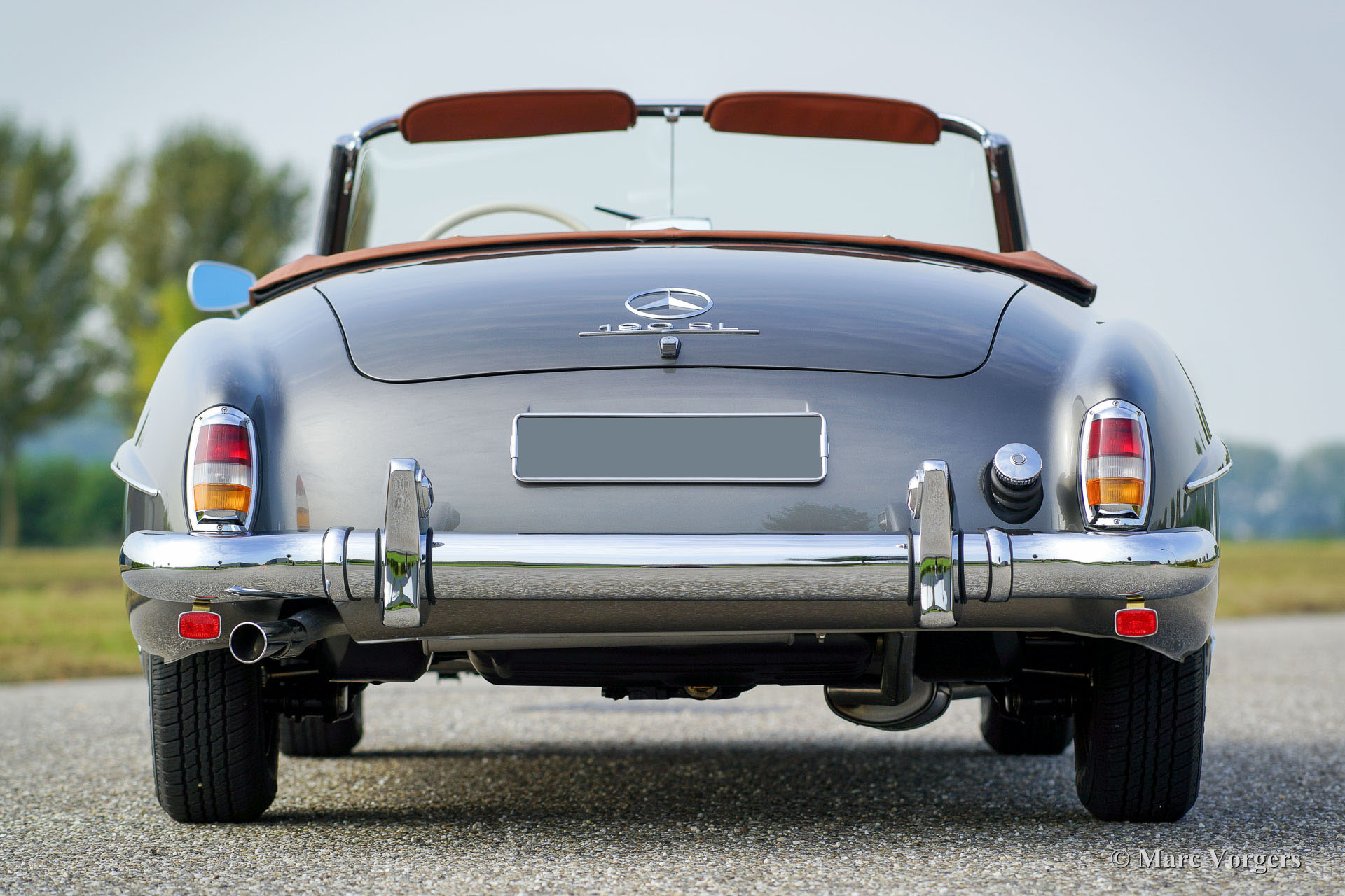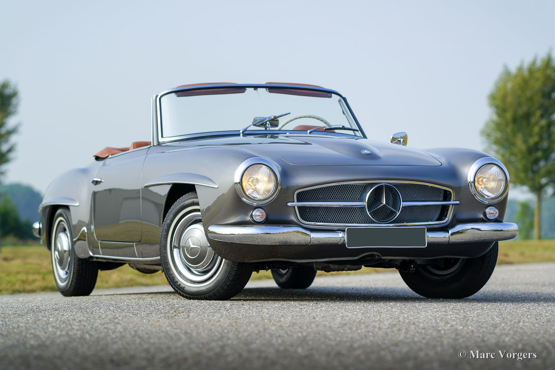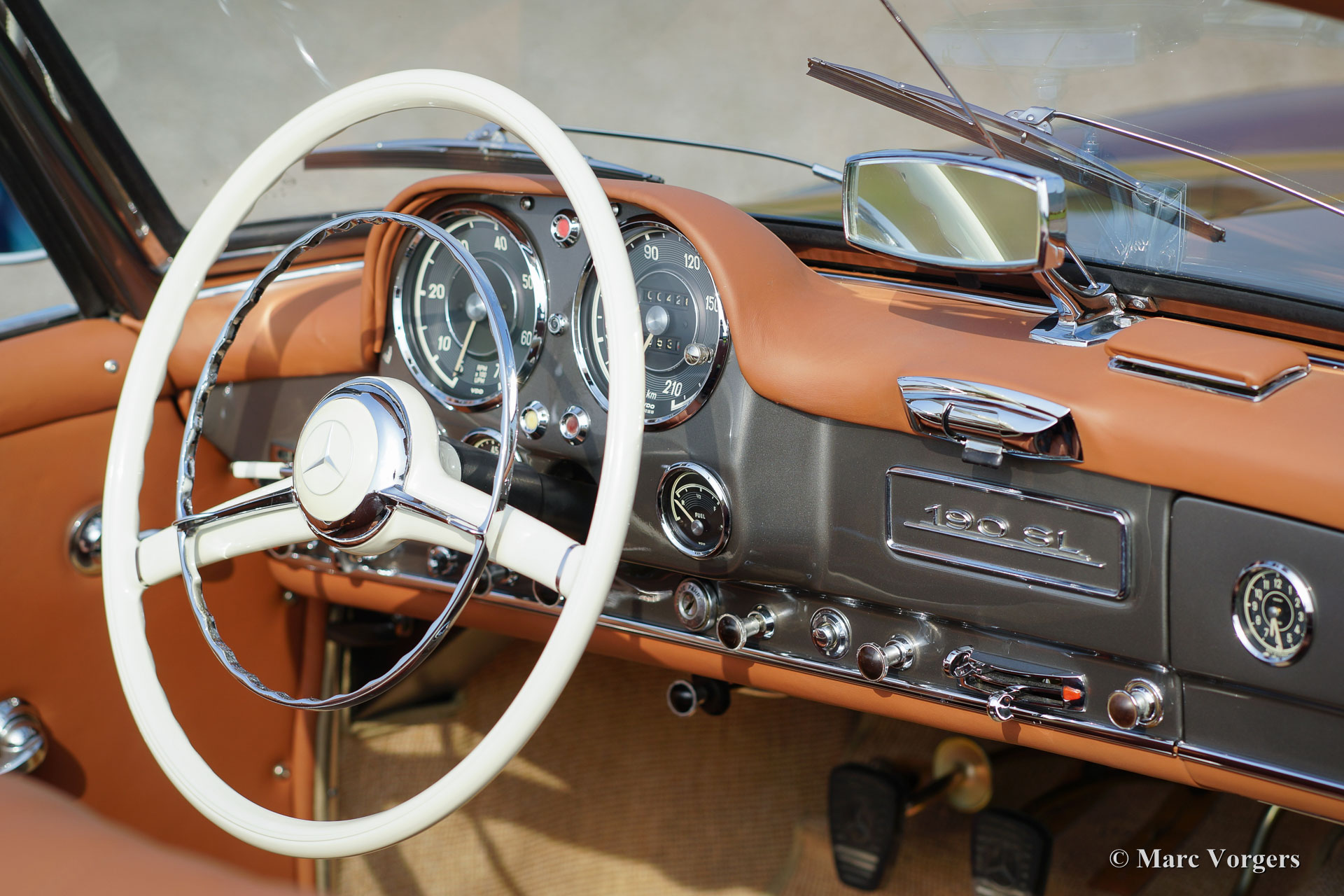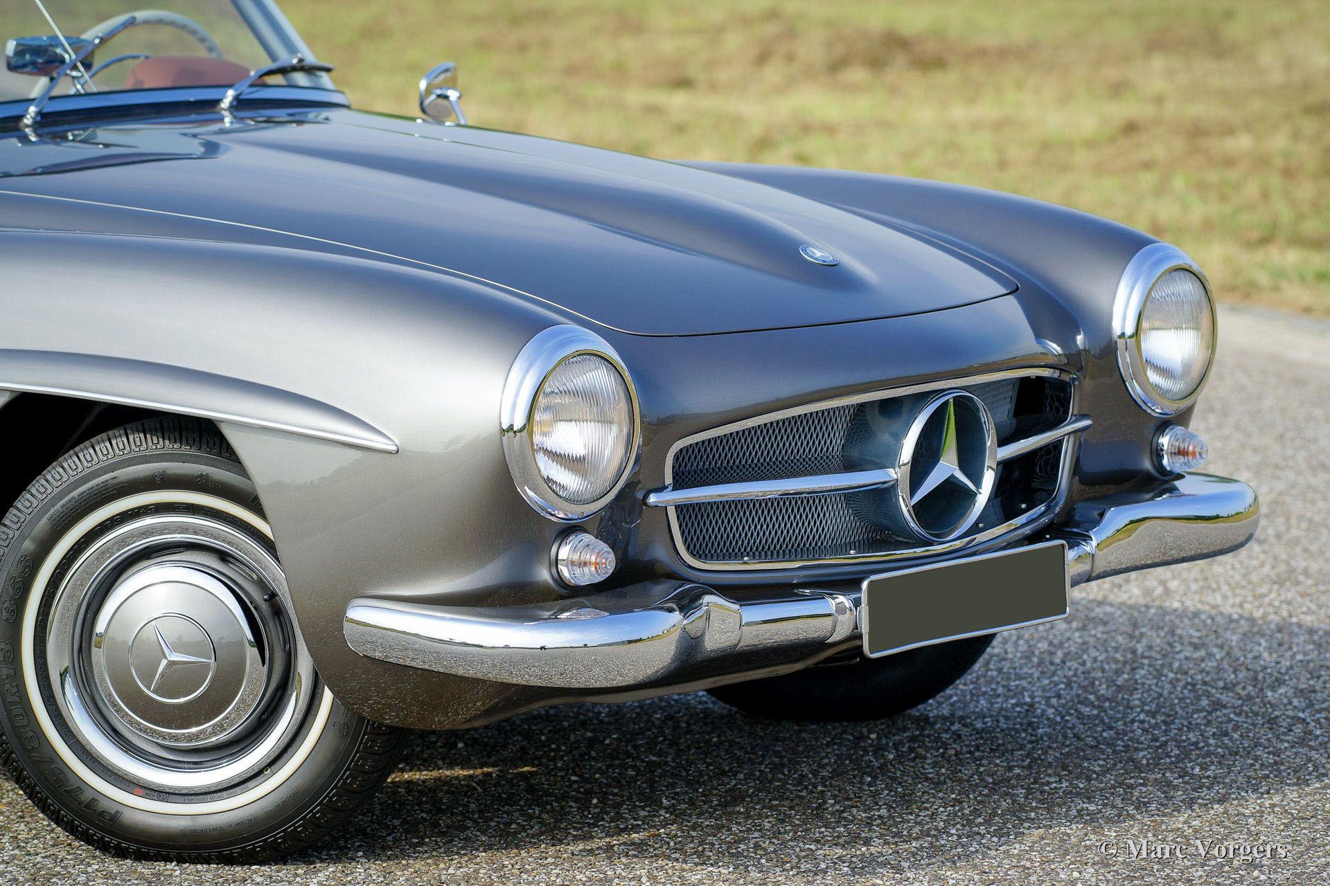 Mercedes-Benz 190 SL (W121), année 1962. Couleur gris foncé métallisé avec un intérieur en cuir cognac-brun et un tapis beige. Capot de mohair brun foncé et couvercle de la hotte en brun-cognac. Cette magnifique Mercedes 190 SL fut restaurée détaillée dans les années 2015 à 2017 ! Au cours de cette restauration de première classe, de nombreuses pièces Mercedes originales sont utilisées. Tout furent restauré et révisé ; Le moteur, la boîte de vitesses, les carburateurs, même toutes les jauges du tableau de bord. Le pare-brise et les fenêtres latérales furent renouvelés et un nouveau métier à tisser a été installé. Tout le chrome fut chromé parfaitement. C'est un spécimen TOP en condition de concours ! La voiture a des ‘Matching Numbers’, un Mercedes-Benz 'Datenkarte' est présent pour confirmer cela.