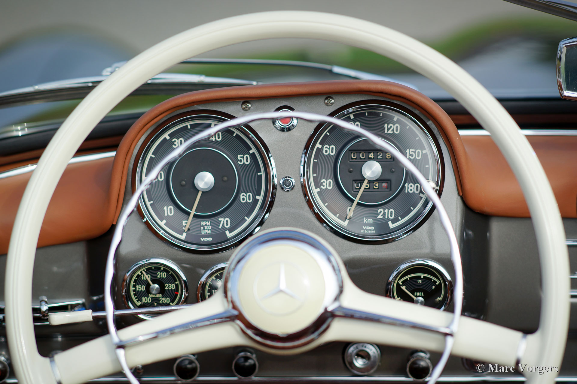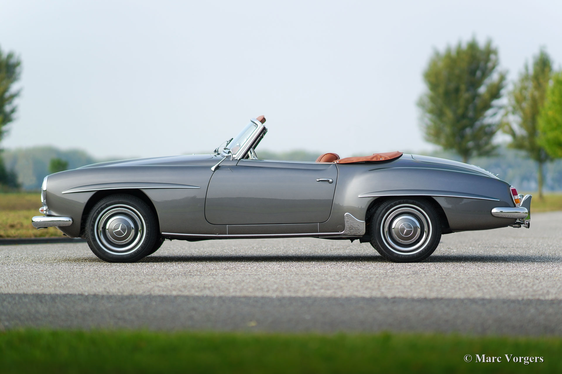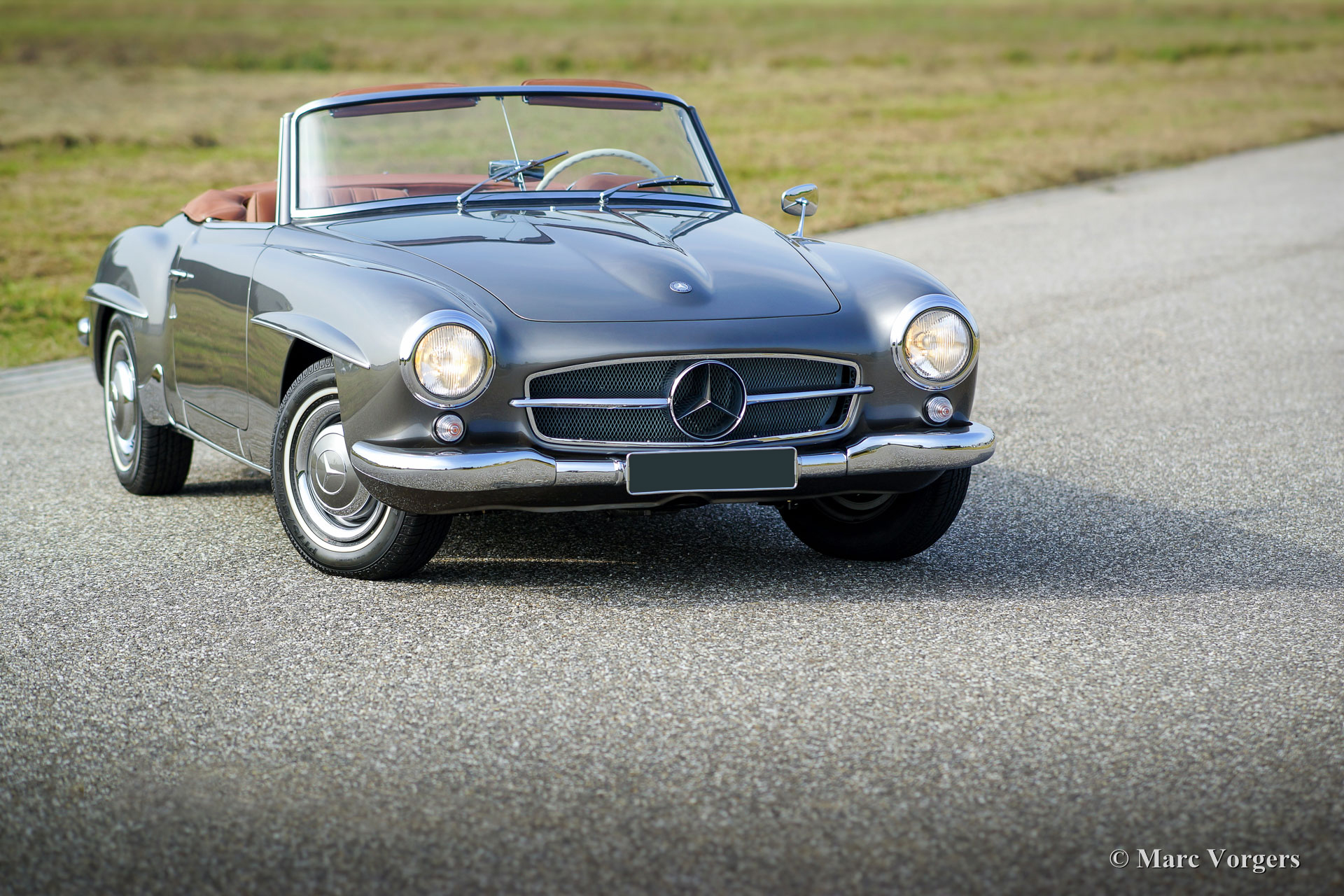 Mercedes-Benz 190 SL (W121), année 1962. Couleur gris foncé métallisé avec un intérieur en cuir cognac-brun et un tapis beige. Capot de mohair brun foncé et couvercle de la hotte en brun-cognac. Cette magnifique Mercedes 190 SL fut restaurée détaillée dans les années 2015 à 2017 ! Au cours de cette restauration de première classe, de nombreuses pièces Mercedes originales sont utilisées. Tout furent restauré et révisé ; Le moteur, la boîte de vitesses, les carburateurs, même toutes les jauges du tableau de bord. Le pare-brise et les fenêtres latérales furent renouvelés et un nouveau métier à tisser a été installé. Tout le chrome fut chromé parfaitement. C'est un spécimen TOP en condition de concours ! La voiture a des ‘Matching Numbers’, un Mercedes-Benz 'Datenkarte' est présent pour confirmer cela.