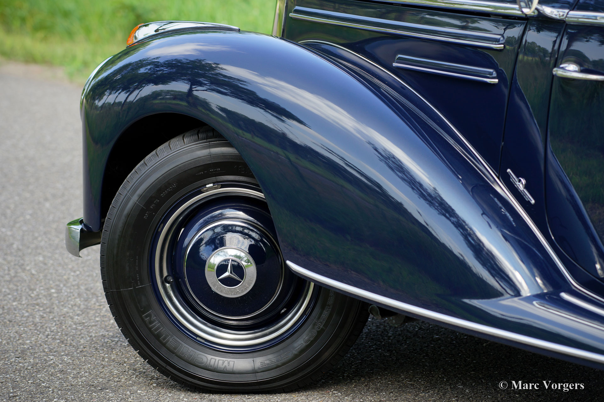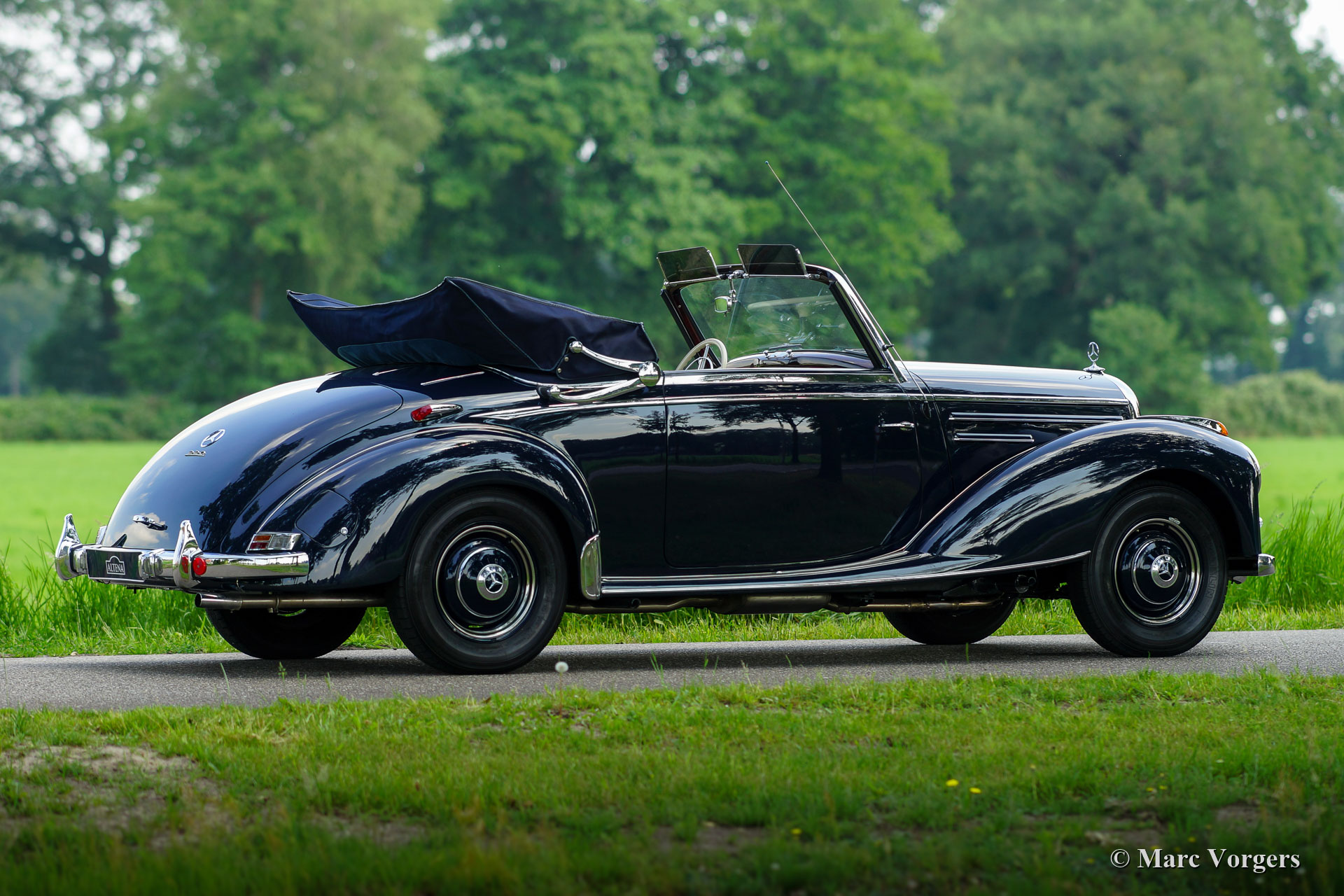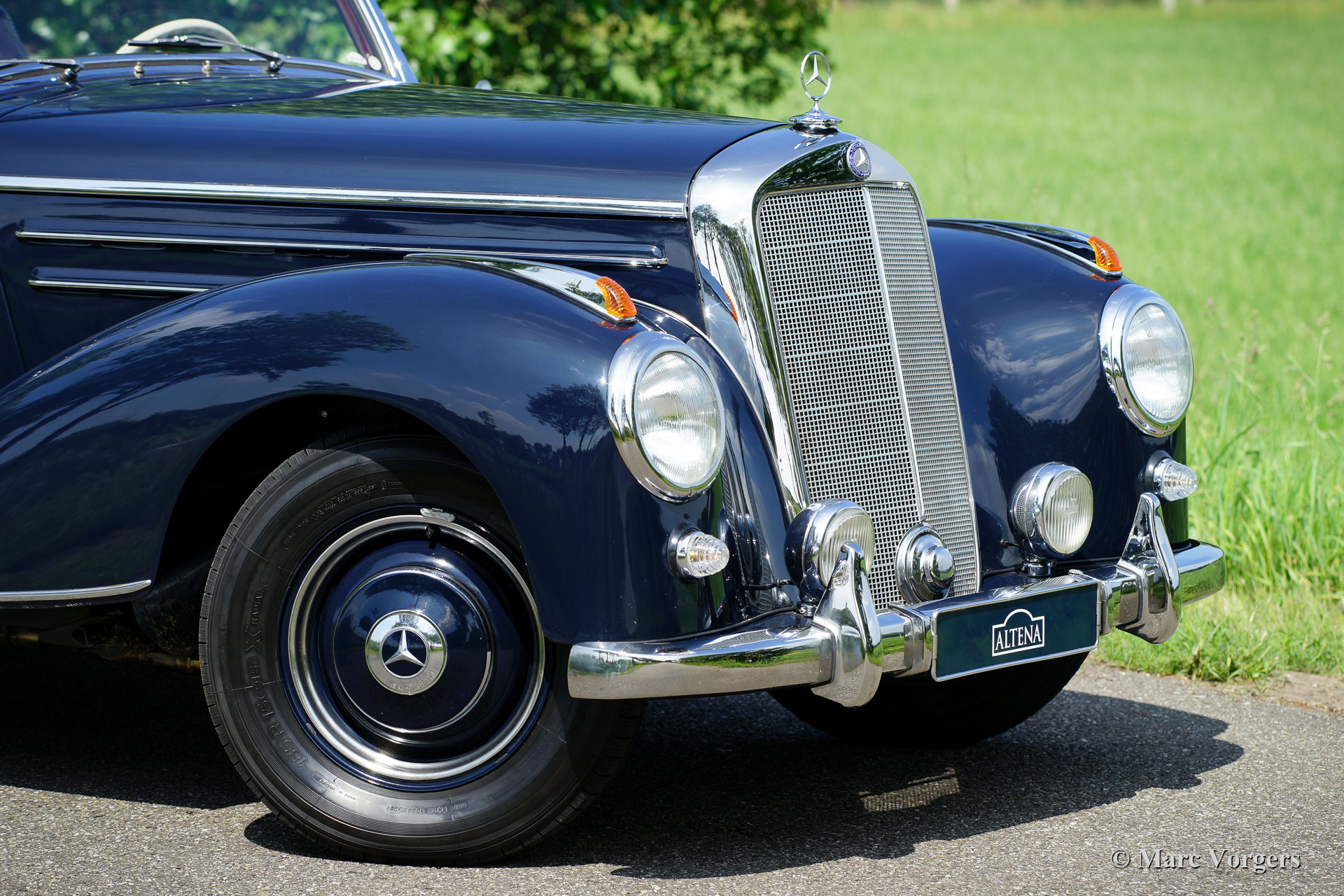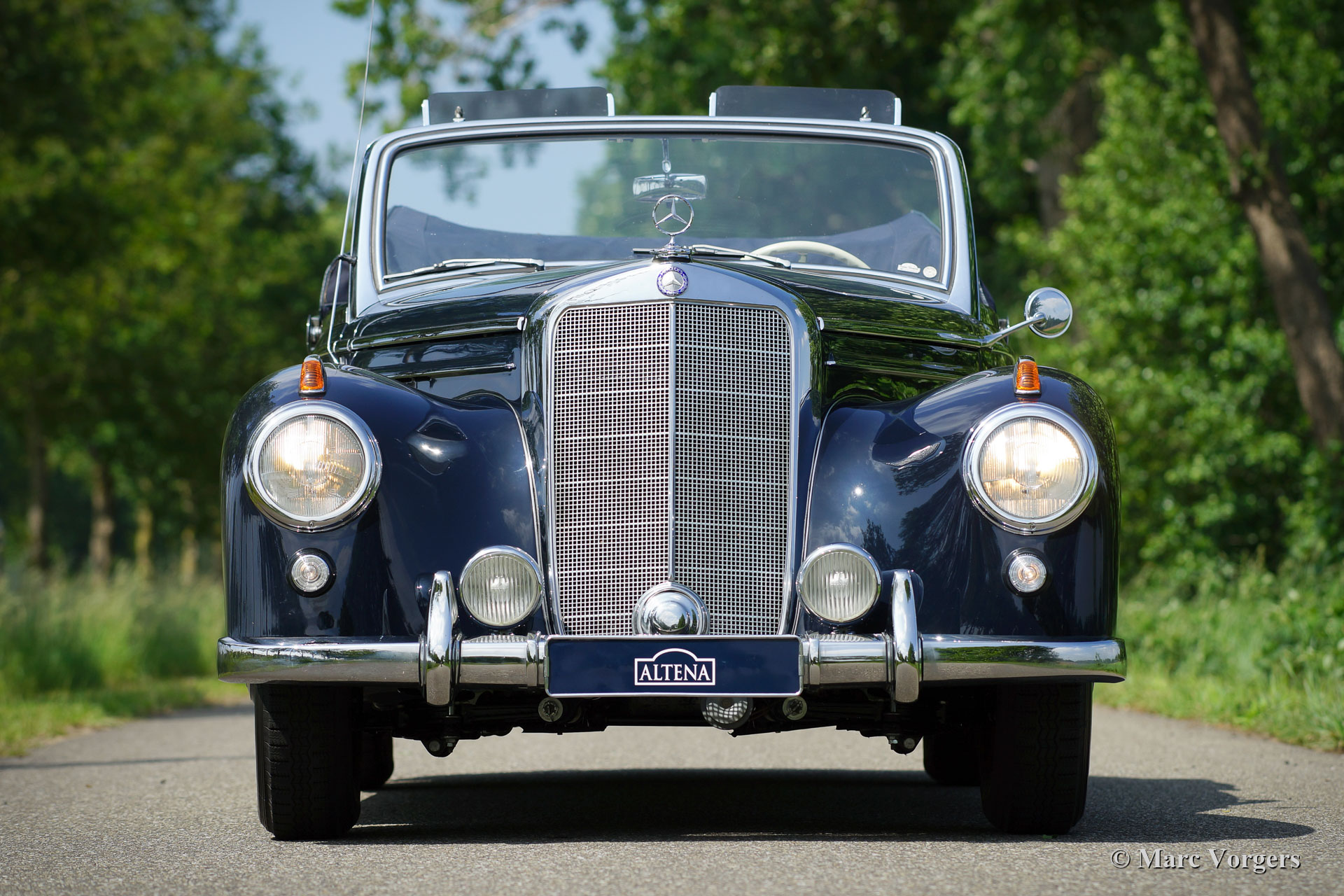 Mercedes-Benz 220 Cabriolet A, année 1951. Couleur bleu foncé combinée avec un intérieur en cuir gris et un tapis gris. Capote et couvercle de la hotte bleu foncé. Dans les années 1990, cette magnifique et rare Mercedes 220 Cabriolet A fut restaurée détaillée à la perfection par un spécialiste Mercedes-Benz aux Pays-Bas. Tout a été restauré, révisé et / ou renouvelé, seul le revêtement intérieur en cuir d'origine a été rénové et conservé dans la voiture restaurée. Après plus de 20 ans et seulement 4983 kilomètres depuis la restauration, la voiture est toujours en excellent état ! La carrosserie, la peinture et le chrome sont en superbe état. Le compartiment moteur, le dessous et le coffre sont jolis et propres. L'intérieur d'origine, vieux de près de 70 ans, est en bon état avec des traces d'utilisation et d'âge. L'automobile montre tous les détails d'origine et elle est équipée de la radio Becker et des antibrouillards Bosch d'origine. De plus, la voiture est livrée avec le porte-outils d'origine et l'ensemble de valises original « Bad Cannstadt » ultra-rare. Un exemple rare et hautement souhaitable.