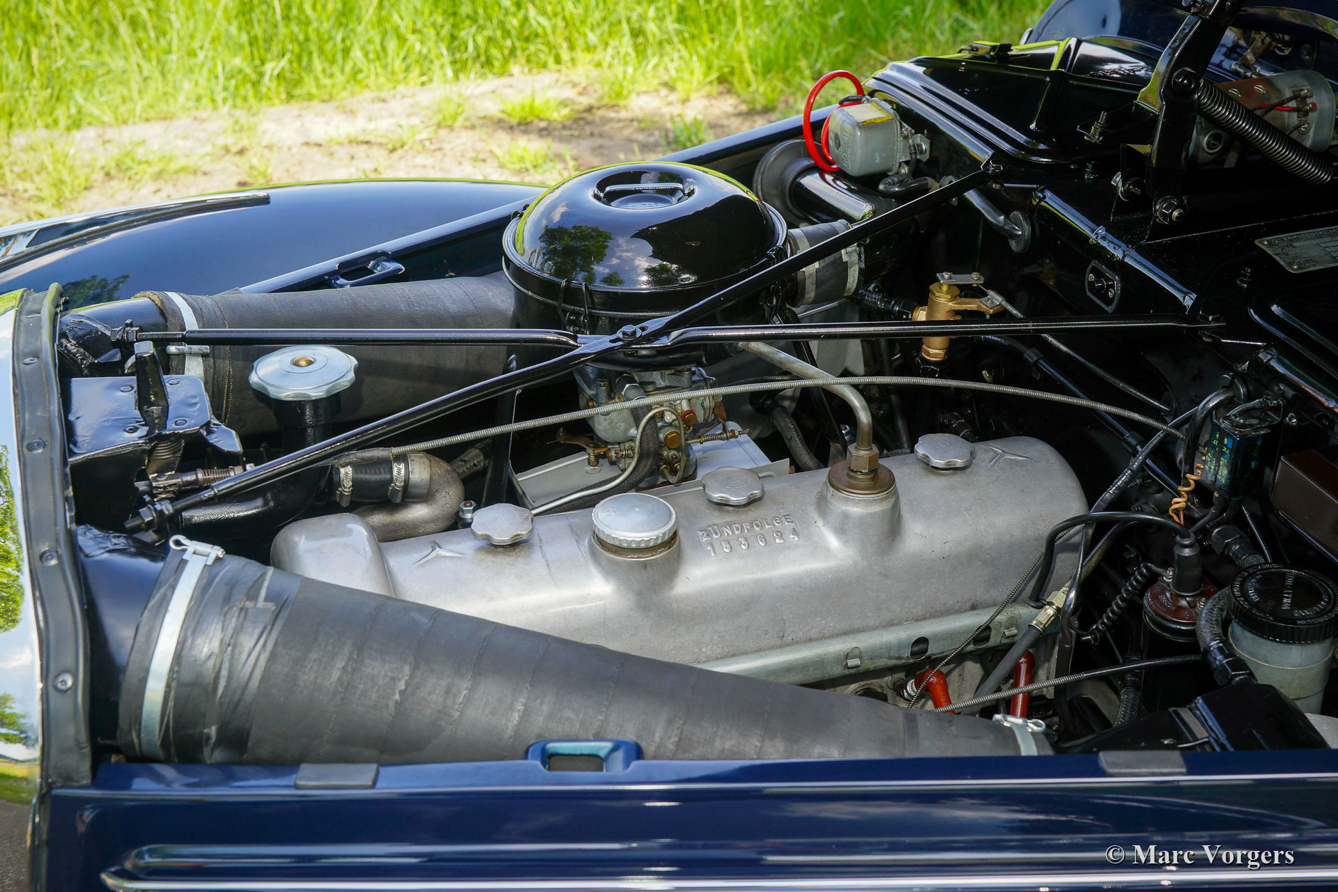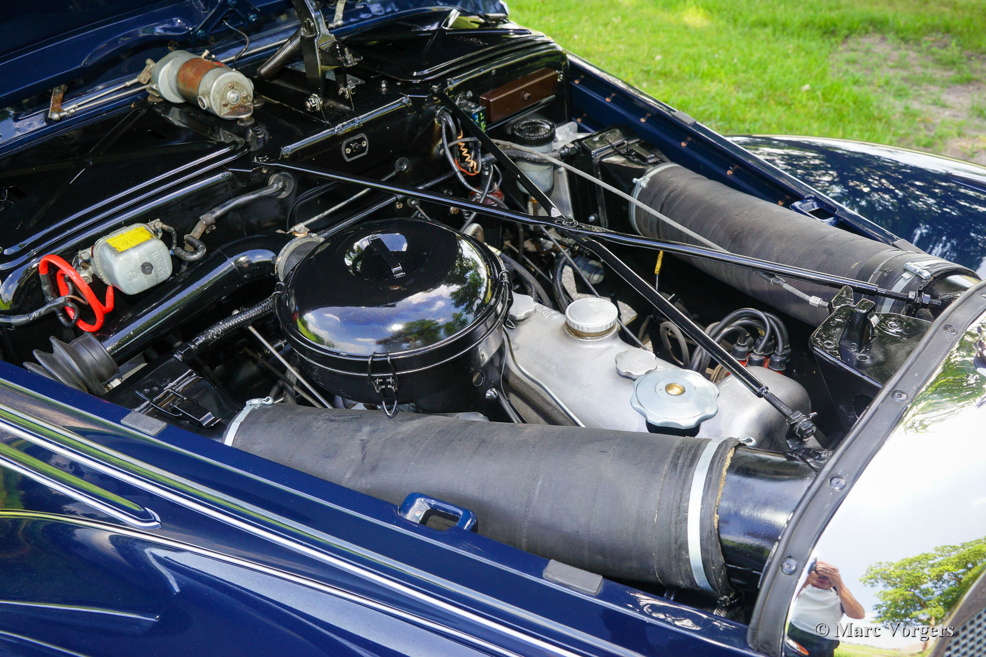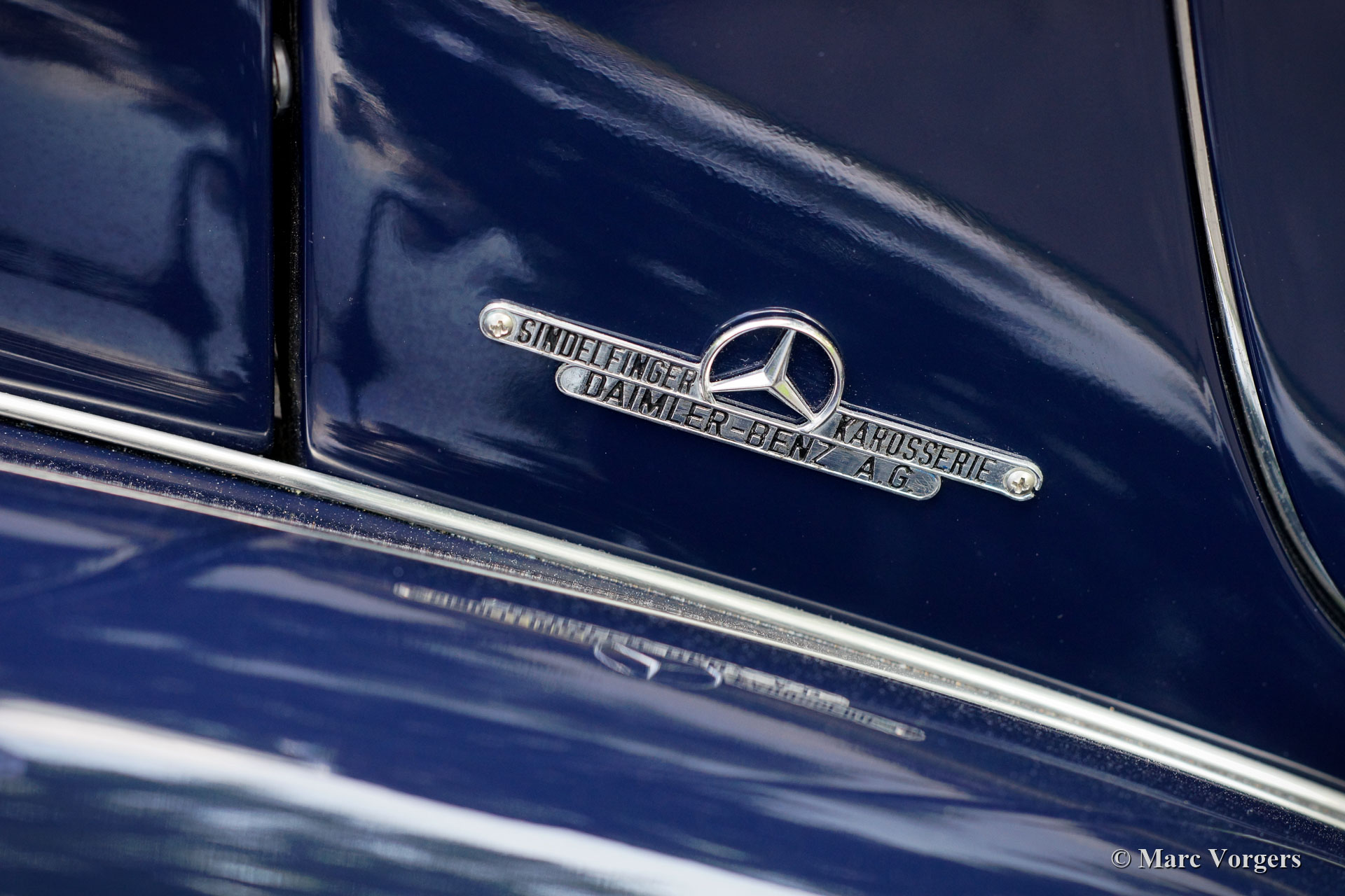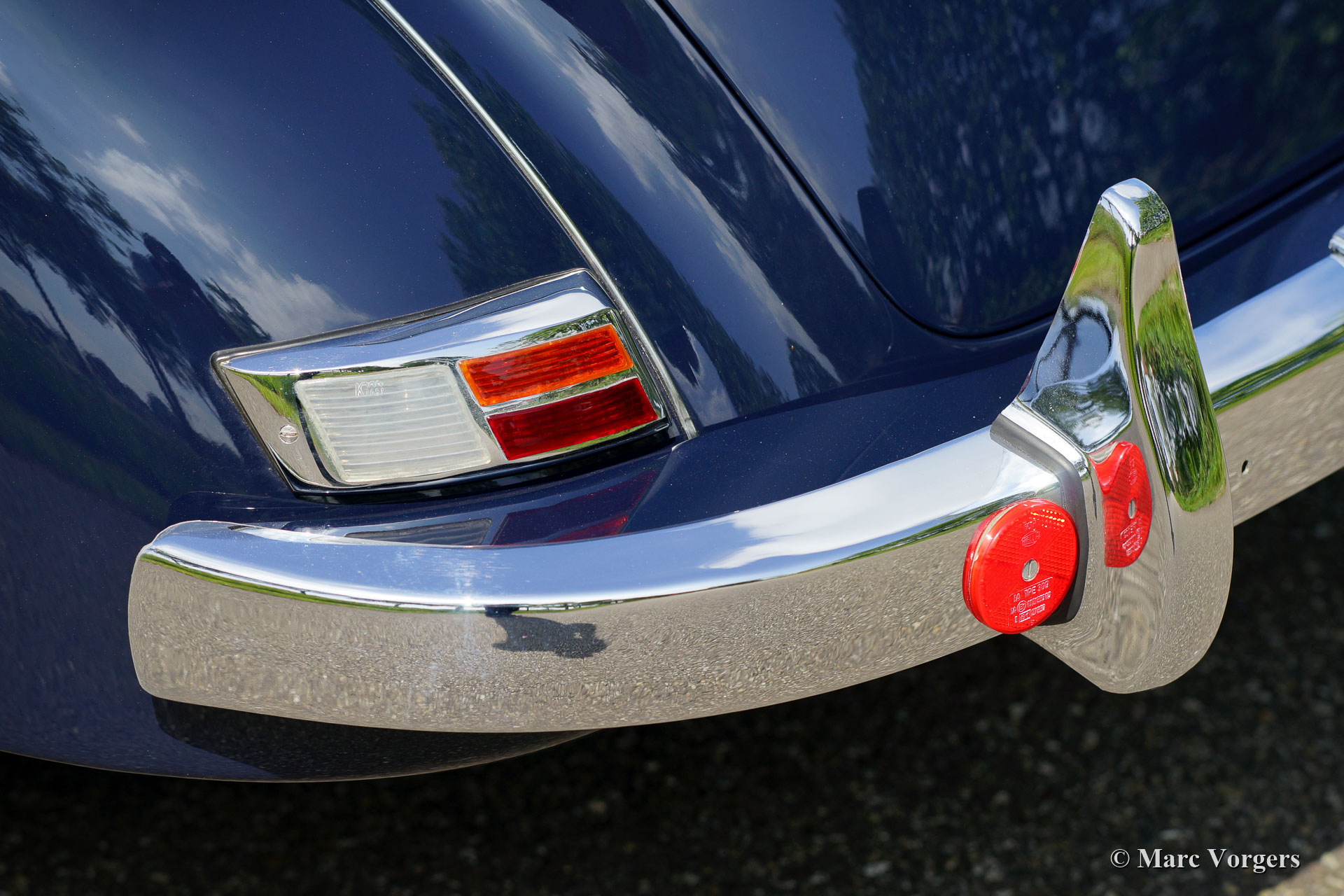 Mercedes-Benz 220 Cabriolet A, année 1951. Couleur bleu foncé combinée avec un intérieur en cuir gris et un tapis gris. Capote et couvercle de la hotte bleu foncé. Dans les années 1990, cette magnifique et rare Mercedes 220 Cabriolet A fut restaurée détaillée à la perfection par un spécialiste Mercedes-Benz aux Pays-Bas. Tout a été restauré, révisé et / ou renouvelé, seul le revêtement intérieur en cuir d'origine a été rénové et conservé dans la voiture restaurée. Après plus de 20 ans et seulement 4983 kilomètres depuis la restauration, la voiture est toujours en excellent état ! La carrosserie, la peinture et le chrome sont en superbe état. Le compartiment moteur, le dessous et le coffre sont jolis et propres. L'intérieur d'origine, vieux de près de 70 ans, est en bon état avec des traces d'utilisation et d'âge. L'automobile montre tous les détails d'origine et elle est équipée de la radio Becker et des antibrouillards Bosch d'origine. De plus, la voiture est livrée avec le porte-outils d'origine et l'ensemble de valises original « Bad Cannstadt » ultra-rare. Un exemple rare et hautement souhaitable.