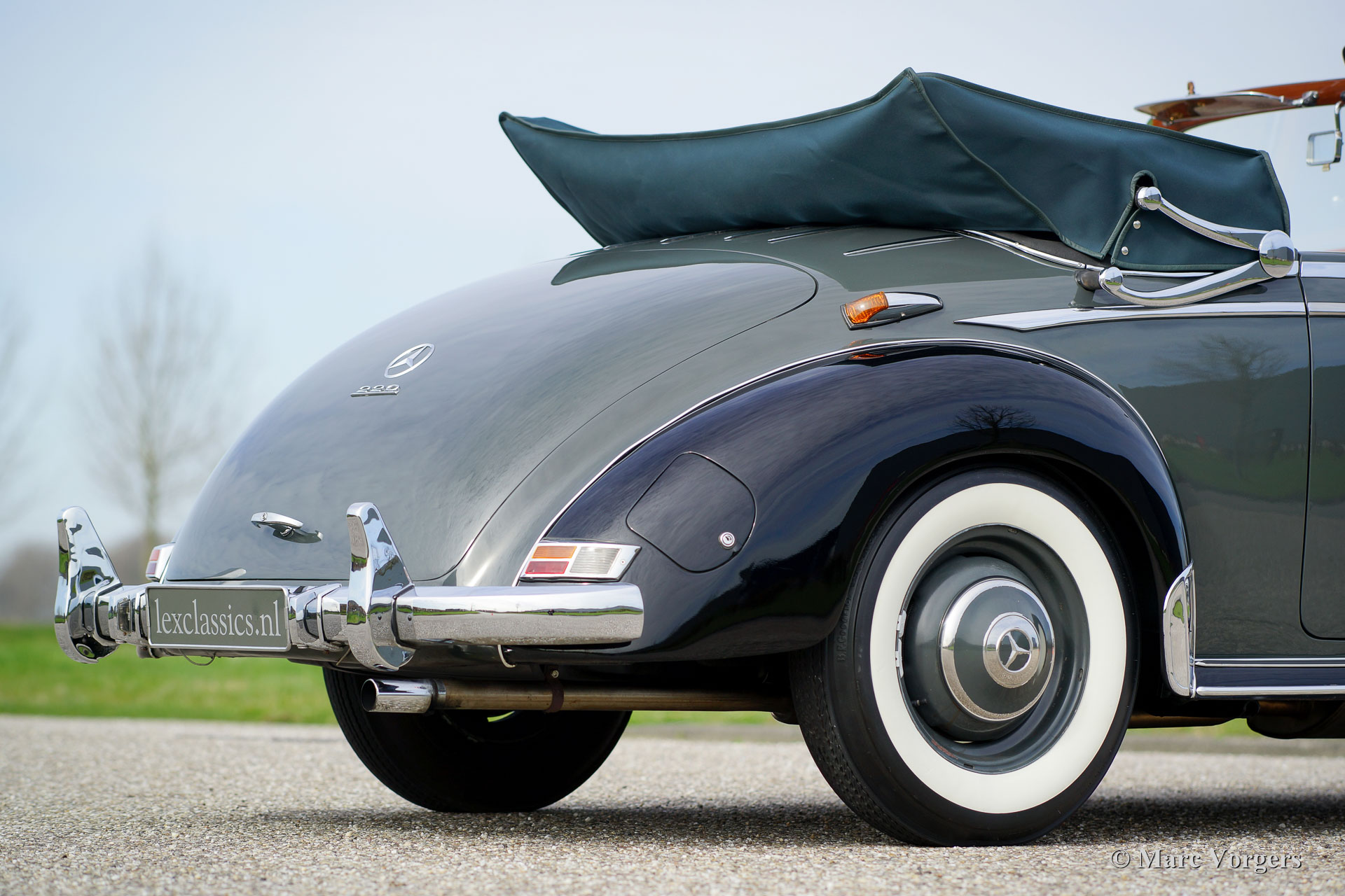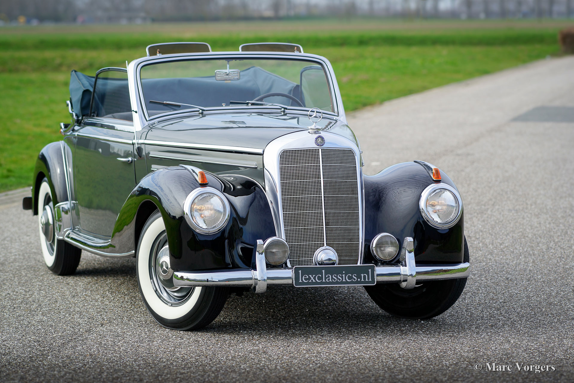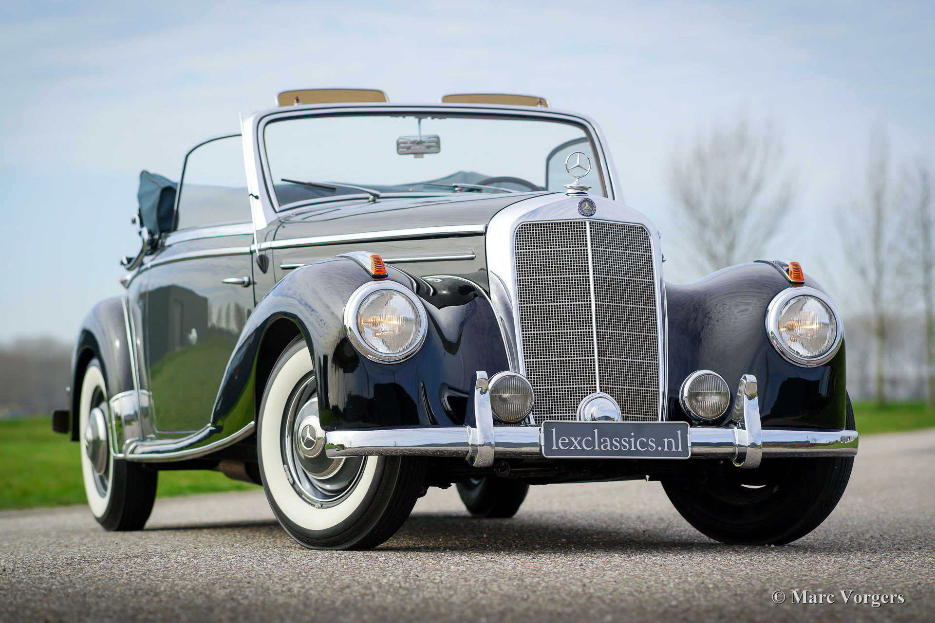 Mercedes-Benz 220a cabriolet (W187), année 1953. Couleur deux tons : Gris avec des ailes noires. Ceci combiné avec un intérieur en cuir noir, tapis noir, et un capot de mohair noir. Cette belle décapotable Mercedes-Benz est restaurée détaillée par une entreprise de restauration spécialisée. L'automobile est en superbe état et la voiture roule délicieusement. Un reportage photo de la restauration est présente. La Mercedes 220 dispose d'un moteur à six cylindres en ligne merveilleuse. Le coffre de la voiture contient un ensemble de troncs sur mesure magnifiquement conçu. Cette Mercedes 220a est un exemple superbe.