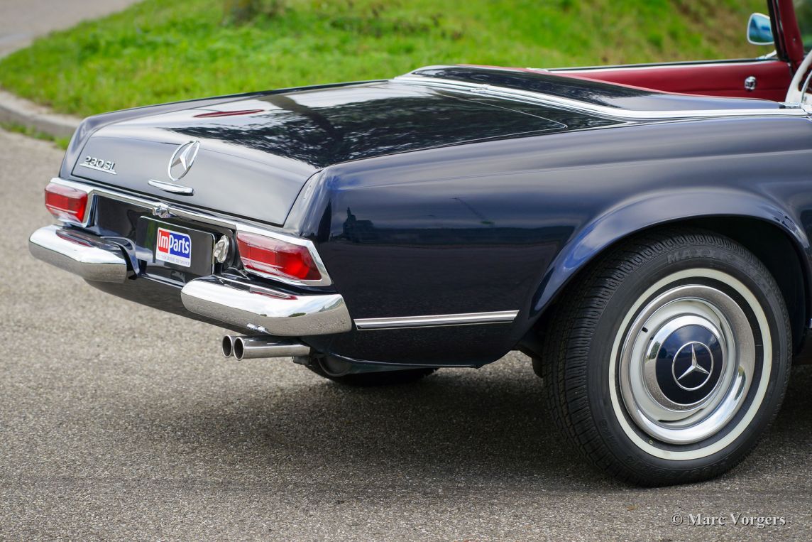 Mercedes-Benz 230 SL « Pagode », année 1966. Couleur bleu foncé métallisé associée à un intérieur en cuir rouge foncé et à un tapis rouge. Capot en mohair bleu foncé. Cette magnifique Mercedes-Benz 230 SL fut vendue neuve aux États-Unis. L'automobile fut largement restaurée et récemment le moteur fut révisé. La facture de la révision du moteur est présente. Cette Mercedes-Benz 230 SL est en très bon à excellent état et la voiture roule parfaitement. La voiture montre tous les détails d'origine comme le magnifique volant blanc et les roues à disques en acier avec enjoliveurs chromés. Sous le capot, tout est superbe et toutes les soudures par points d'origine sont toujours visibles comme il se doit. Le moteur six cylindres en ligne à injection d’essence délivre 170 ch et la boîte de vitesses automatique à 4 rapports passe « sur place ». La 230 SL a été construite de 1963 à 1967, 19.000 voitures de ce type furent construites. La voiture est équipée d'une radio Blaupunkt d'époque. Ceci est un très bel exemple !