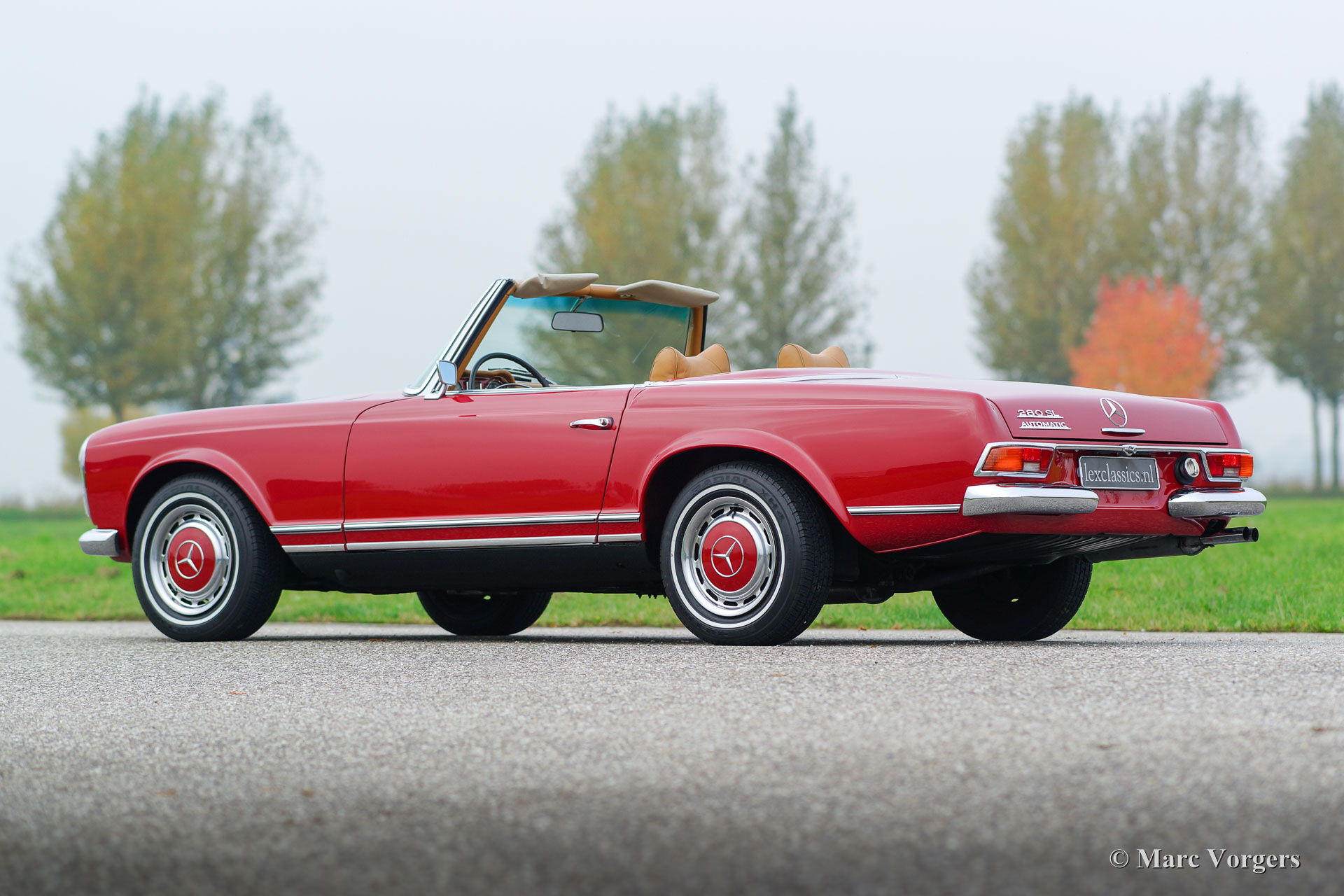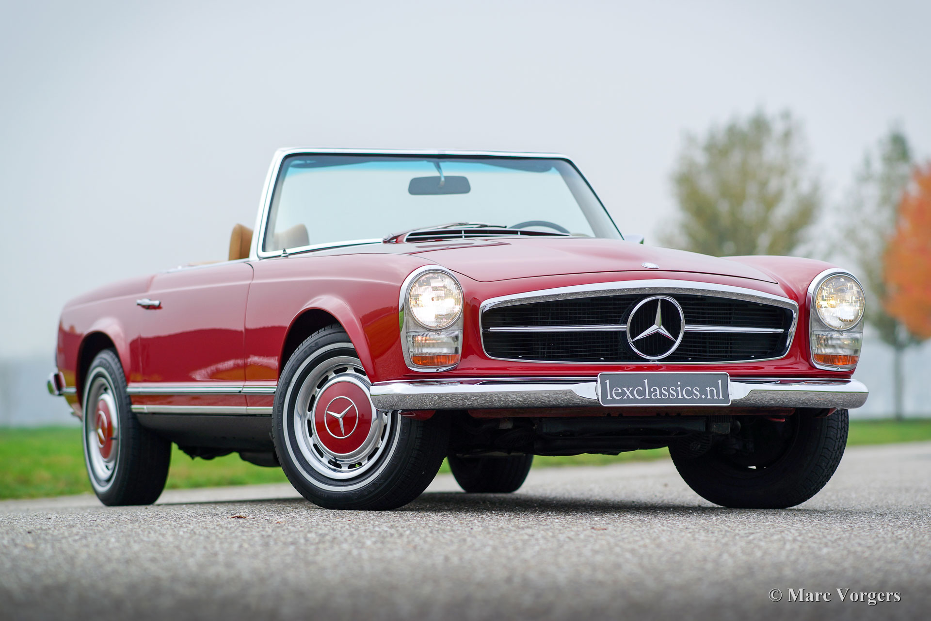 Mercedes-Benz 280 SL 'Pagode', année 1968. Couleur rouge avec un intérieur en cuir beige et tapis beige. Capot mohair brun. Cette belle Mercedes 280 SL a été restaurée dans le passé, l'automobile est en très bon état et la voiture roule parfaitement ! Vous ne trouverez que quelques traces d'utilisation à l'intérieur. La voiture dispose d'une boîte de vitesses automatique à quatre vitesses qui se déplace parfaitement et gère parfaitement les 170 ch générés par le moteur en ligne à six cylindres lisse. La voiture est équipée d'une belle radio Becker Mexico.