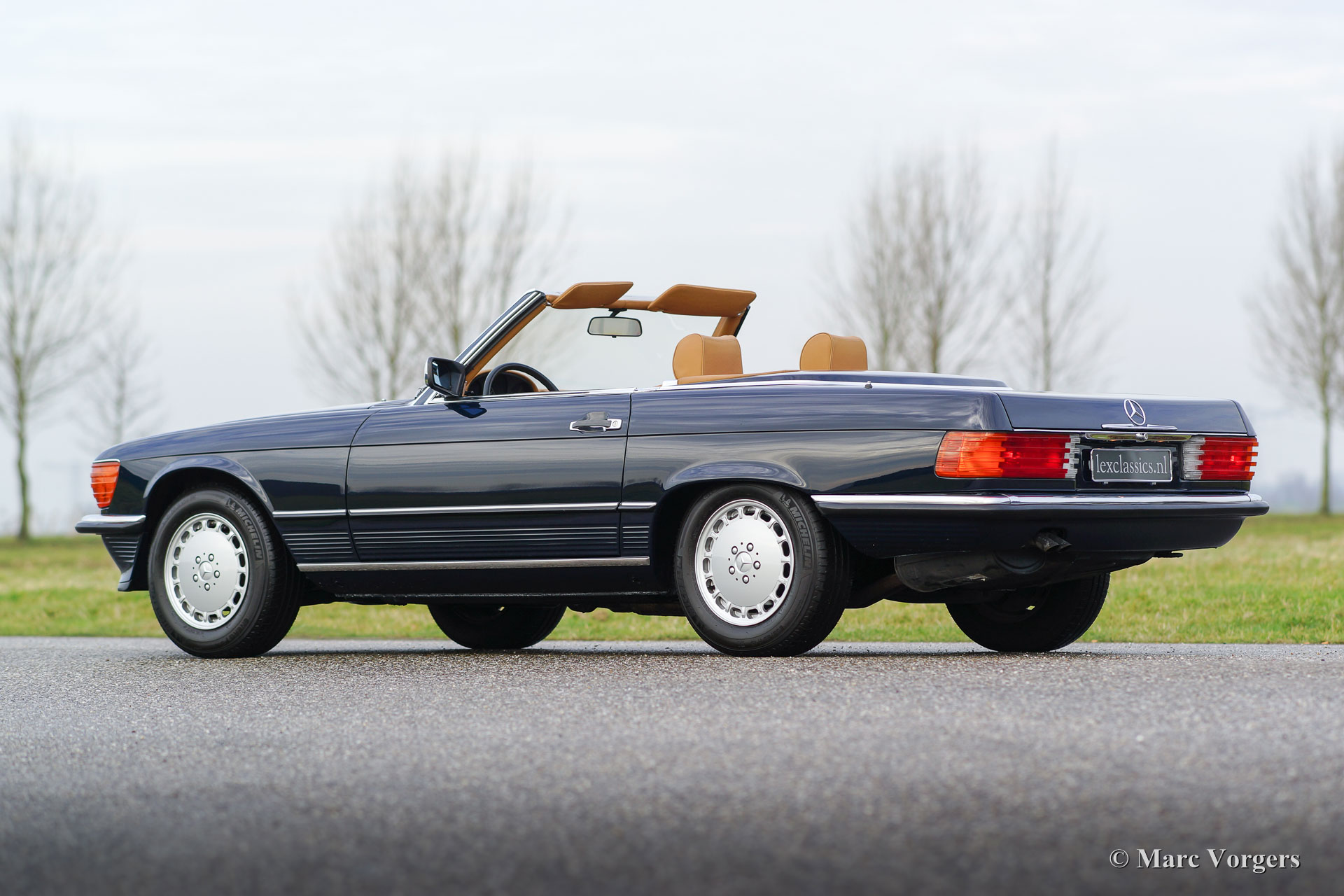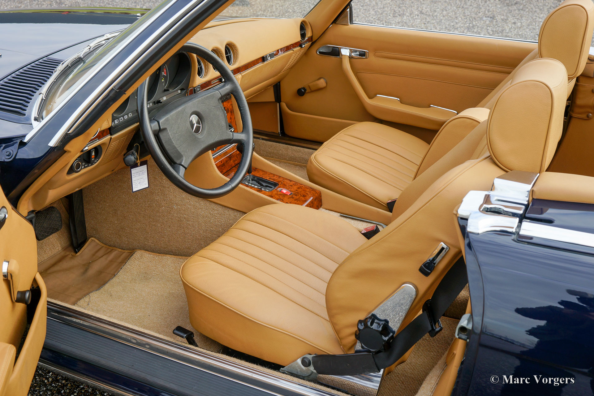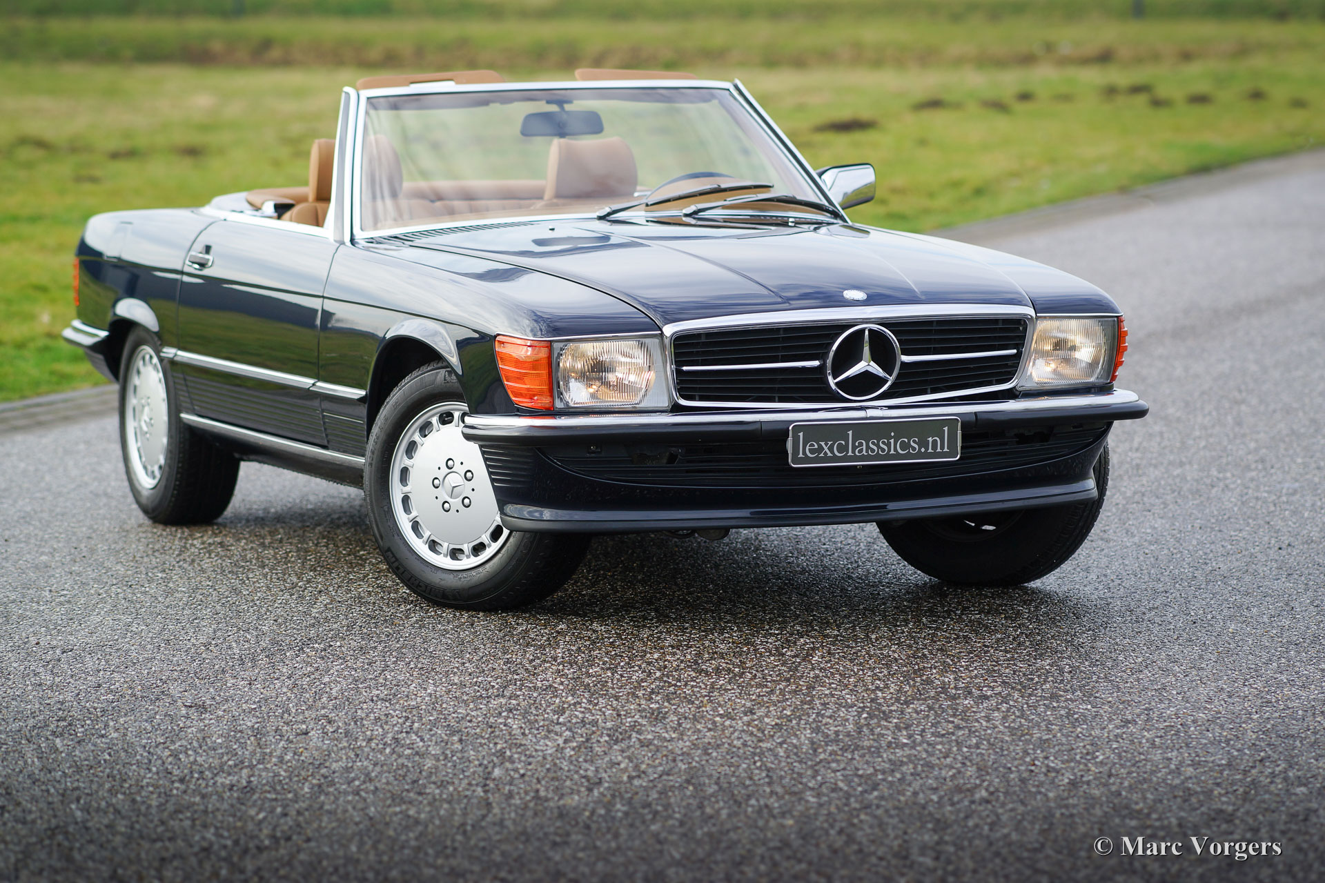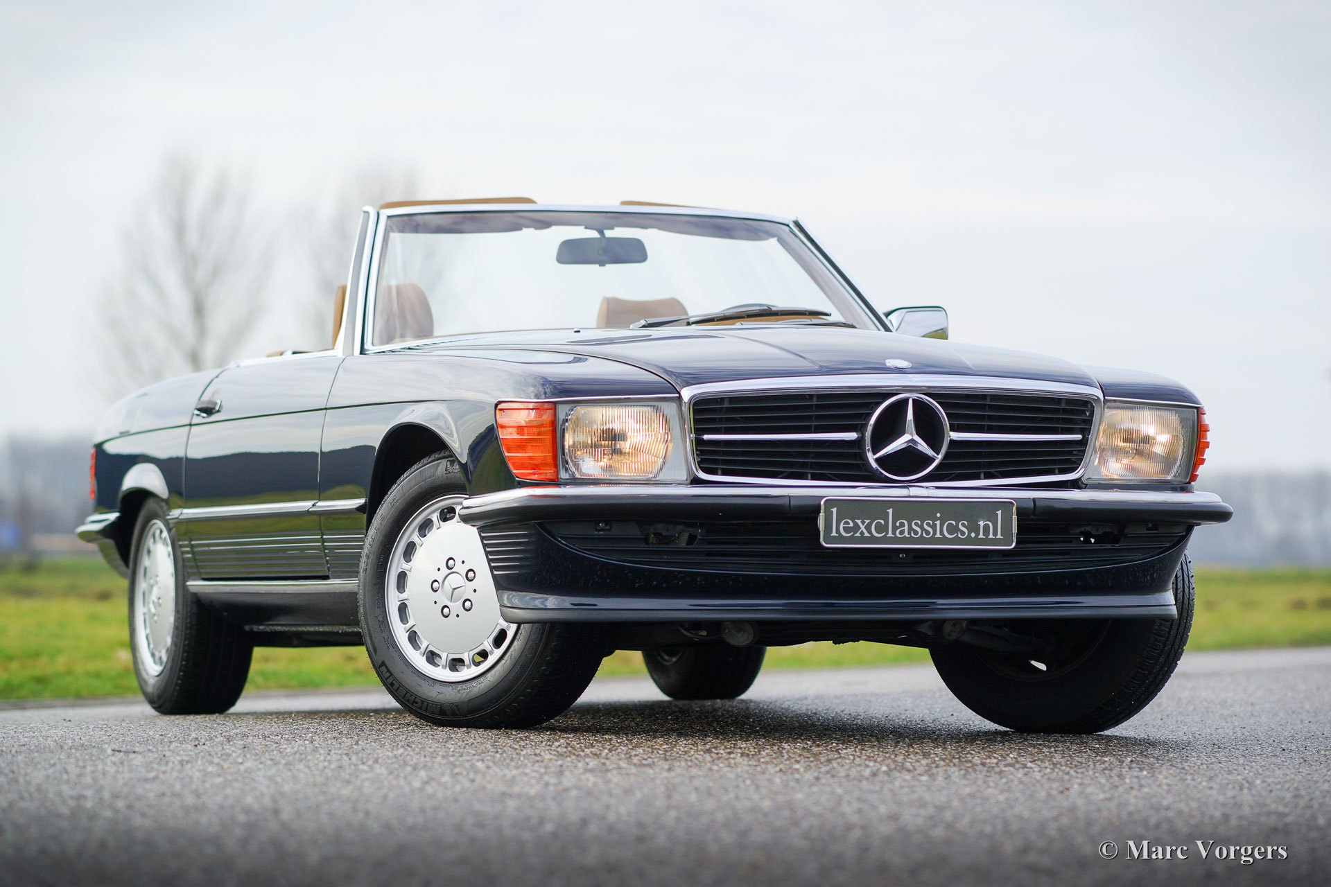 Mercedes-Benz 300 SL (type R107), année 1986. Couleur bleu foncé avec un intérieur en cuir de couleur cognac. Cette Mercedes 300 SL fantastique a été abondamment mise à niveau en 2014 par un spécialiste Mercedes. La voiture a reçu une nouvelle peinture parfaite, un nouvel intérieur et un nouveau soft-top. En outre, la mécanique et l'électricité ont été vérifiées et mises à jour. Le travail a été exécuté magnifiquement ; Ce 300 SL est en superbe état et la voiture roule parfaitement. Des photos des travaux réalisés sont présentes. C'est un exemple européen d'origine en parfait état !