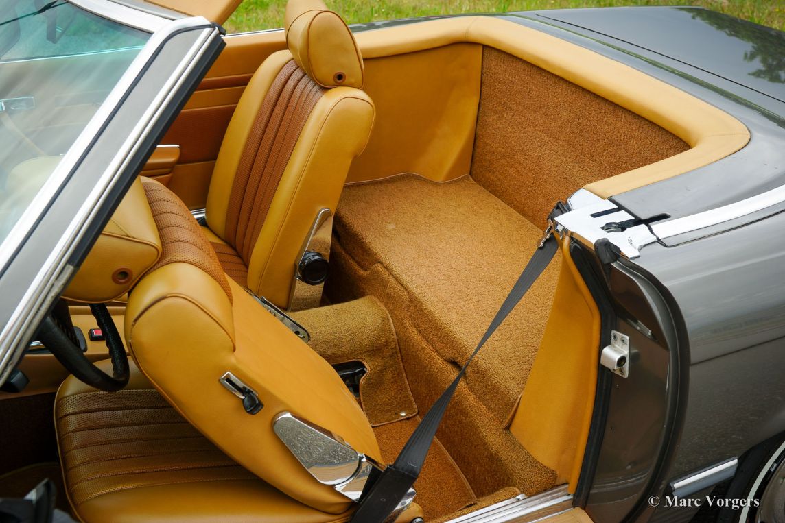 Mercedes-Benz 350 SL, année 1972. Couleur gris foncé métallisé combinée à un intérieur marron cognac. Capote en mohair noir et hard-top d'origine couleur carrosserie. Cette fantastique Mercedes 350 SL de la gamme de modèles R107 a été vendue neuve en Californie aux États-Unis. L'automobile fut importée aux Pays-Bas en 2020. La R107 est une Mercedes "evergreen", le modèle a été construit de 1971 à 1989. La 350 SL fut le premier modèle de la série de modèles. La 350 SL est équipée d'un fantastique moteur V8 couplé à une boîte de vitesses automatique. Avec un couple de 286 Nm et 220 ch, la 350 SL est une voiture de luxe rapide à toit ouvert. Avec le hard top installé, la 380 SL se transforme en un superbe coupé. Seulement 15 000 voitures de ce modèle 350 SL furent construites. Cet exemple est dans un excellent état ne montrant que de légers signes d'utilisation. La capote et le toit rigide sont également en excellent état. La voiture est équipée d'une direction assistée, de la climatisation et d'une radio stéréo Alpine avec lecteur de cassettes. Cette magnifique Mercedes 350 SL est livrée complète avec les livrets d'origine, l'ensemble d'outils et le cric d’origine. Cette 350 SL roule et sonne parfaitement, un exemple très désirable !