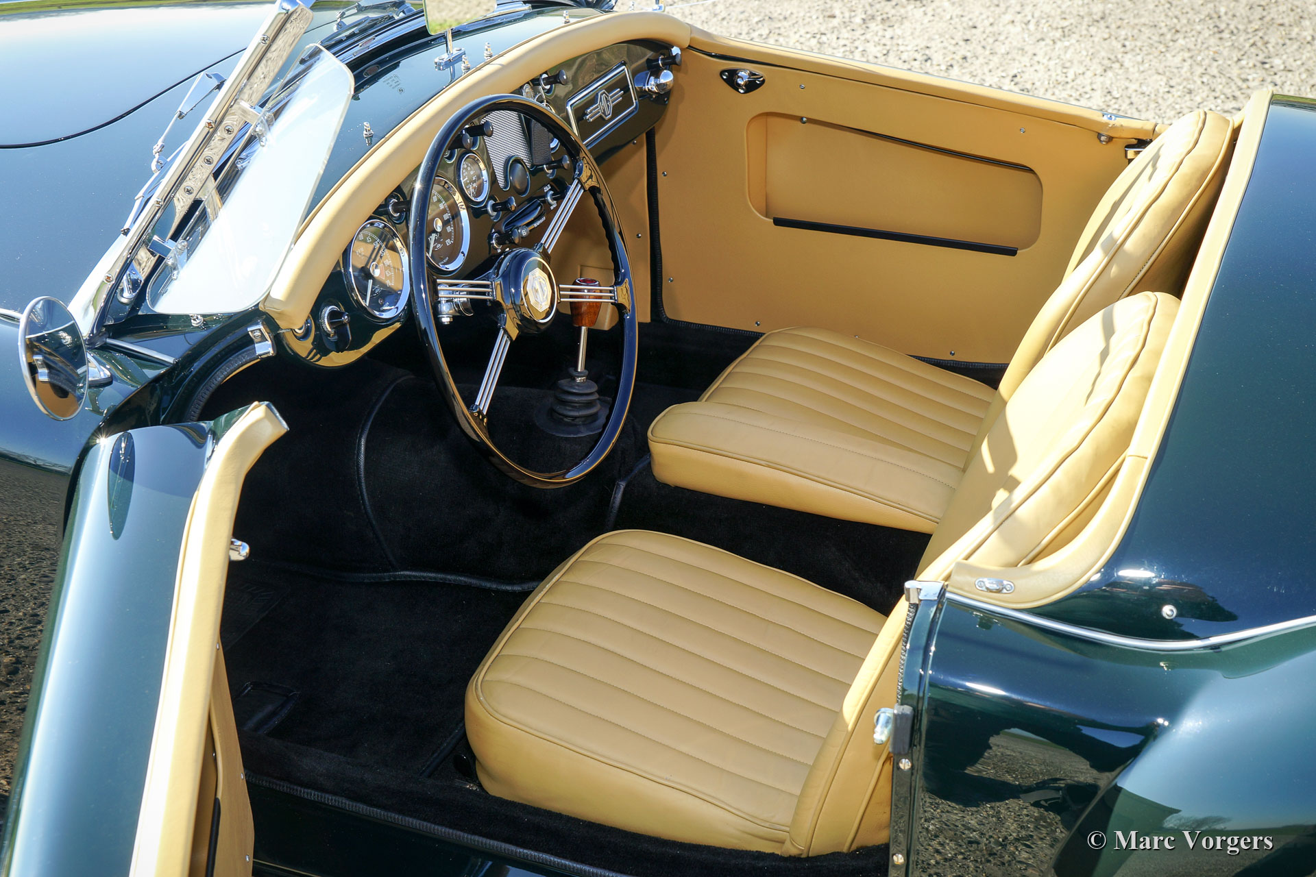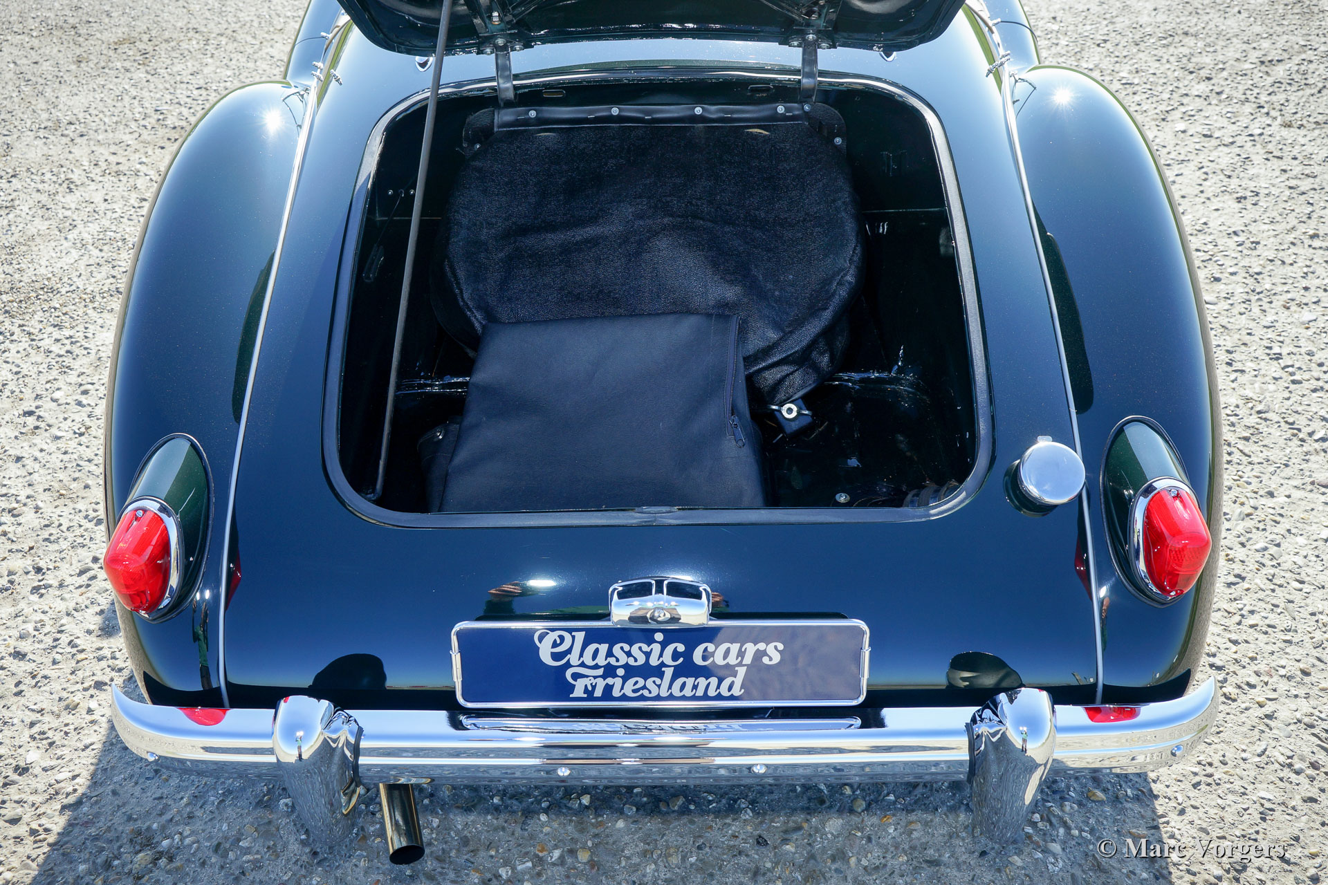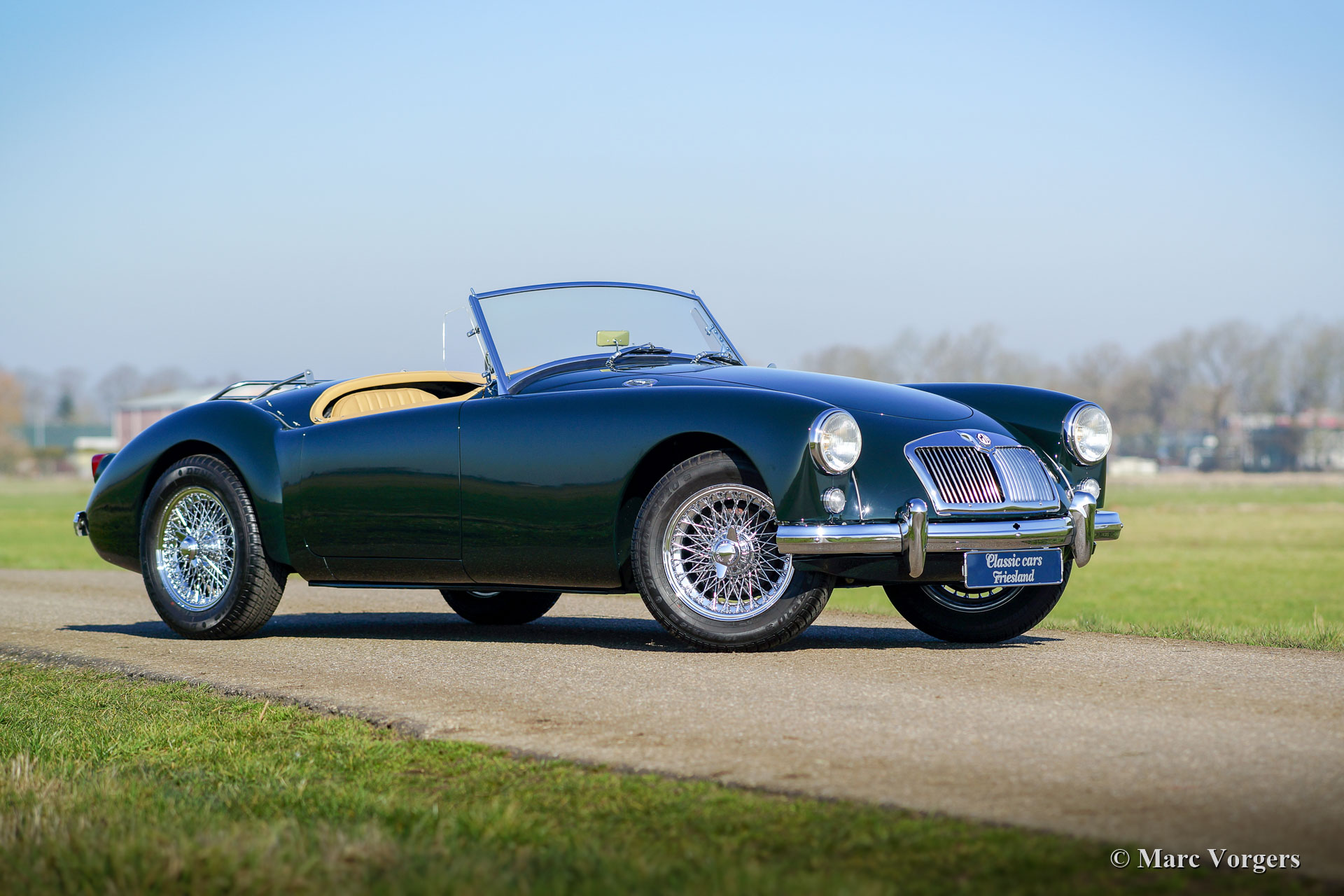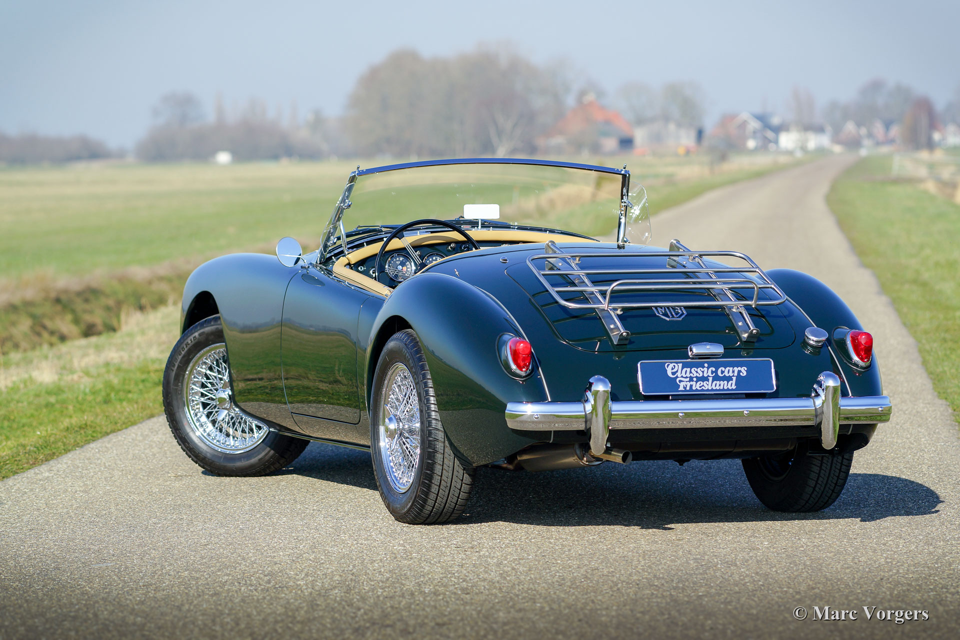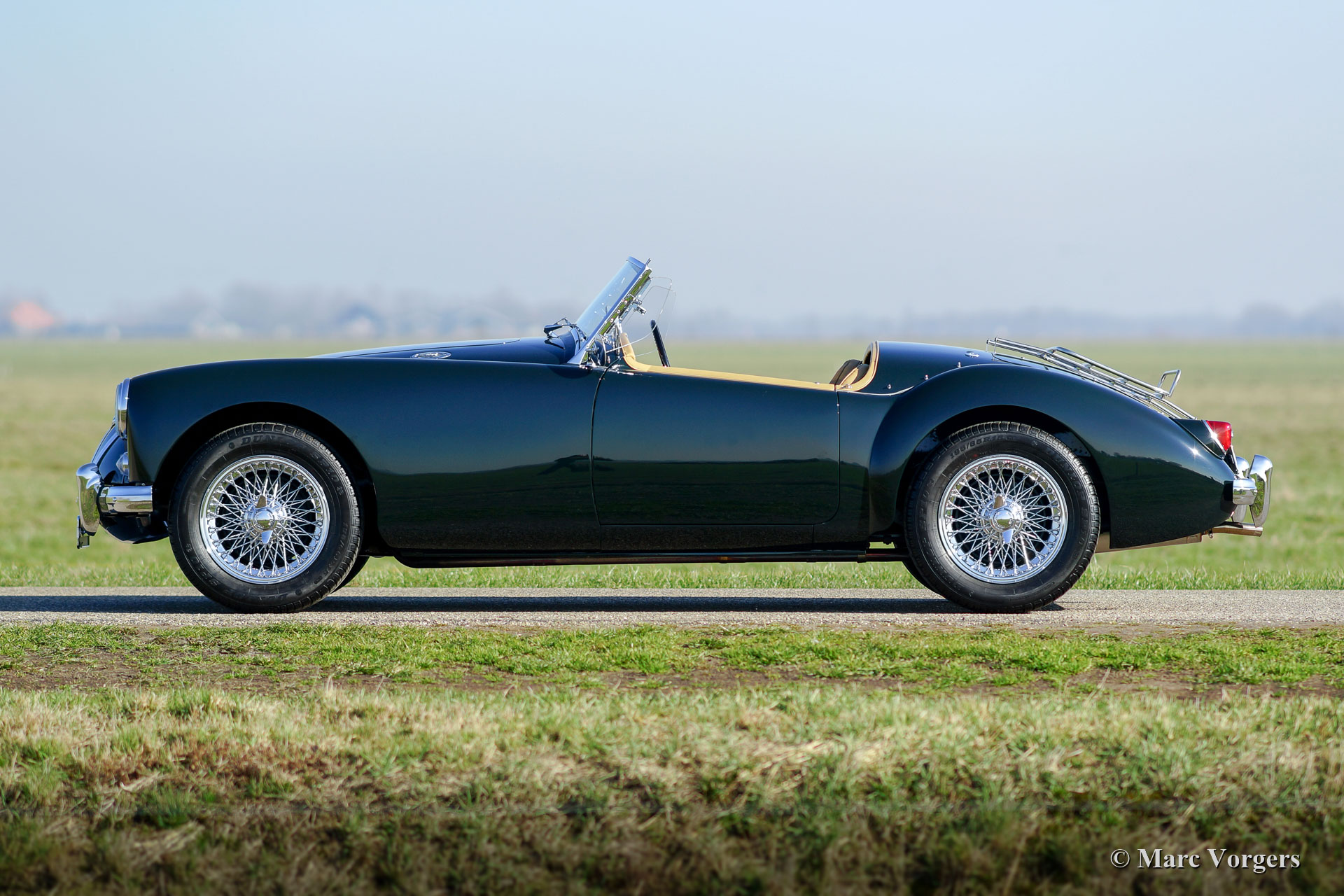 MG MGA 1500 roadster, année 1956. Couleur British Racing Green combinée à un intérieur en cuir beige et à un tapis noir. Capote noire et un couvercle de la hotte noir. Ce merveilleux MGA roadster fut largement restauré par une entreprise de restauration néerlandaise (Classic Cars Venlo). Un reportage photo de la restauration est présent. La voiture est en superbe état (concours). Le corps fut restauré à partir du métal nu. La carrosserie présente des lignes nettes, un ajustement parfait des panneaux et une peinture fantastique ! Le moteur, la boîte de vitesses, les freins, la suspension et les jauges du tableau de bord furent révisés et un nouveau faisceau de câbles fut installé. La voiture était complétée par les options suivantes : roues à rayons chromées, porte-bagages chromé et un système d'échappement en acier inoxydable. Un roadster MGA délicieux et très désirable !