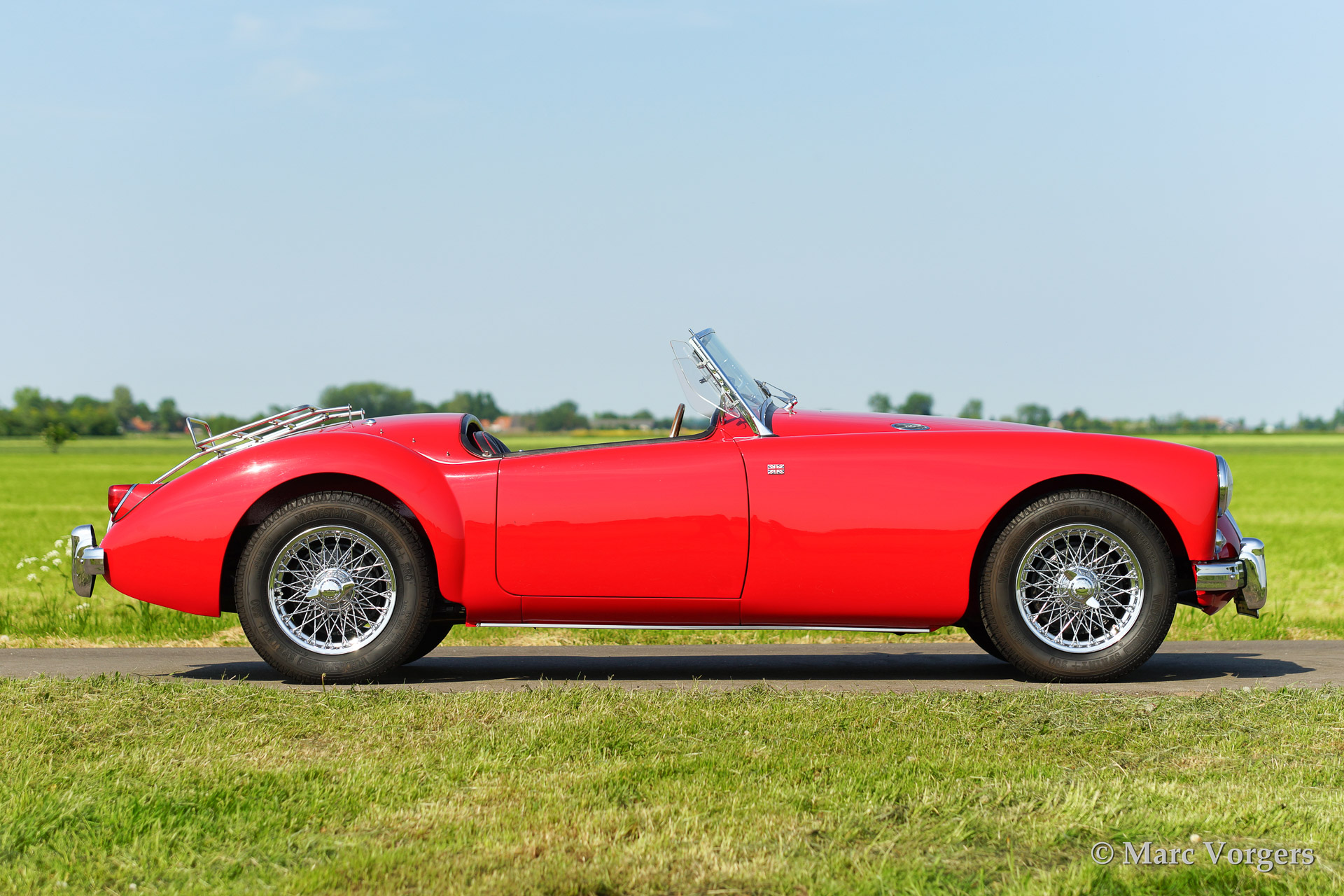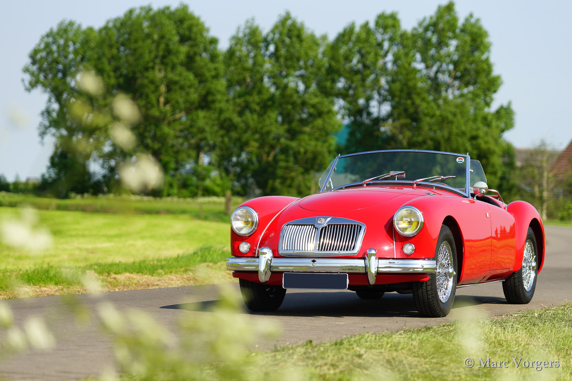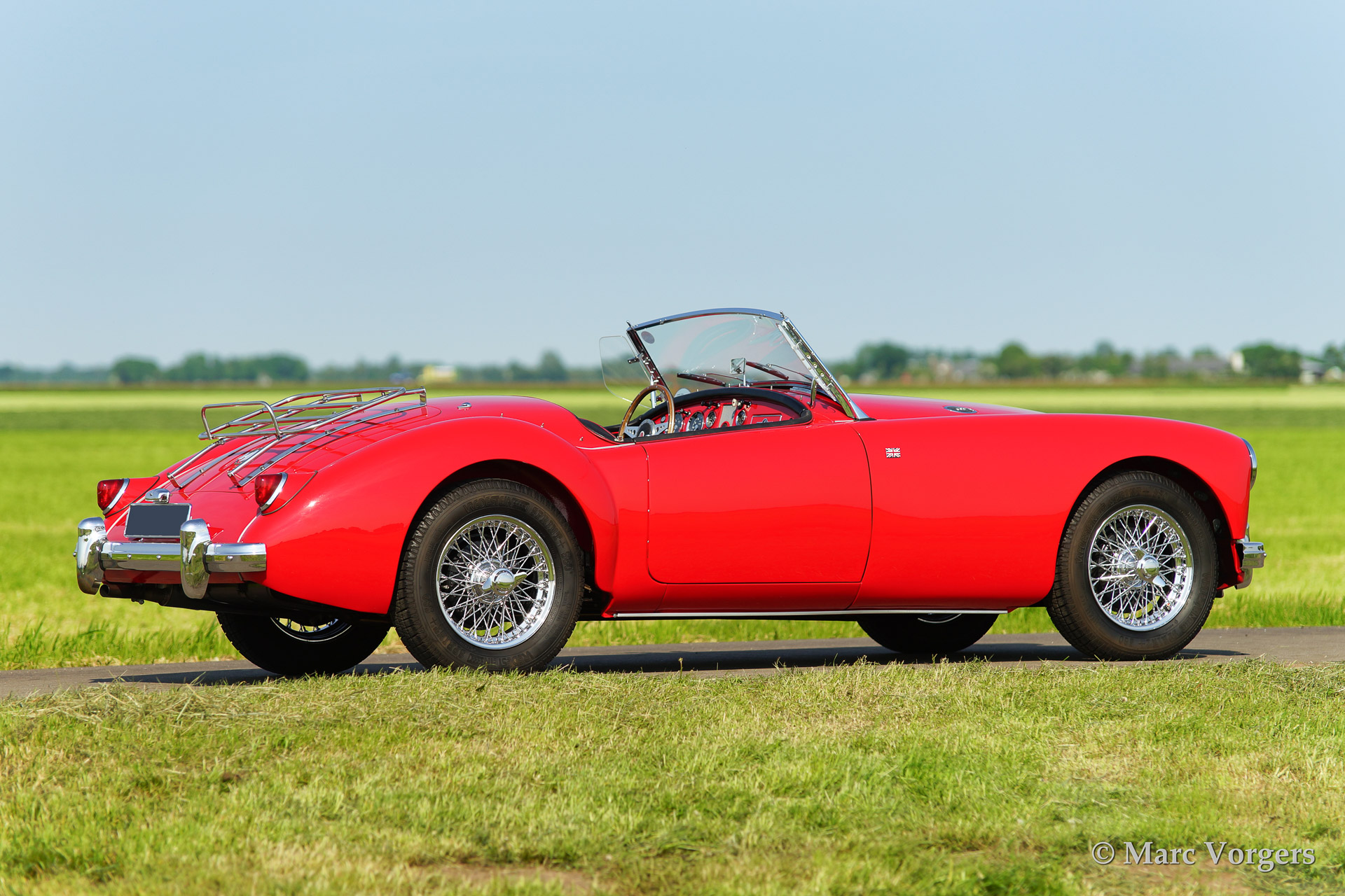 MG MGA 1500 roadster, year 1958. Colour red with a black leather interior piped red. Black mohair soft top. This beautiful MGA roadster was extensively body off restored and the chassis was powder coated. The car features chrome wire wheels, a Motolita steering wheel with wooden rim and aluminium side screens.