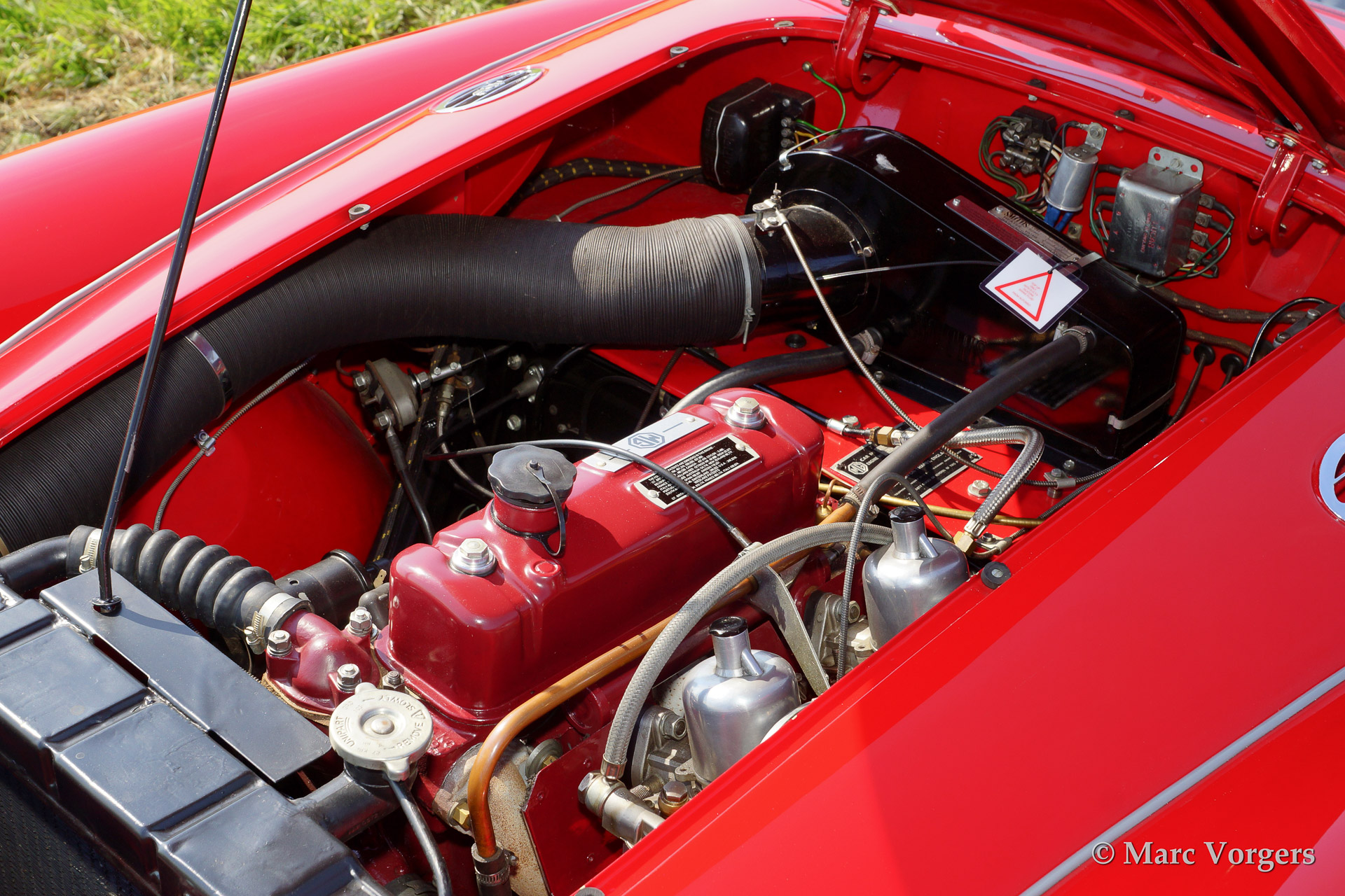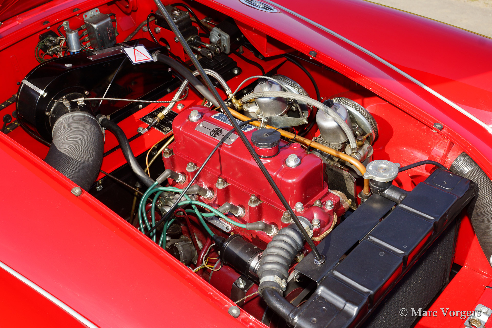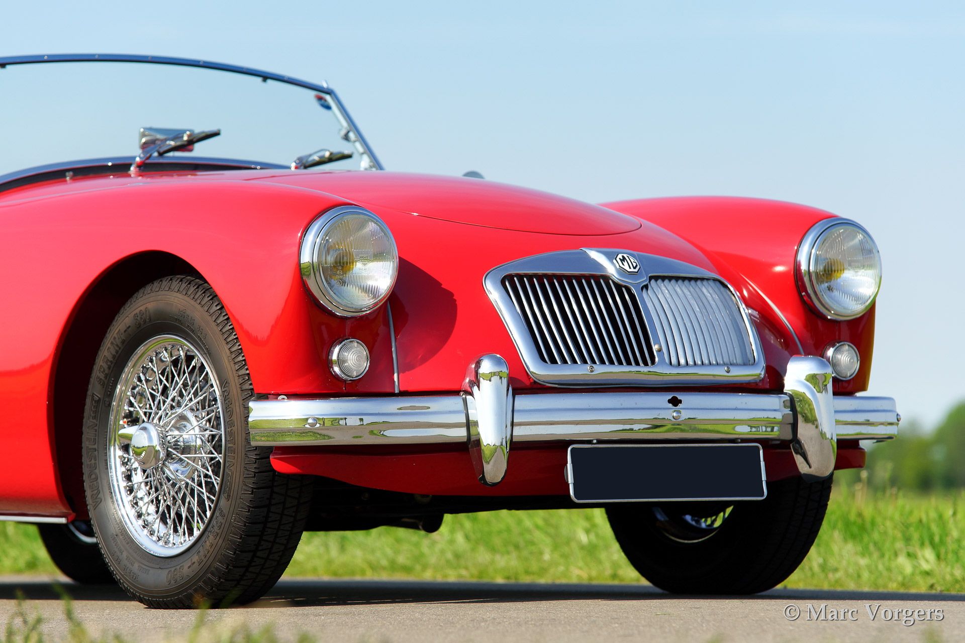 MG MGA 1500 roadster, year 1958. Colour red with a black leather interior piped red. Black mohair soft top. This beautiful MGA roadster was extensively body off restored and the chassis was powder coated. The car features chrome wire wheels, a Motolita steering wheel with wooden rim and aluminium side screens.