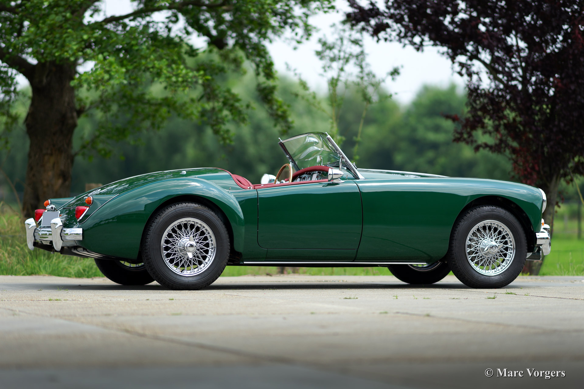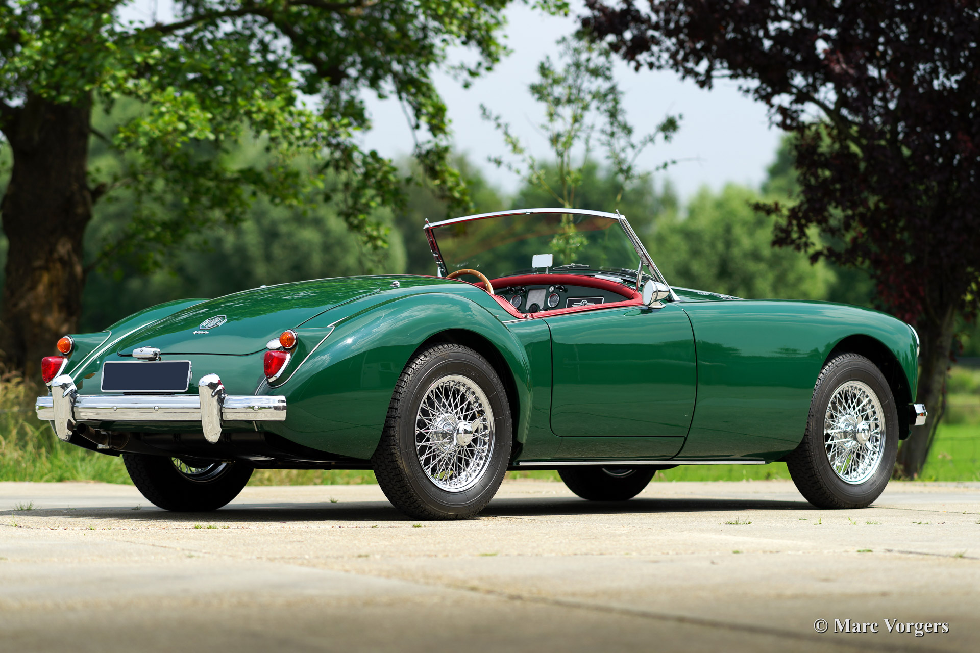 MG MGA 1600 roadster, year 1959. Colour British Racing Green with a red leather interior. Black soft top. This beautiful MG MGA was extensively and perfectly restored a few years ago, the automobile is in concourse condition! The car sports chrome wire wheels, two bullet style door mirrors, a MotoLita sports steering wheel with wooden rim and an aluminium rocker cover.