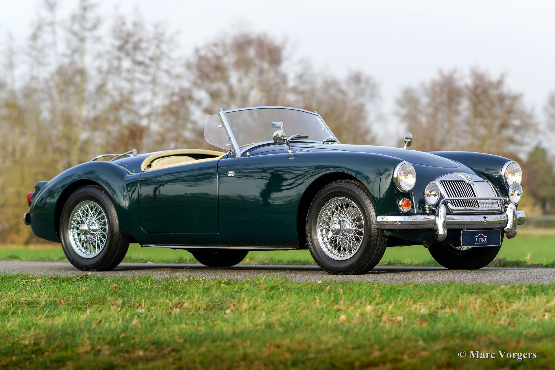 MG MGA 1600 roadster, année 1960. Couleur British Racing Green avec un intérieur en cuir beige. Tapis beige et tapis de protection vert. Capot et couvercle de tonneau de couleur cognac. Numéro de châssis GHNL / 7100X, numéro de moteur 16GA-U 1732X. Ce magnifique MG MGA 1600 roadster fut vendue neuve aux États-Unis et la voiture fut importée aux Pays-Bas en 2003. Dans le passé, la voiture fut restaurée détaillée par un spécialiste MG aux Pays-Bas. Depuis 2003, la voiture n'a connu qu'un seul propriétaire néerlandais. La voiture est en très bon à excellent état et la carrosserie montre un ajustement des panneaux parfait. Cette MGA roule et lecteur délicieusement ! Ce superbe MGA roadster est équipé de roues chromées avec des écrous ‘knock-off’ chromée, d'un volant Moto-Lita avec jante en bois, d'une barre d'insigne (‘badge-bar’) chromée avec deux spots Lucas et d'un porte-bagages chromé. Ce délicieux MGA 1600 roadster est prêt à profiter pleinement !