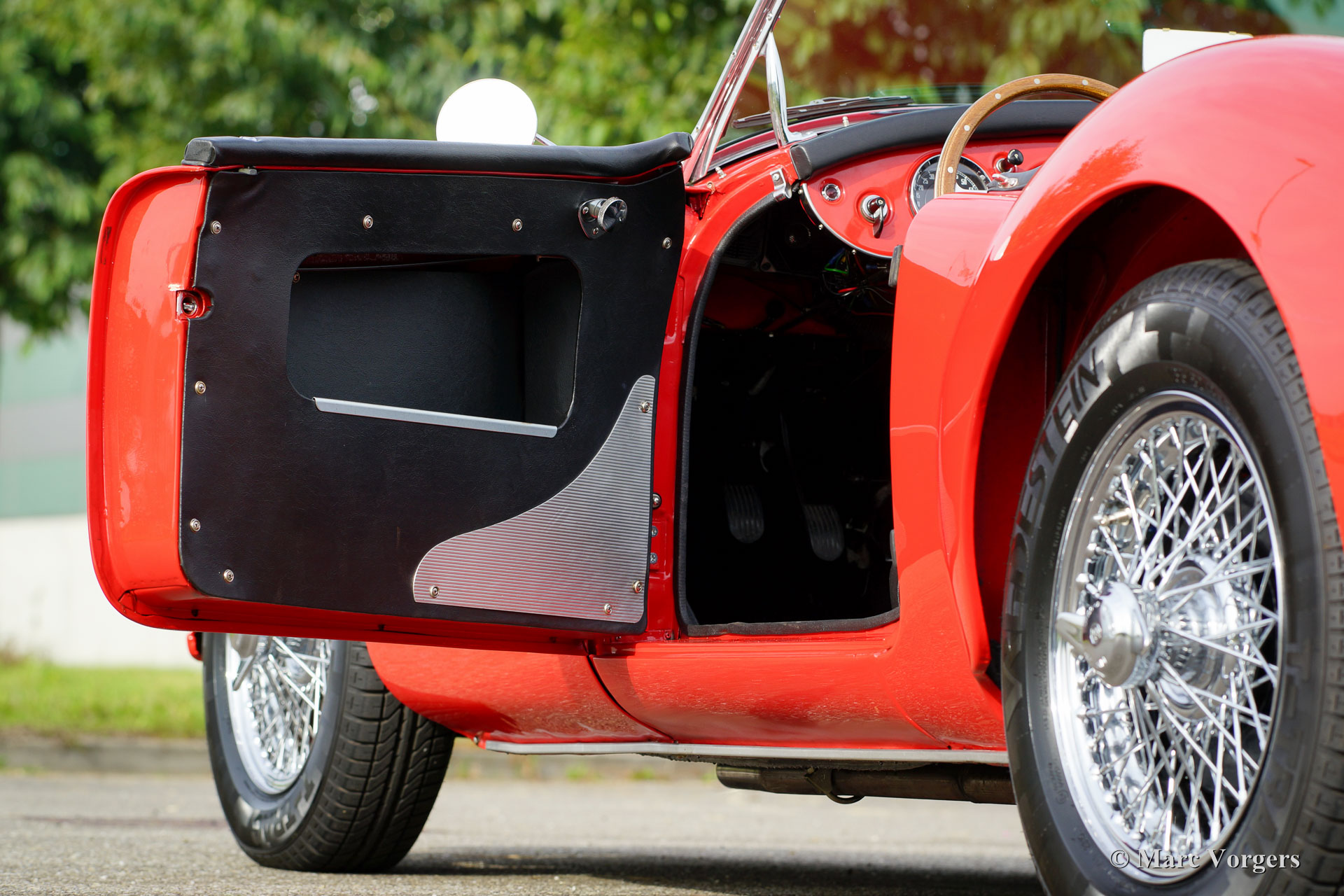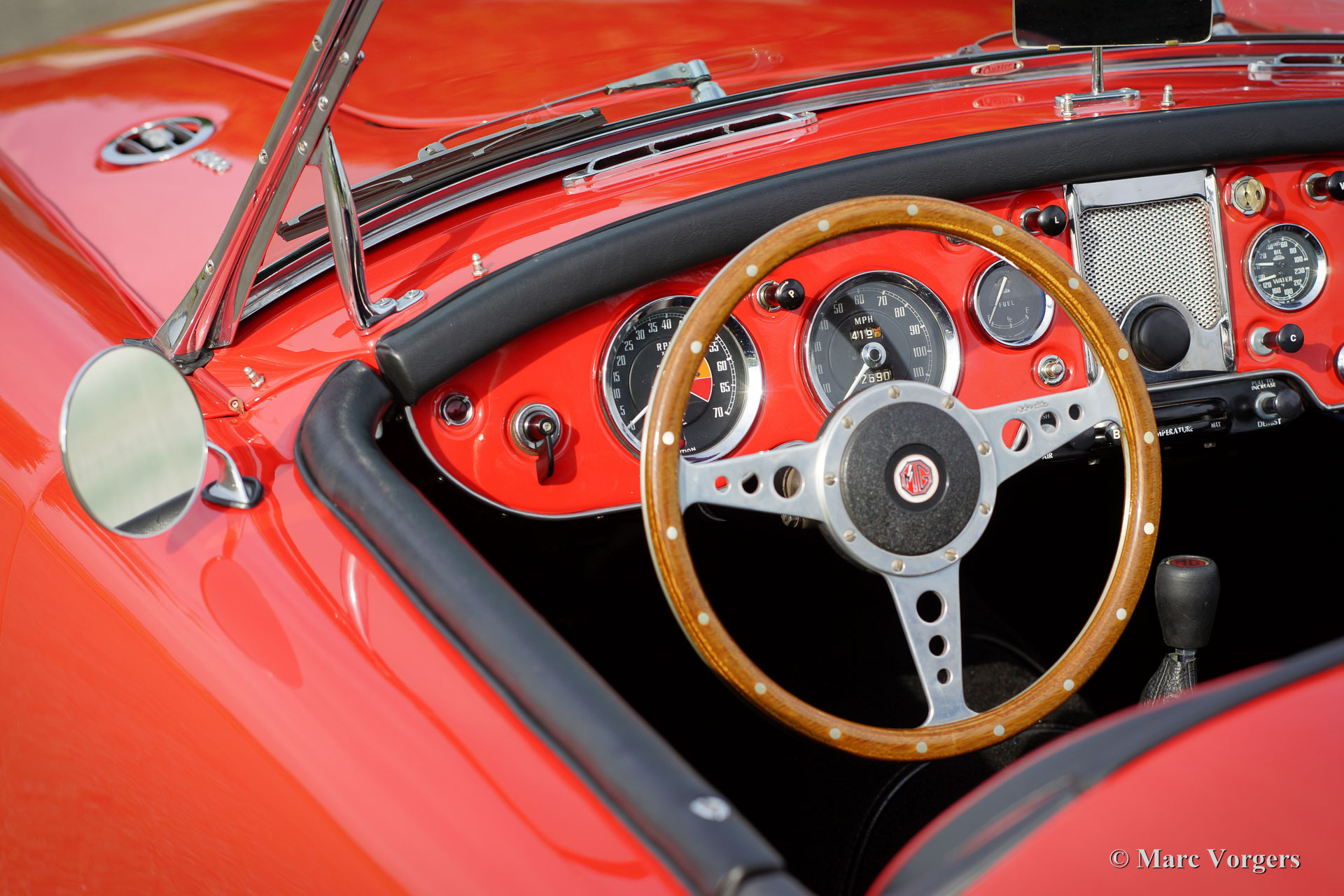 MG MGA 1600 roadster, année 1961. Couleur rouge avec un intérieur en cuir noir garni de passepoil rouge. Moquette noire et capote mohair noire. Cette fantastique MGA 1600 a été restauré ‘body off’ récemment. La voiture est en etat superbe, mieux que nouvelle condition! Un reportage photo de la restauration est présent tout comme un fichier de documentation. La voiture roule mieux que tout MGA régulière 1,600 parce que la voiture est équipée d'un moteur de 1800 cc MGB plus puissant et une boîte de vitesses manuelle 5 vitesses Ford (entièrement synchronisée). En outre, cette beauté propose roues à rayons chromées, un volant sport avec la jante en bois, les pneus Vredestein Classic, un porte-bagages en acier inoxydable, un système d'échappement en acier inoxydable, un ‘badge bar’, phares antibrouillard à l'avant, les écrans secondaires mohair, allumage électronique 123, générateur de courant alternatif, disque freins à avant etcetera. Un MGA roadster magnifique et très complet!