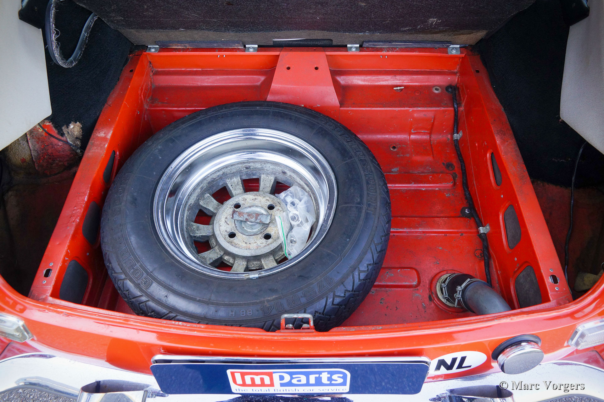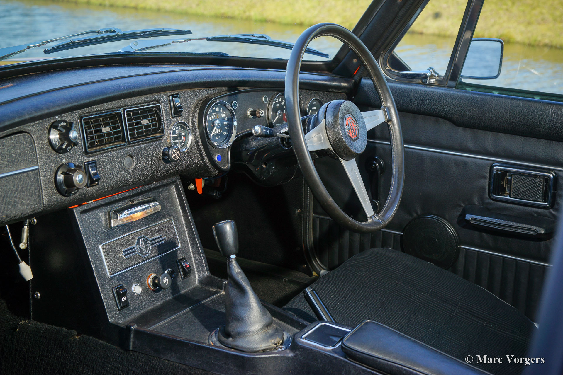 The MG B was the first MG (Morris Garage) built of unitary construction bodywork. The MG B GT V8 was built between 1973 and 1976. In 1970, Ken Costello, a garage owner, installed a Rover 3500 V8 engine in an MG B. MG took over the idea, though engine capacity of the Rover V8 in the MG did not produce 180 hp. at 5500 rpm. but 140 hp. at 5000 rpm. Influenced by the American rules on safety, later models were equipped with synthetic rubber bumpers. Many of the later, built from 1974 until 1976, "rubber-bumper" models are now converted into "chrome-bumper" models. The car shown in these pictures is a original chrome bumper car fitted with the original MG B GT V8 rims.